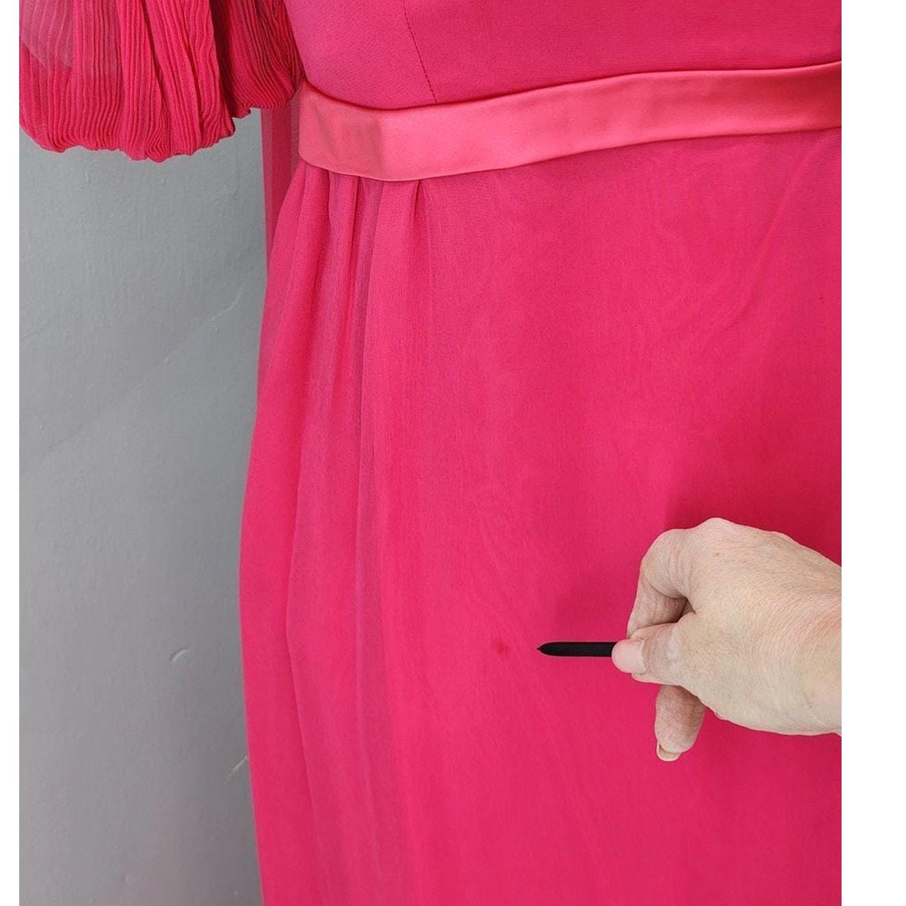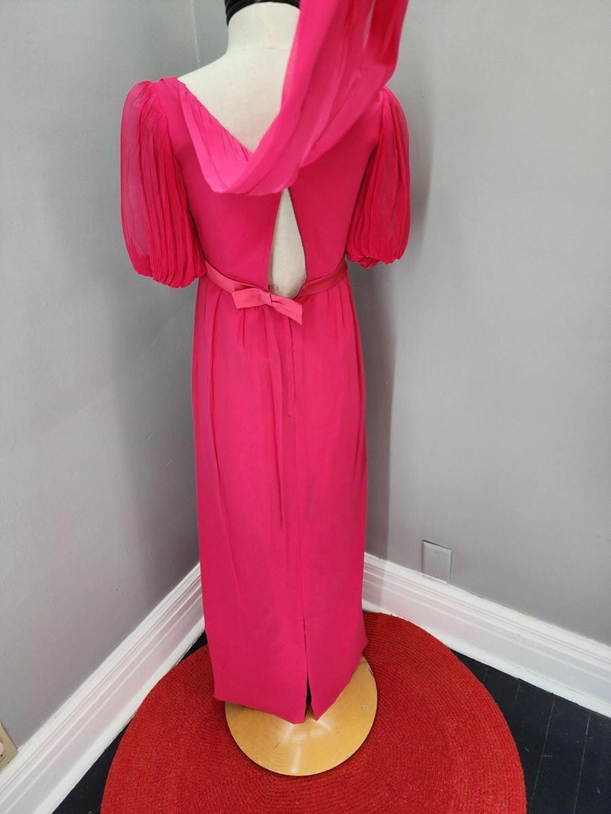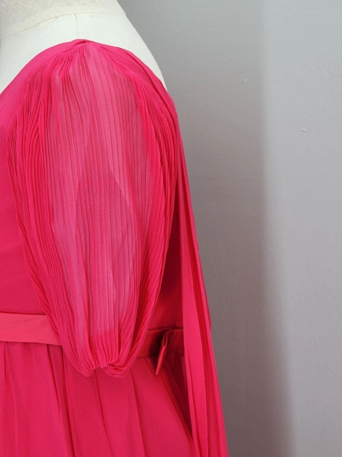 This sweet gown has accordion pleated, puffy chiffon sleeves, chiffon watteau train that hangs from the shoulders, 16" metal zipper in back.