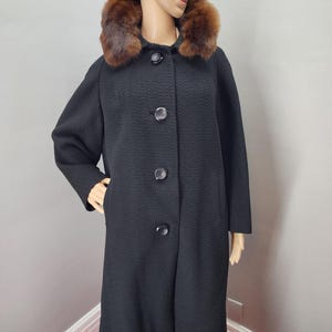 Classic cashmere swing coat with amber colored fur collar. Huge buttons, 3/4 sleeves and front hip slit pockets and silky satin lining. A true classic.