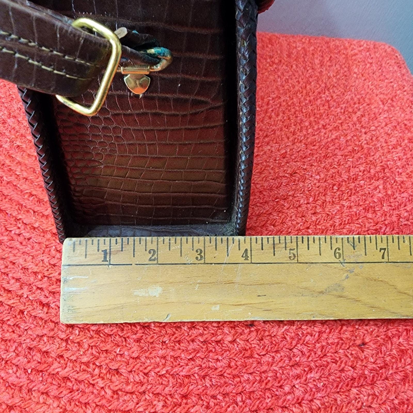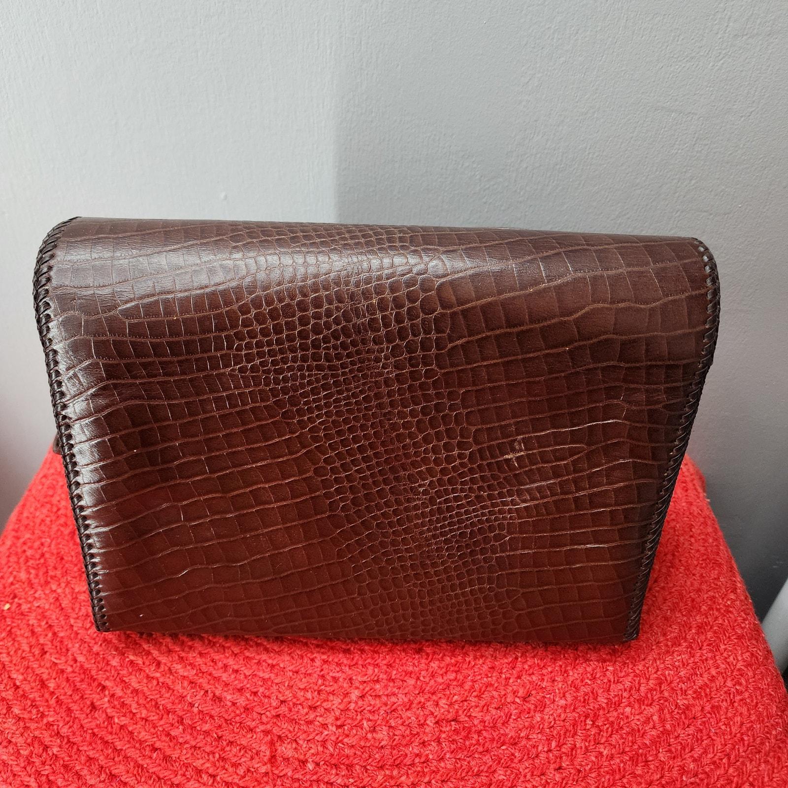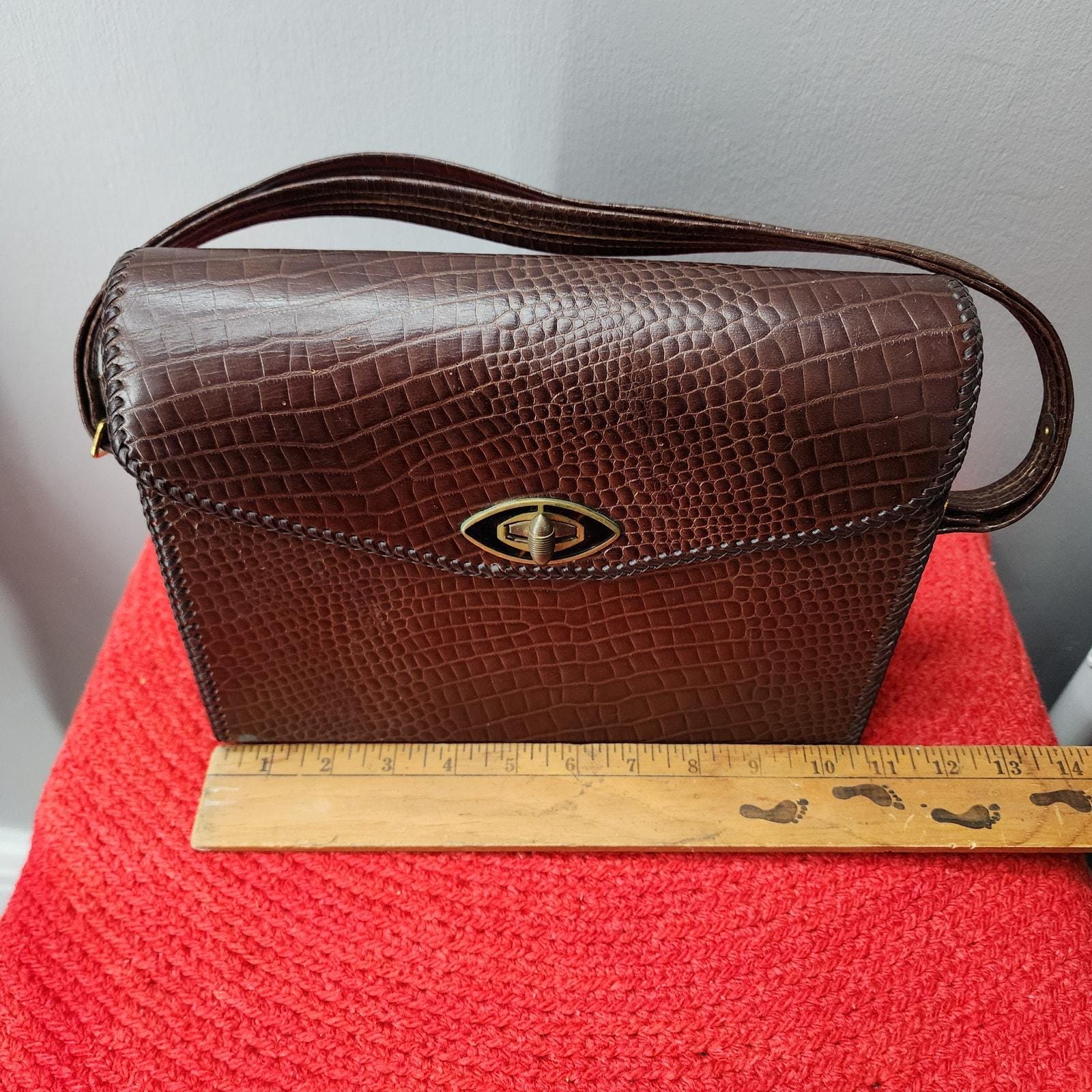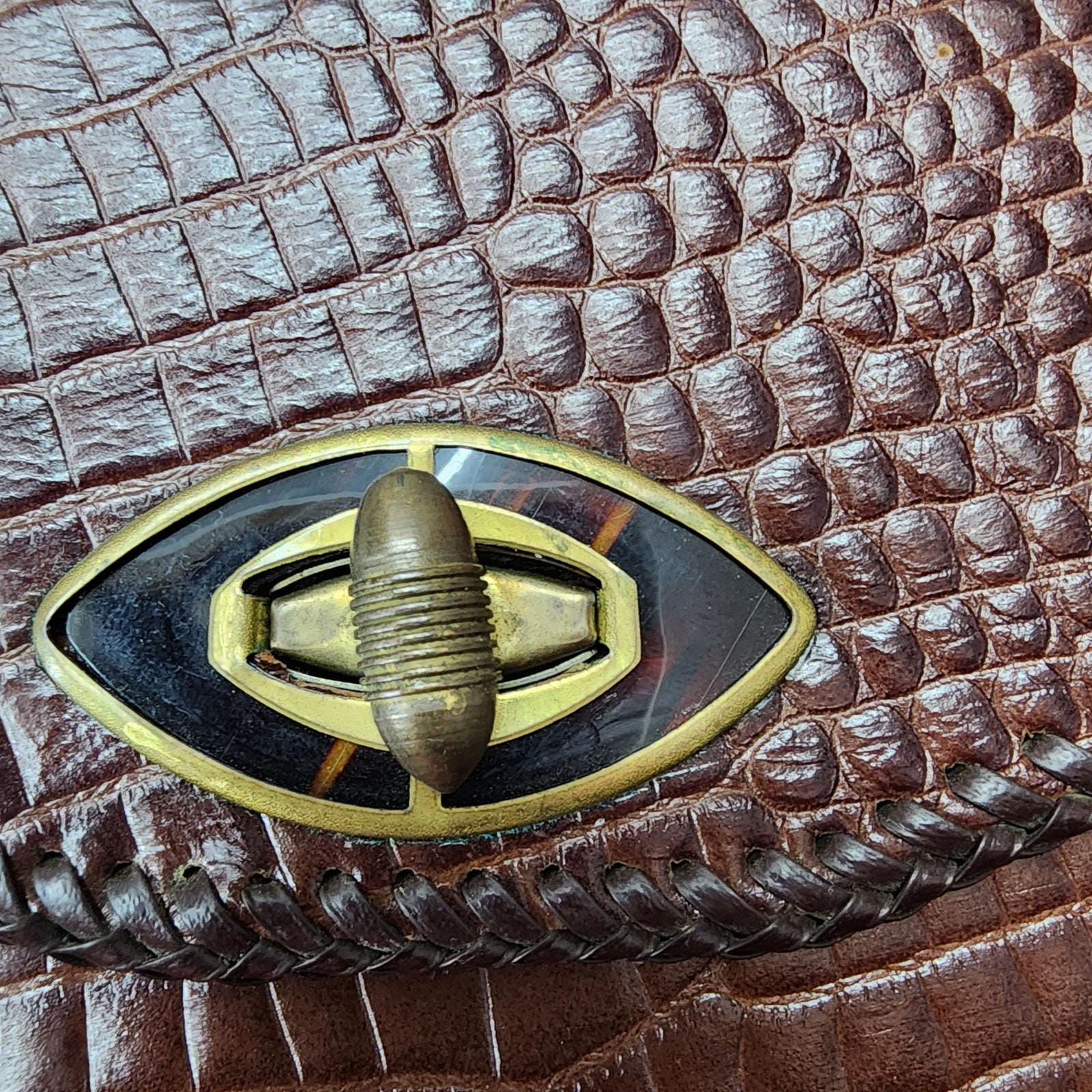 Super Chic, unbranded, vinyl faux croc design in a deep brown color, vinyl interior for easy cleaning, adjustable strap for shoulder or hand carry and a large barrel twist toggle closure with Lucite detail. Brass hardware.