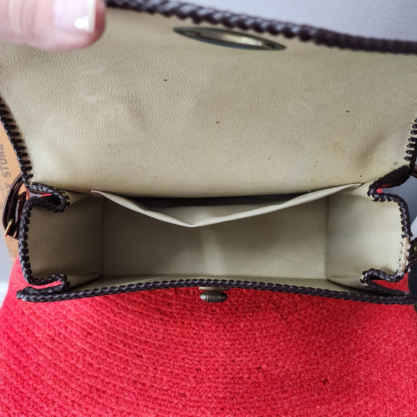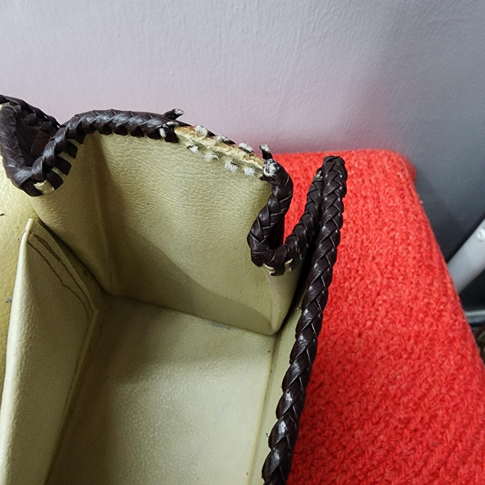 Condition: Good vintage condition with small rub area on bottom corner (as pictured), and a bit of trim that is damaged on the interior side (as pictured).