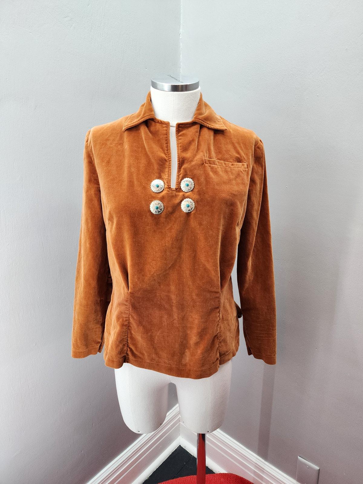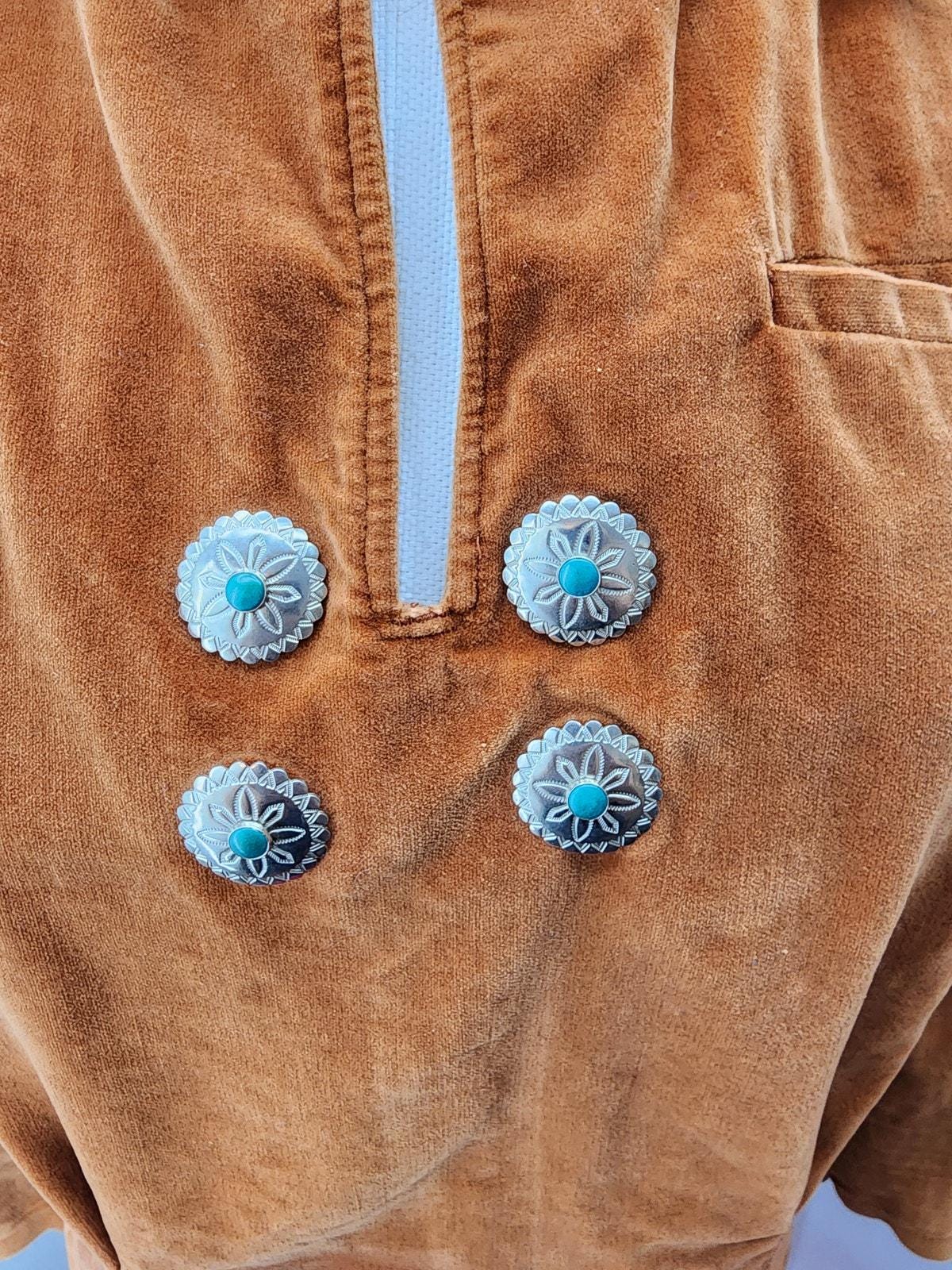 Smashing 100% cotton velveteen, burnt orange pullover top with Southwestern styling and 4 original conchos just below the v-neck collar. (unsure if turquoise is real or not)