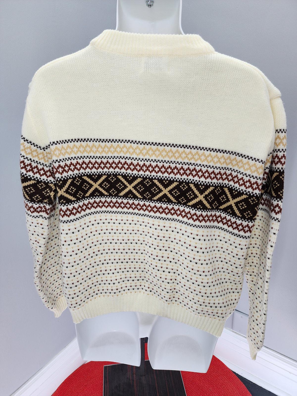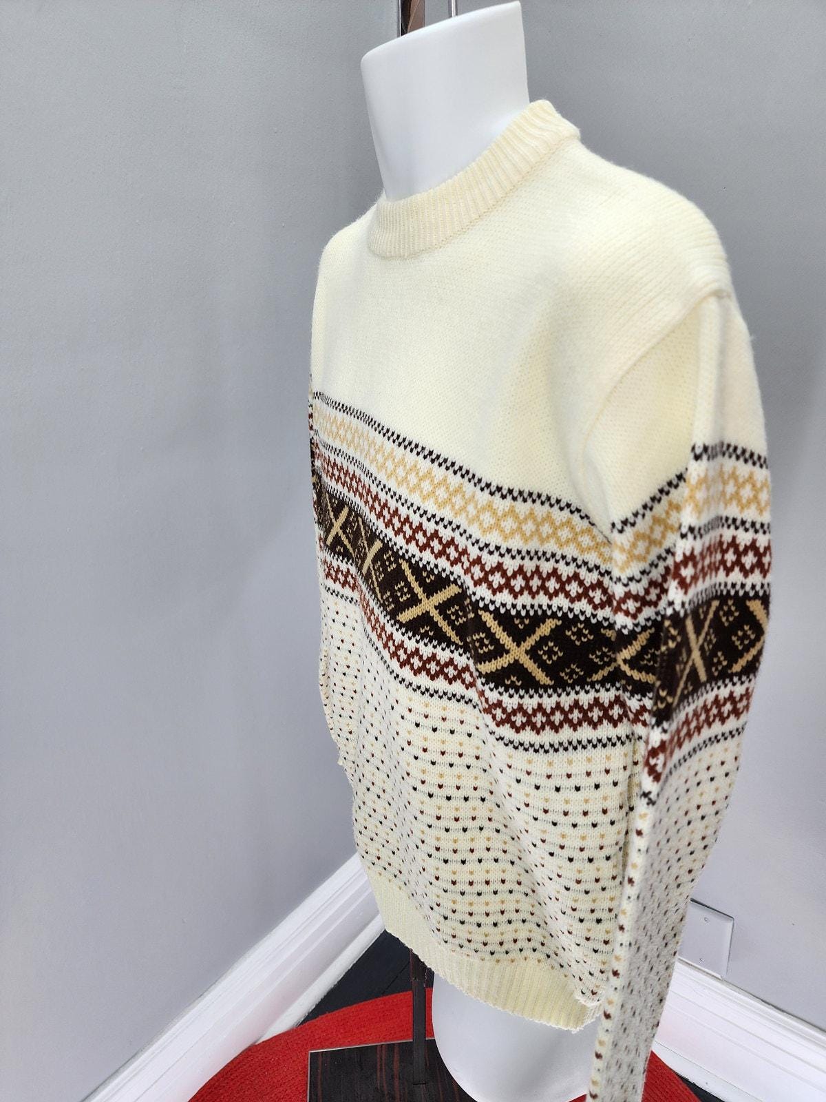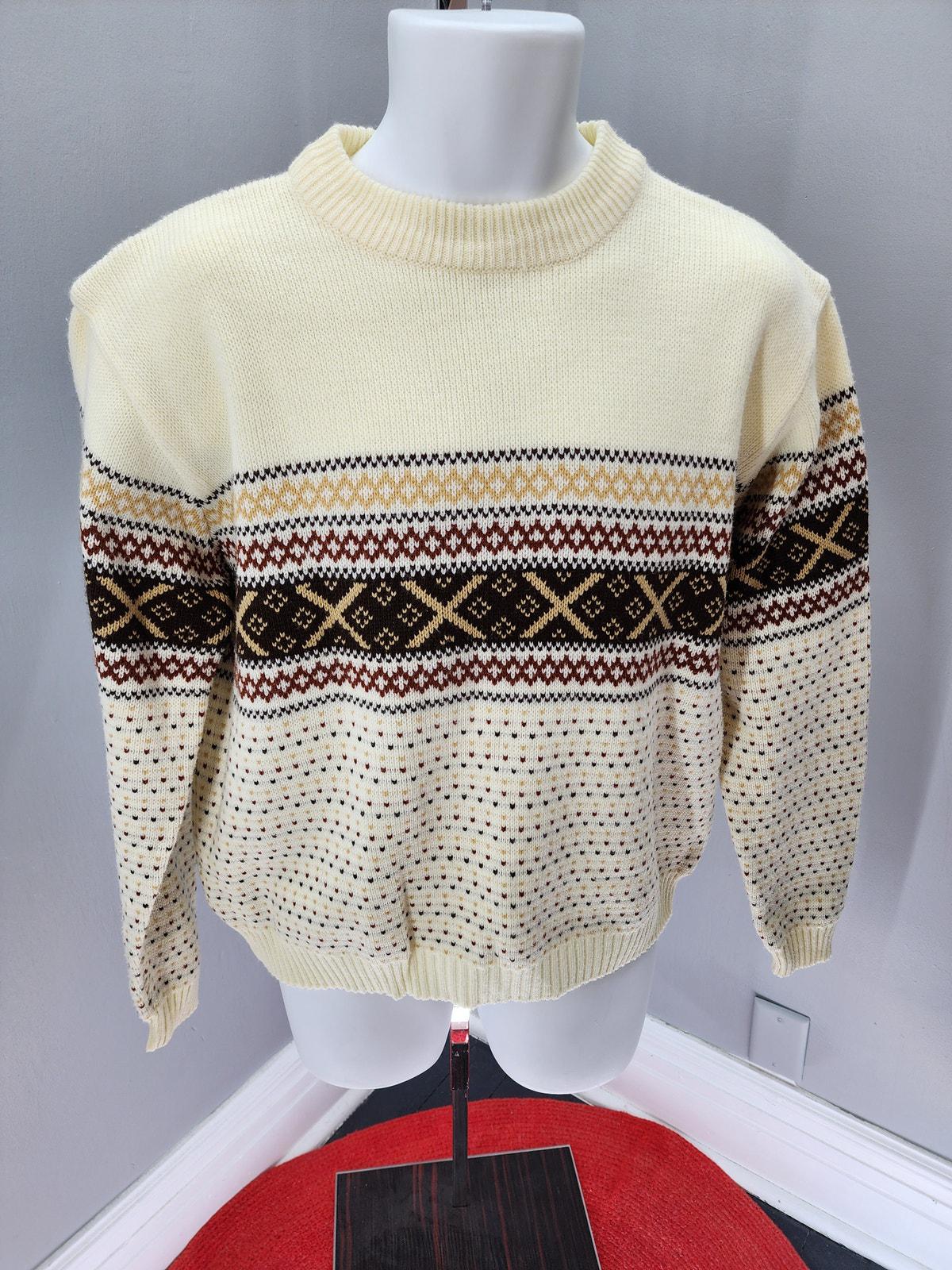 Late 70s Super comfy and super cool vintage acrylic crewneck sweater with a classic design in winter white, with earth tone detail.