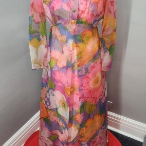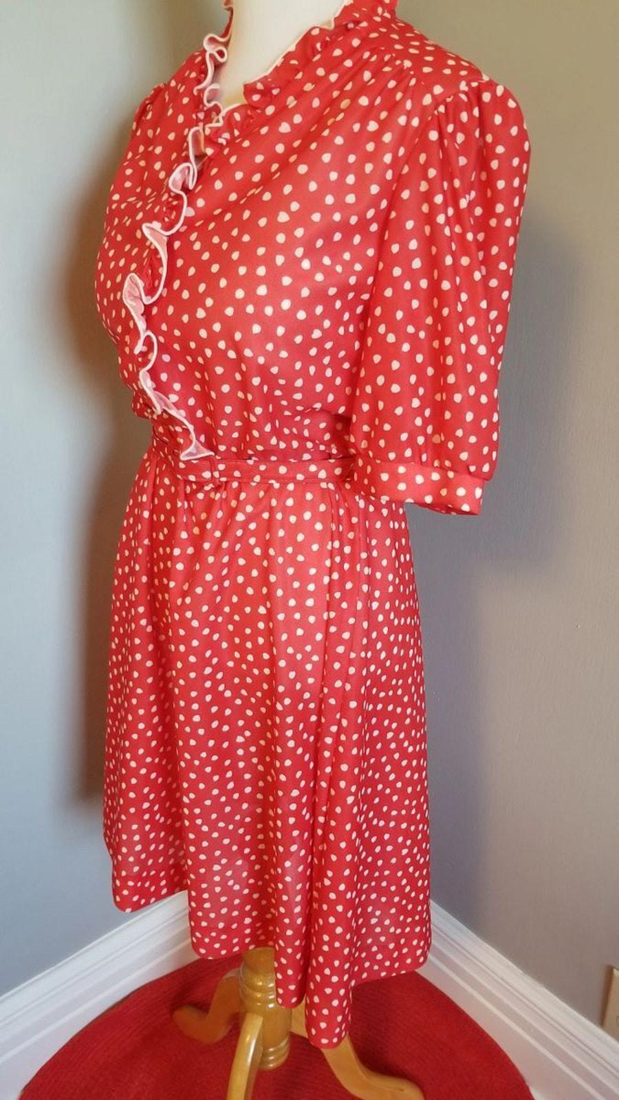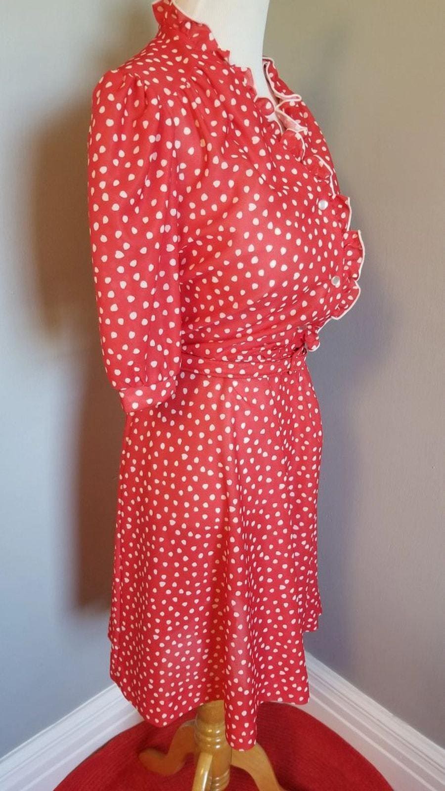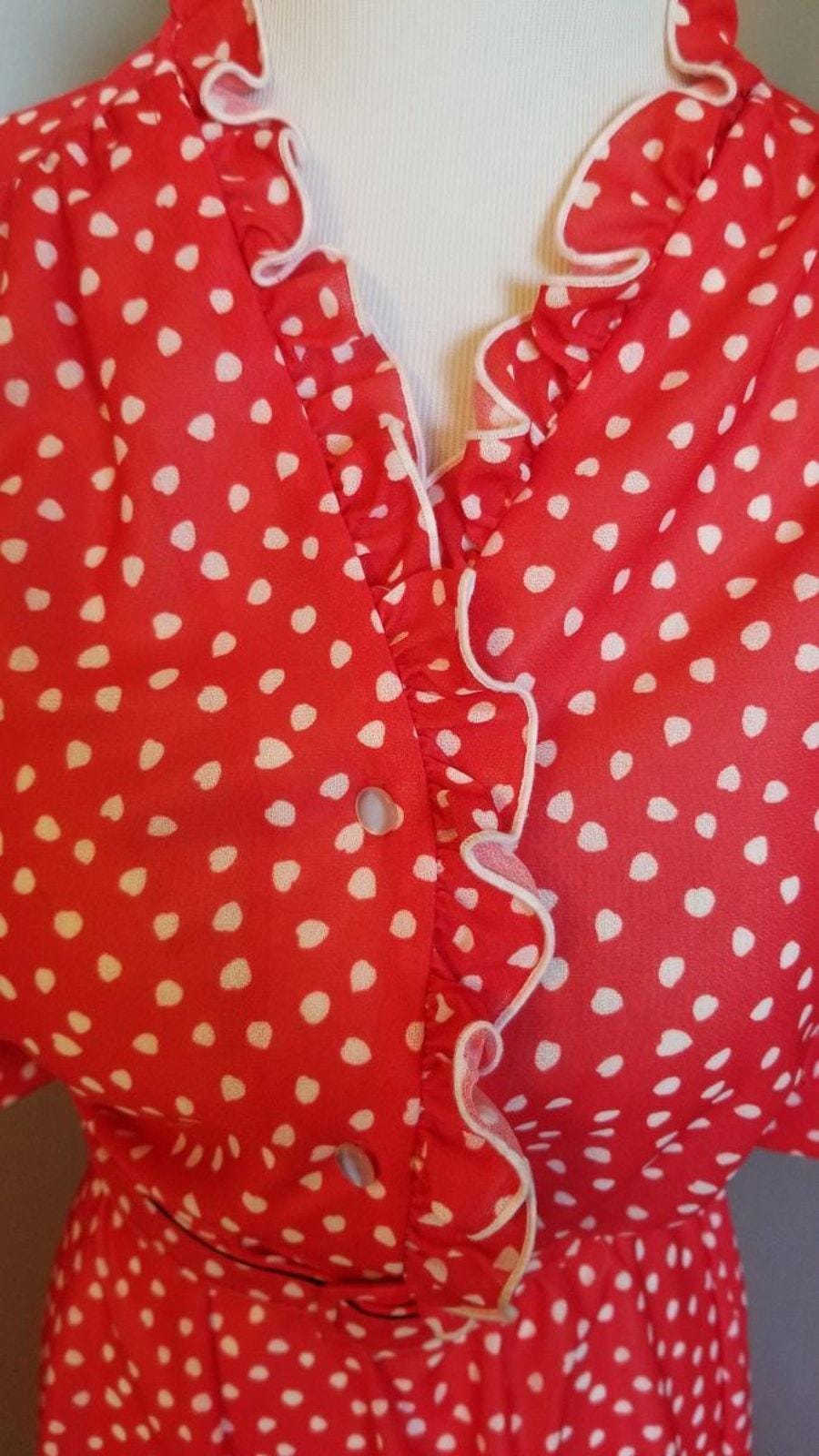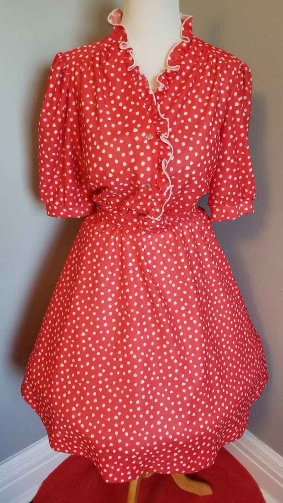 Cute polyester shirtwaist or fit-n-flare dress. Front button closure , elastic waist and original belt, and mother of pearl buttons. Ruffle neckline for that extra pizzazz.