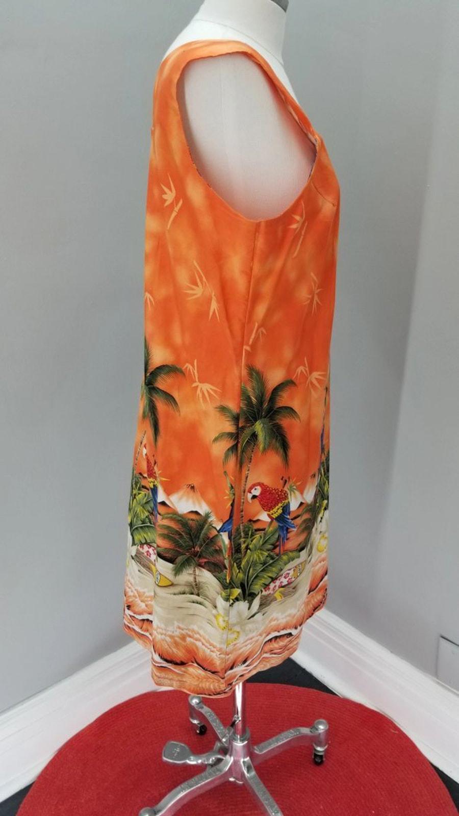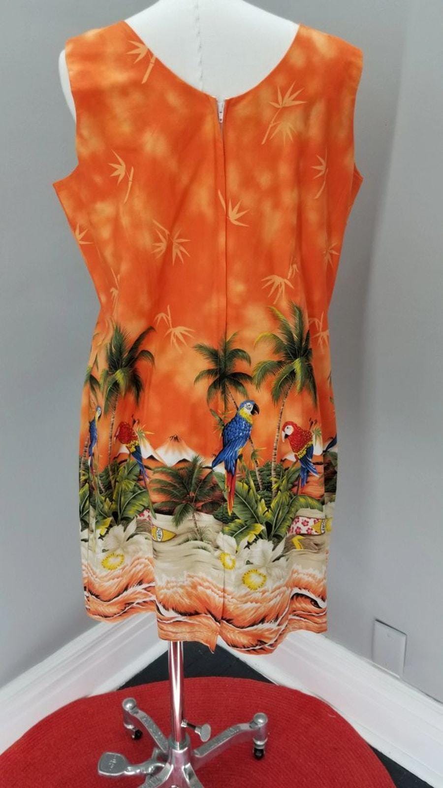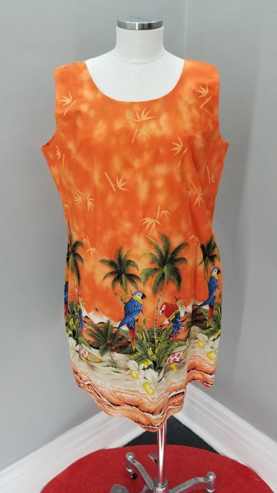 Vibrant 90s KY's Hawaiian Tank Dress! Crafted from comfortable cotton with a lively print featuring a tropical paradise. Parrots, surfboards, palms, volcanoes, and more dance across a vivid orange background.