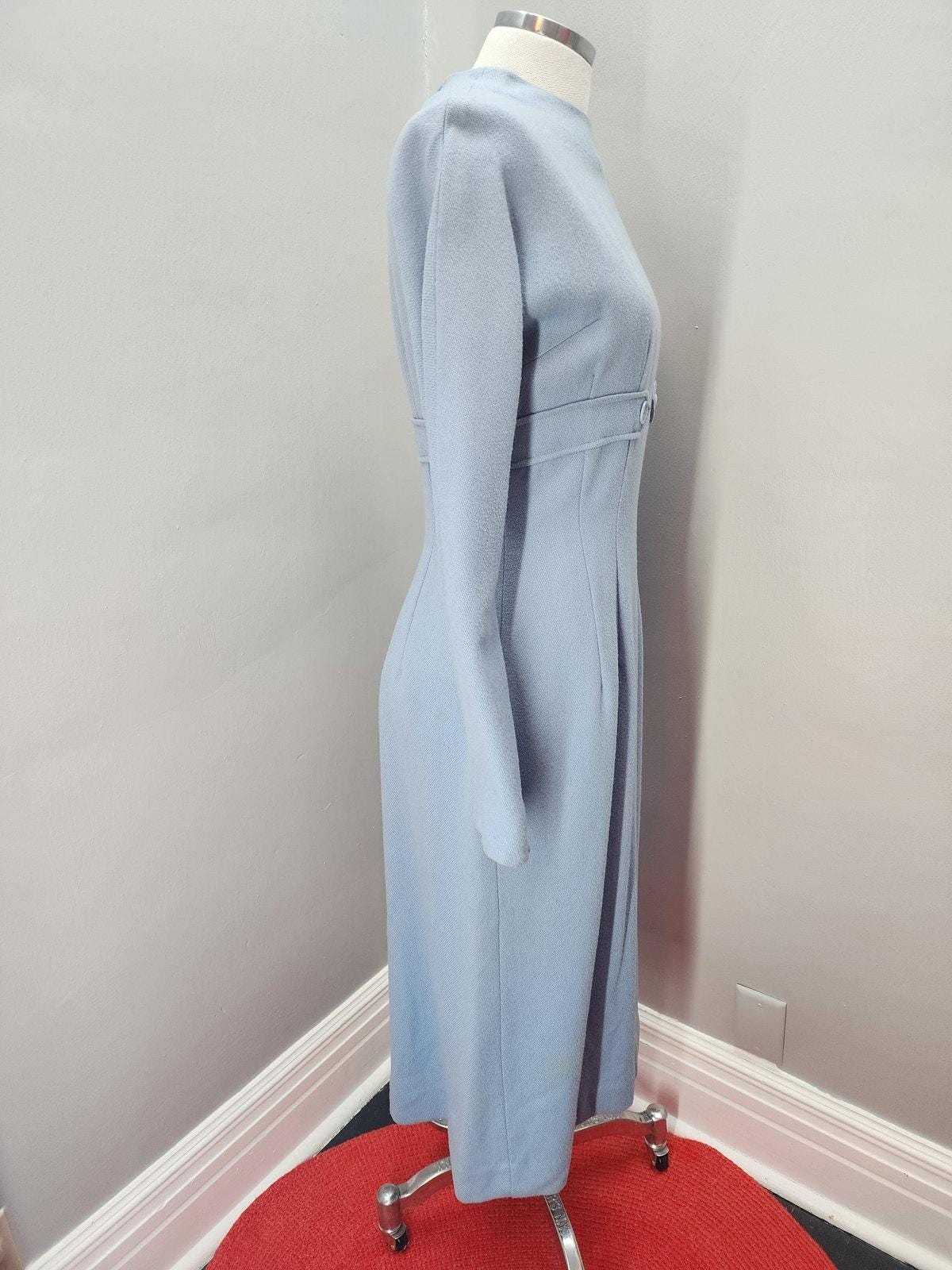 Iconic Jonathan Logan pencil sheath dress in powder blue wool with empire waist detail, gussets in the armpits and at the elbows, Talon metal zipper, ¾ lined and exquisite darting and seam placement.