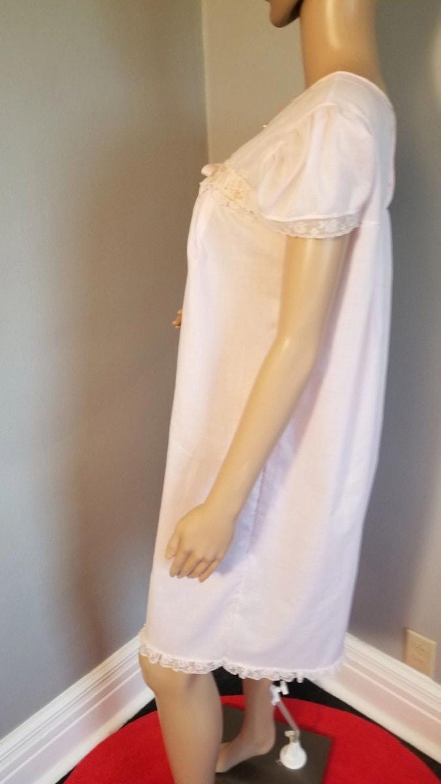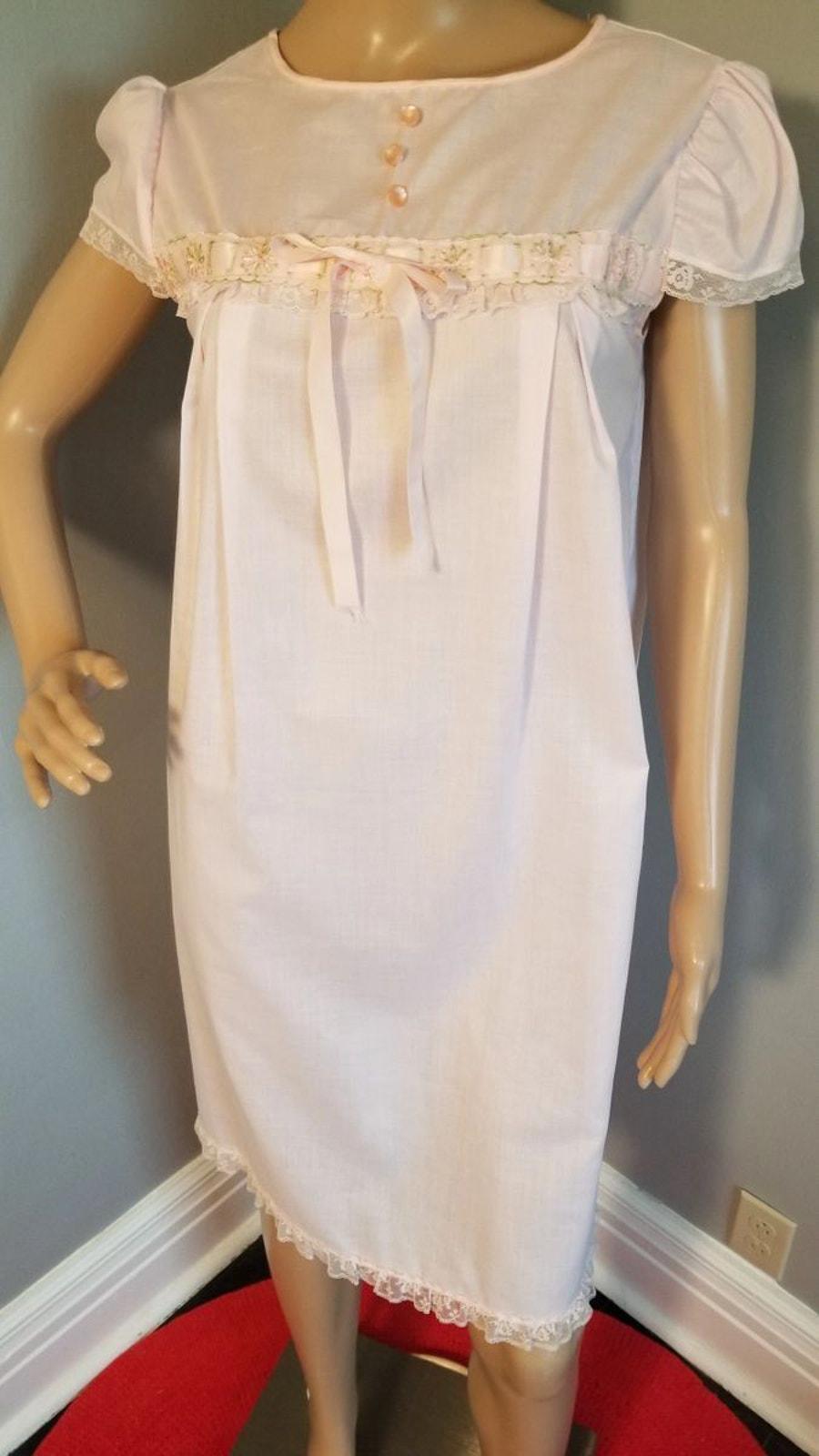 1960s Gaymode Nightie in pink with embroidered and ribbon woven yoke detail, cap sleeve with lace edge. Back button closure at the neckline.