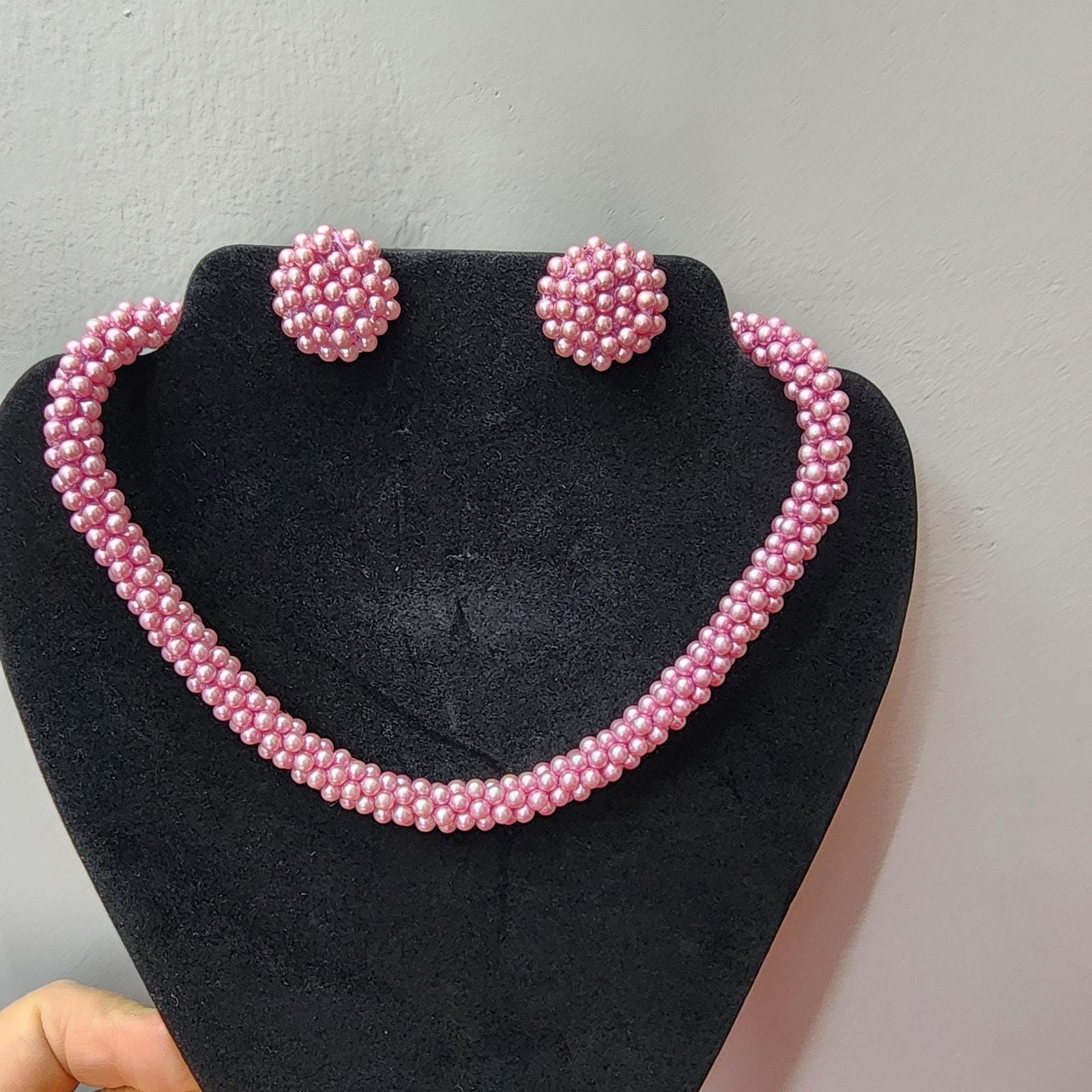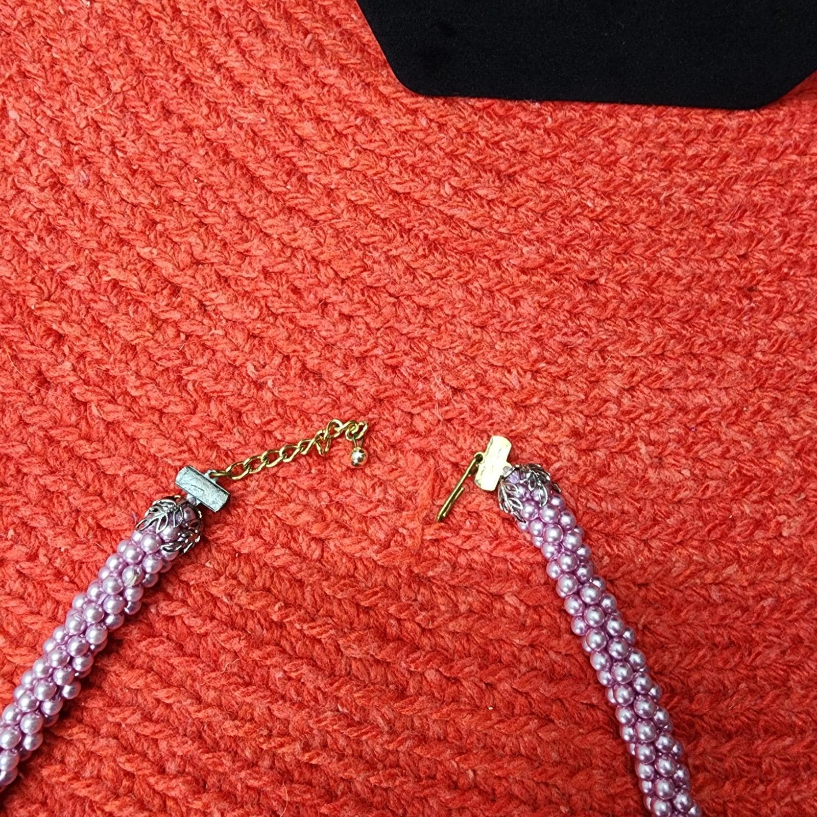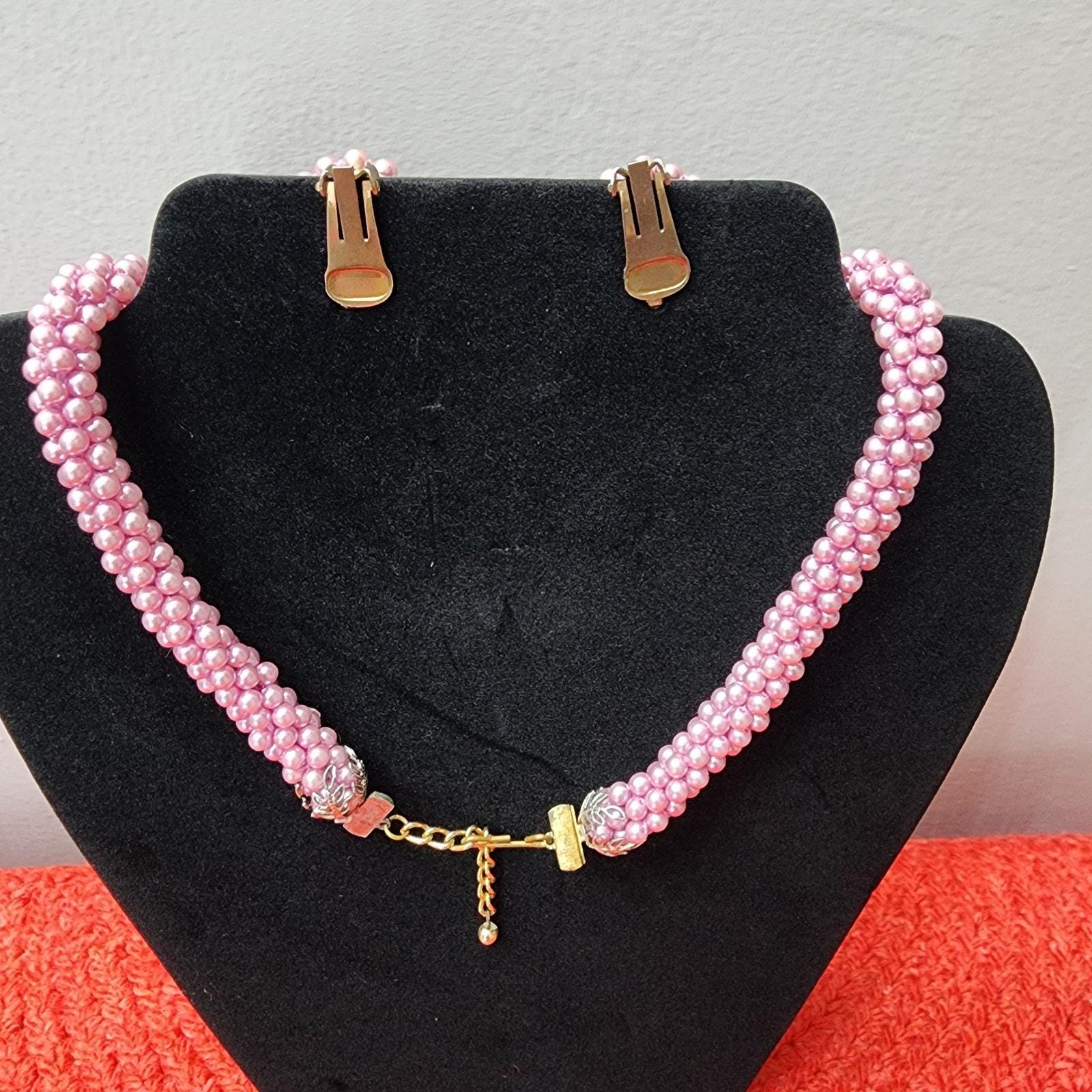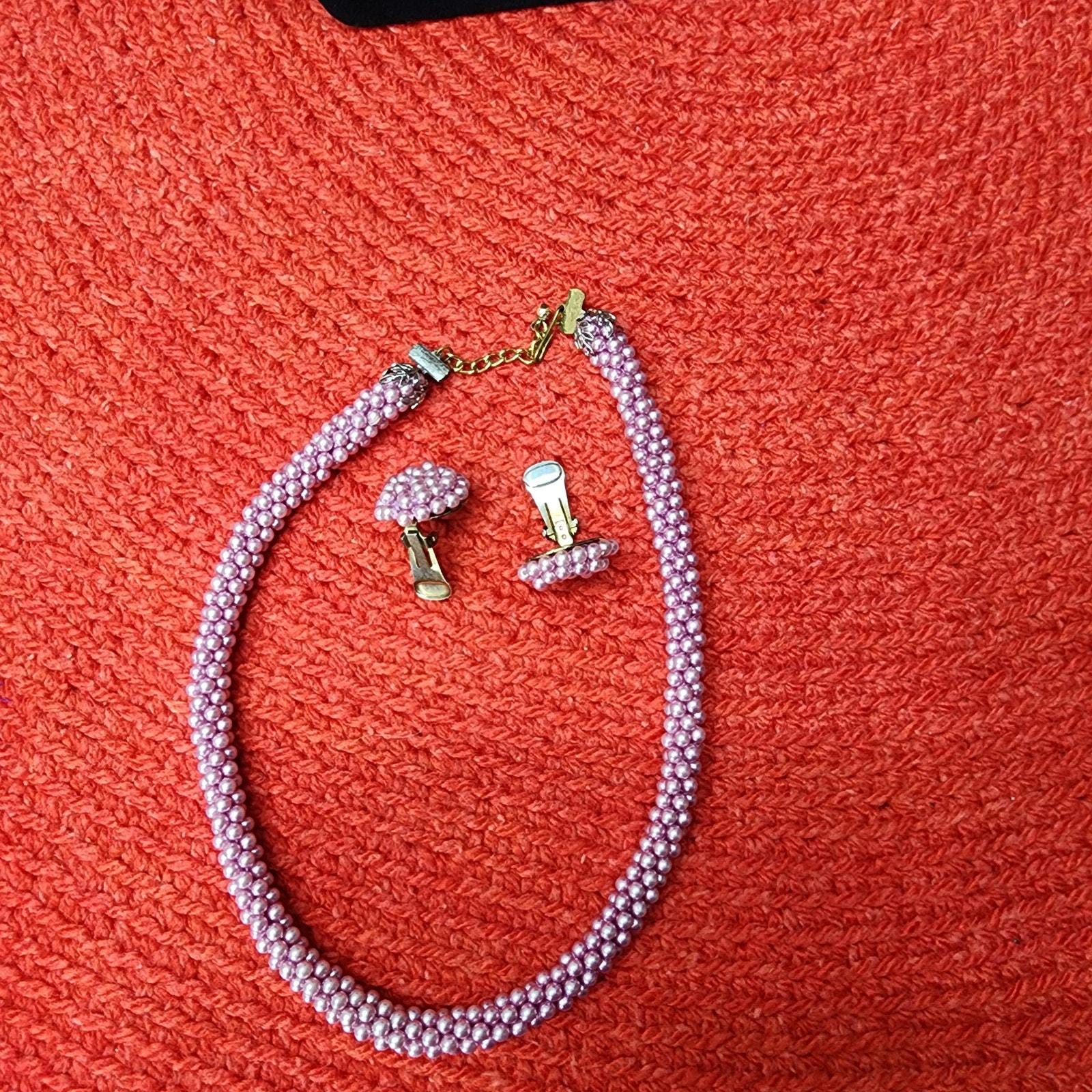 60s Vintage Lavender Beaded Rope Necklace and Button Clip Earrings