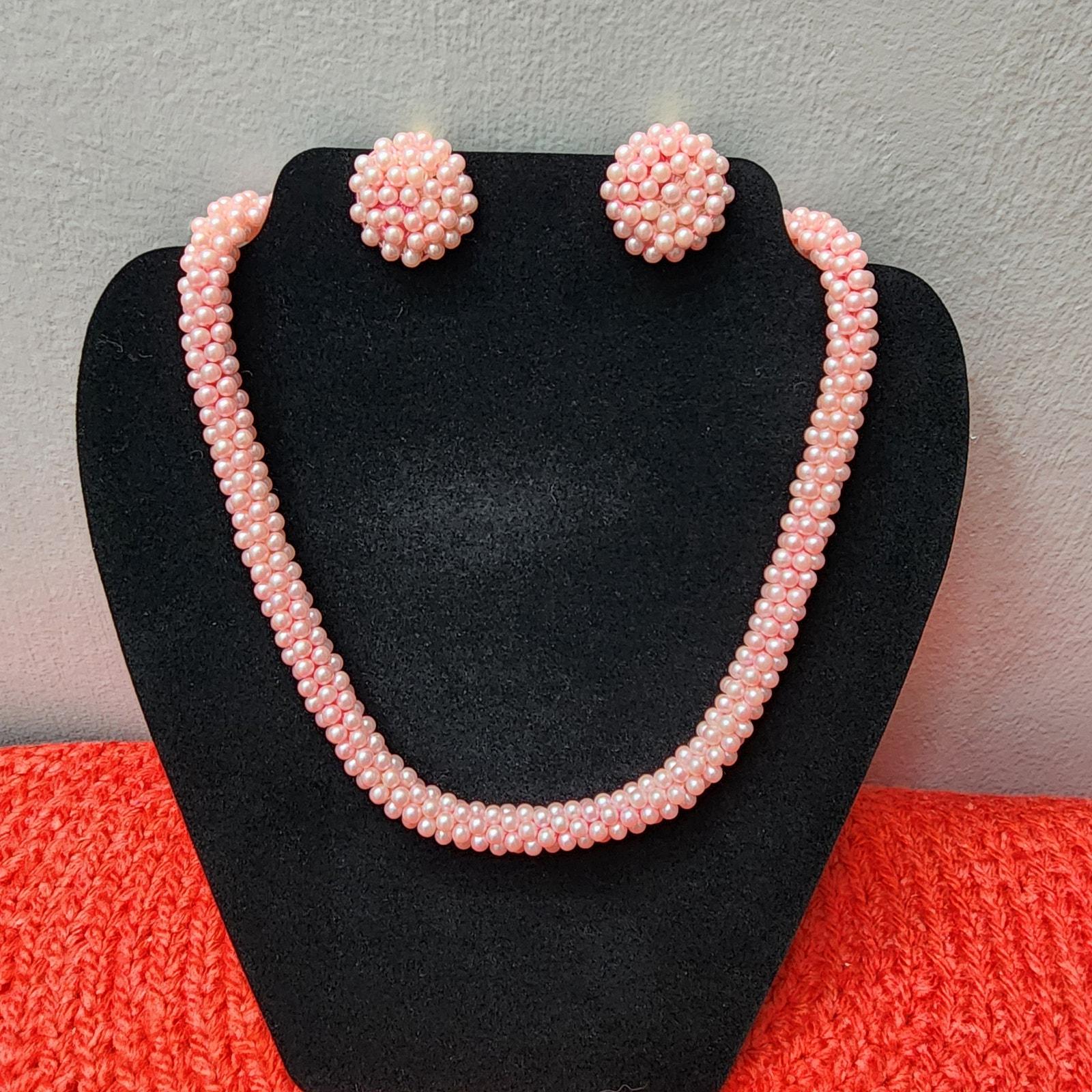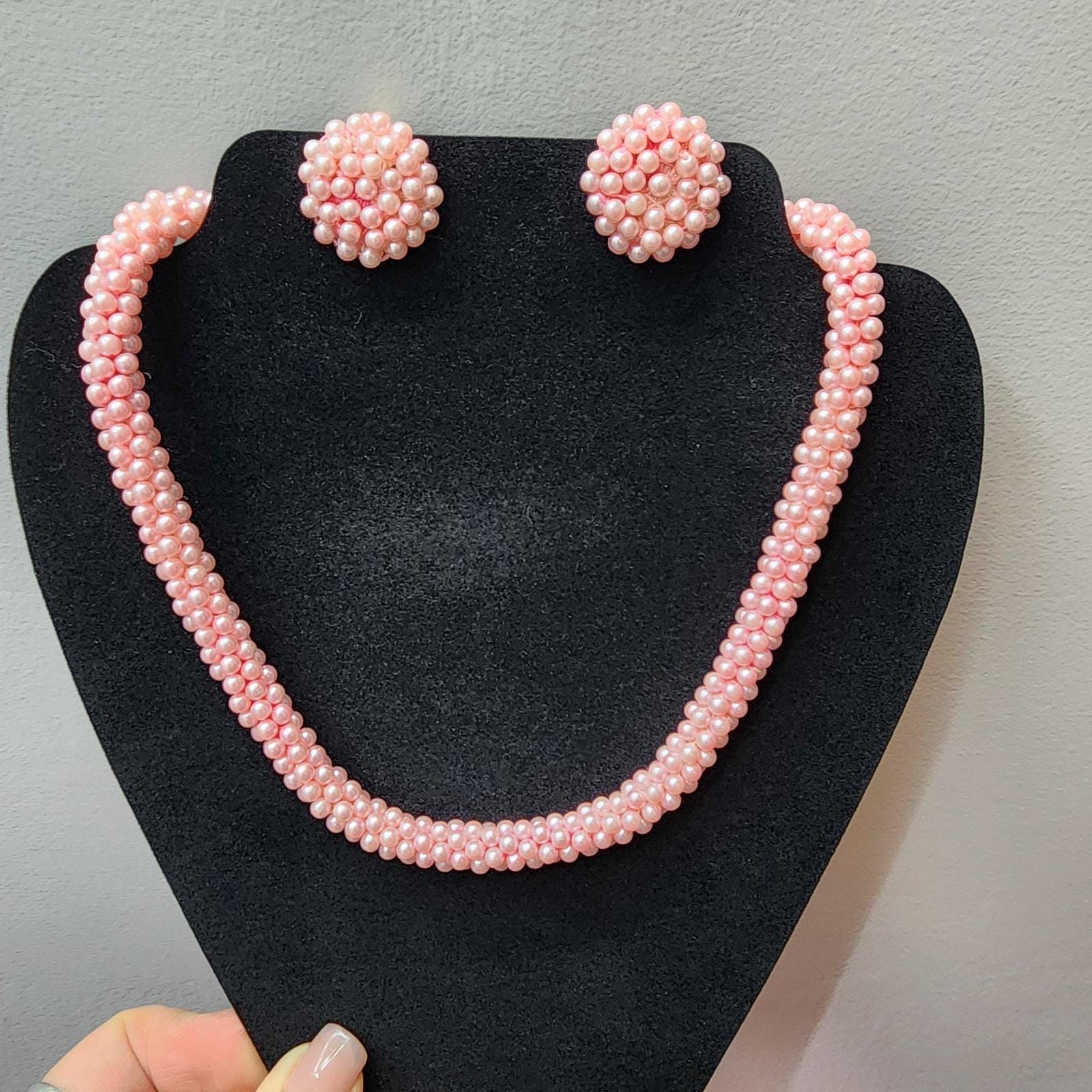 60s Vintage Pink Beaded Rope Necklace and Button Clip Earrings