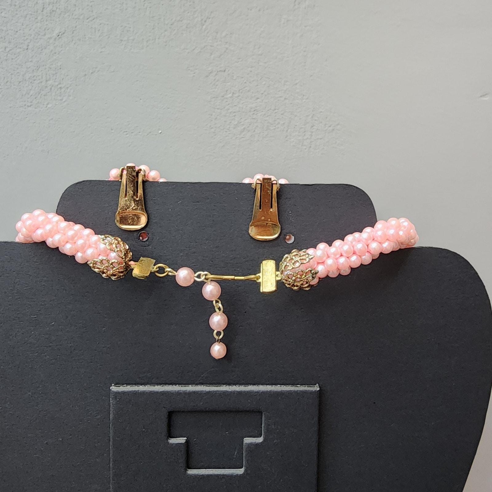 Super cute Pink beaded choker necklace and button clip earrings.