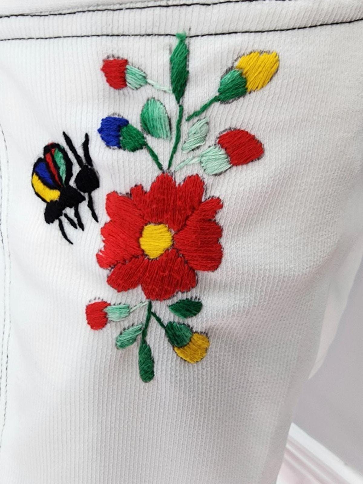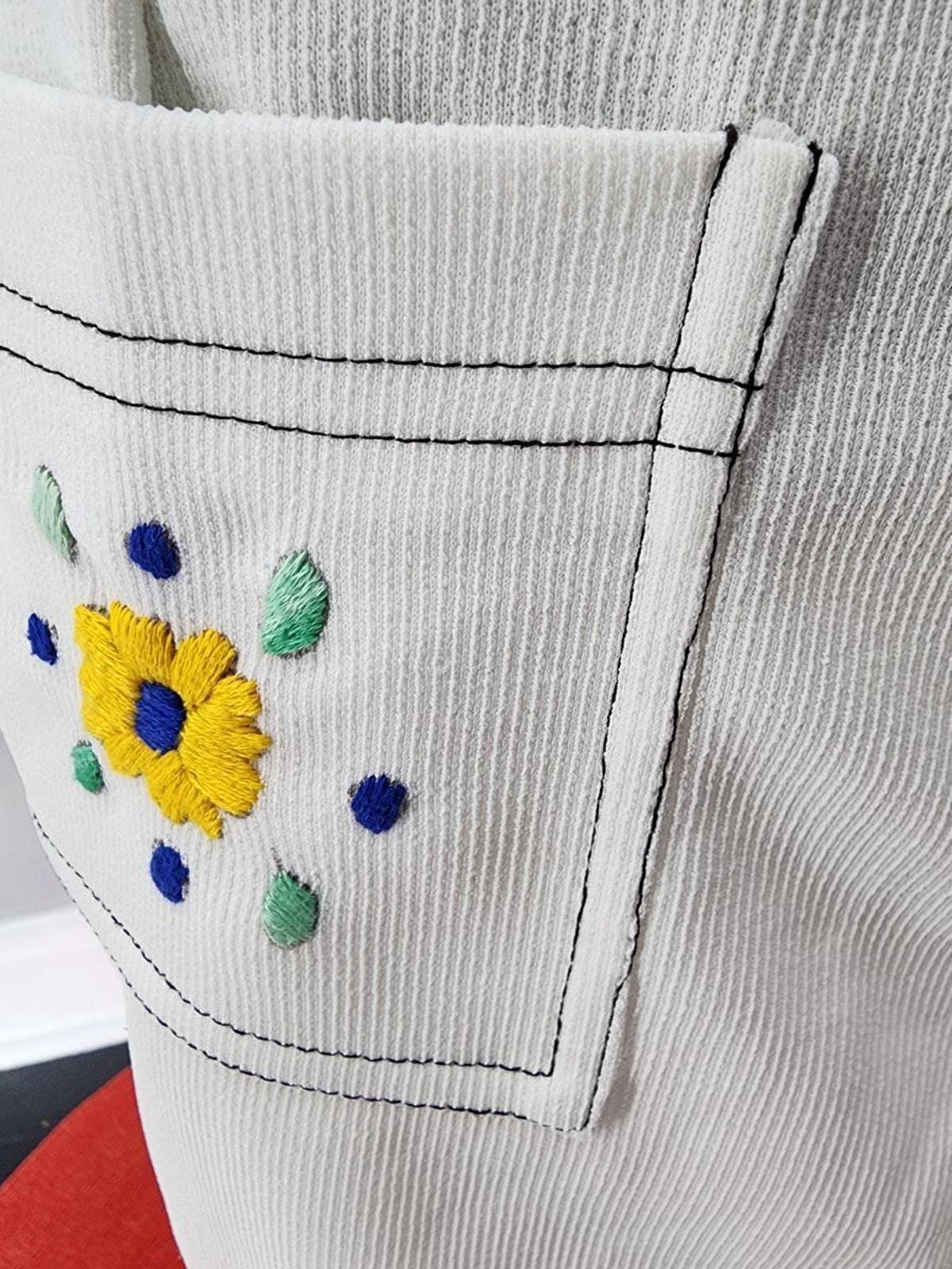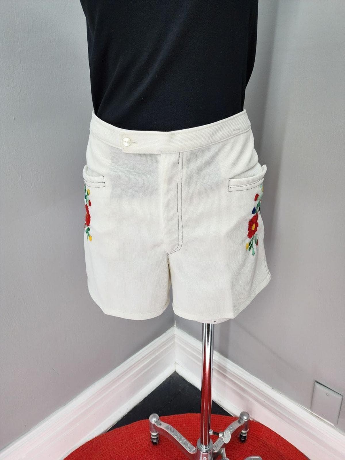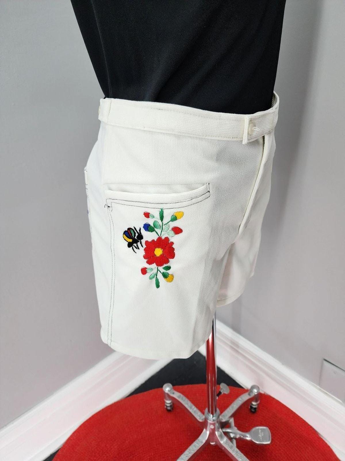 These late 60s / early 70s white ribbed textured polyester shorts with black contrasting stitching are ADORABLE. The embroidered flowers and Butterflies make them very 70s.