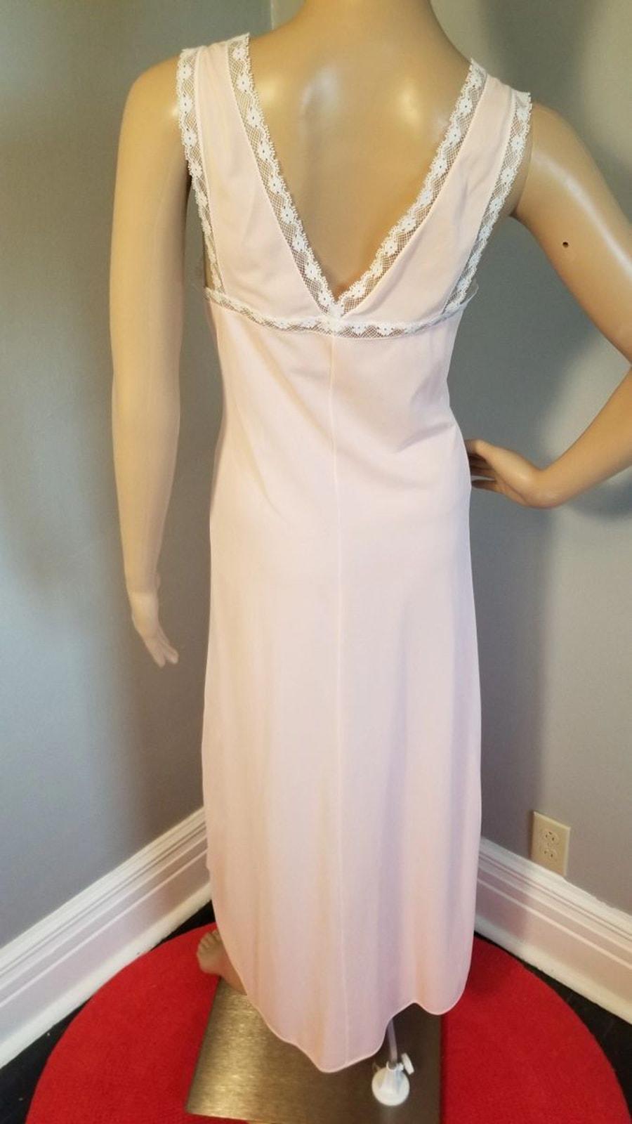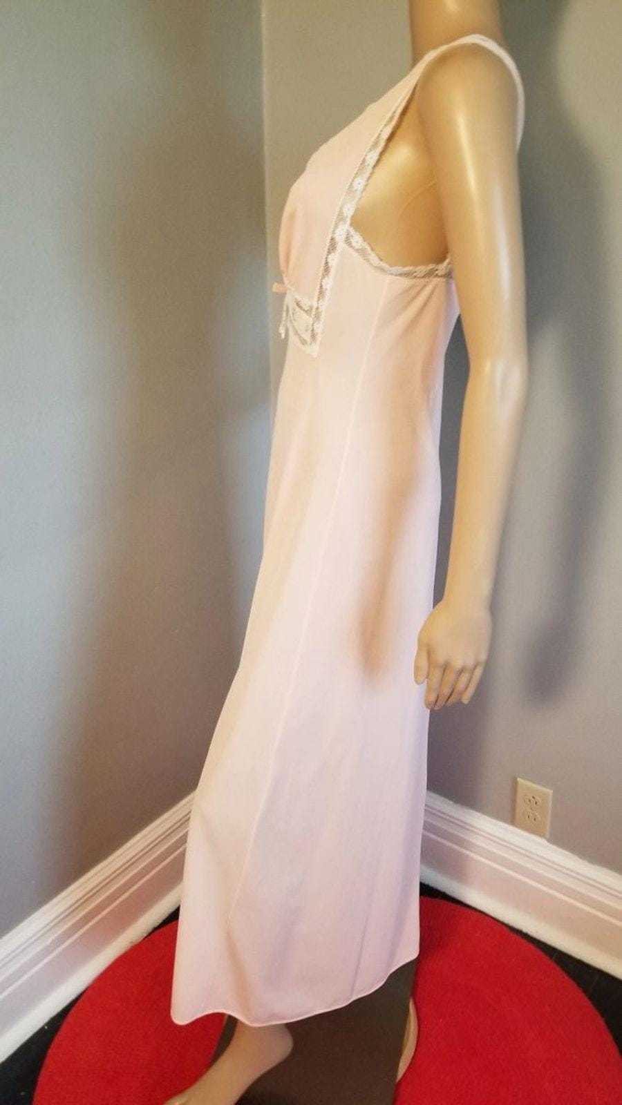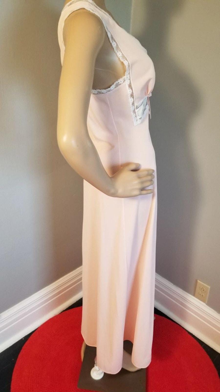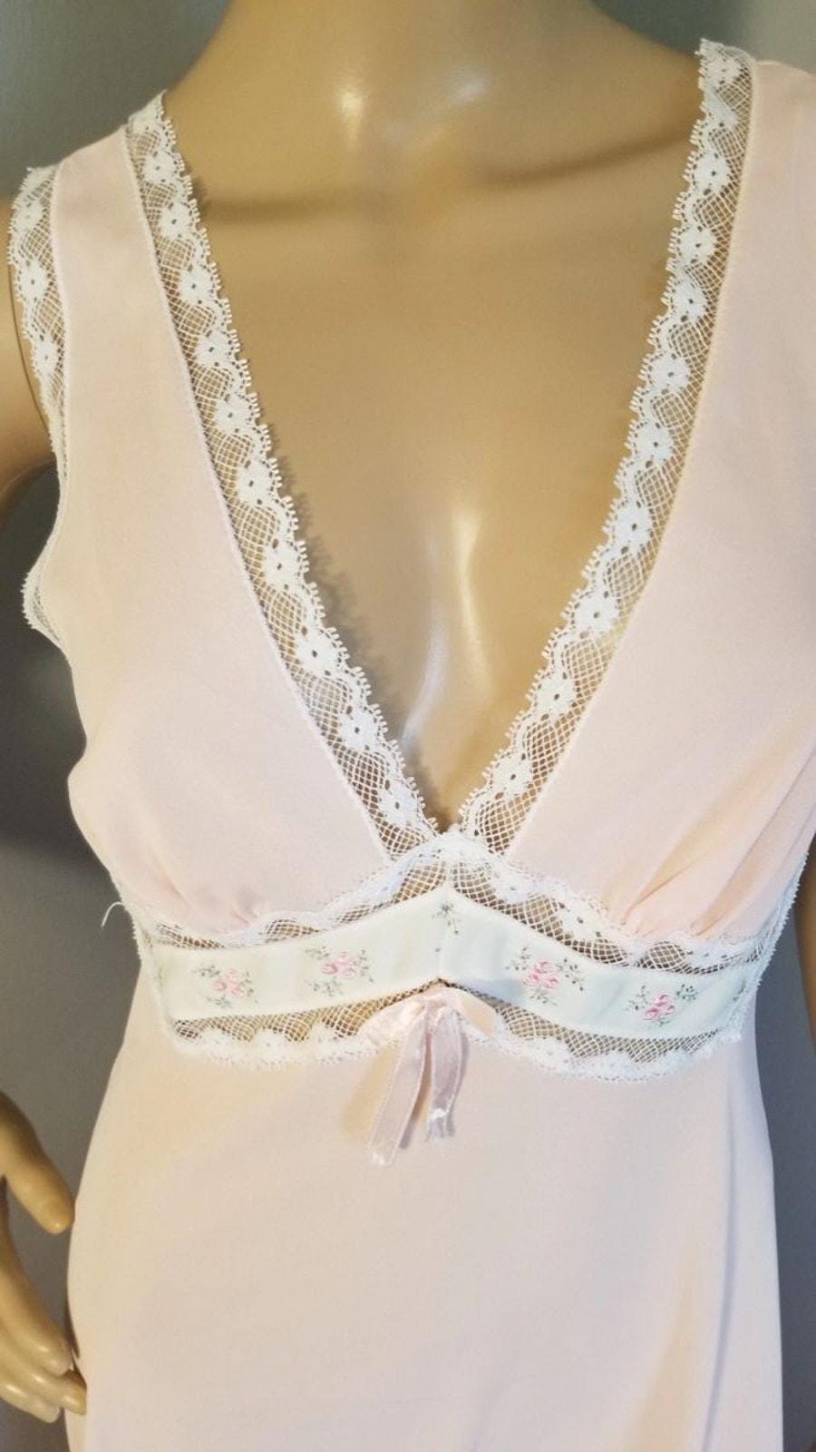 Val Mode nightgown in the lightest peachy-pink shade, with lace and rosette ribbon underbust detail.