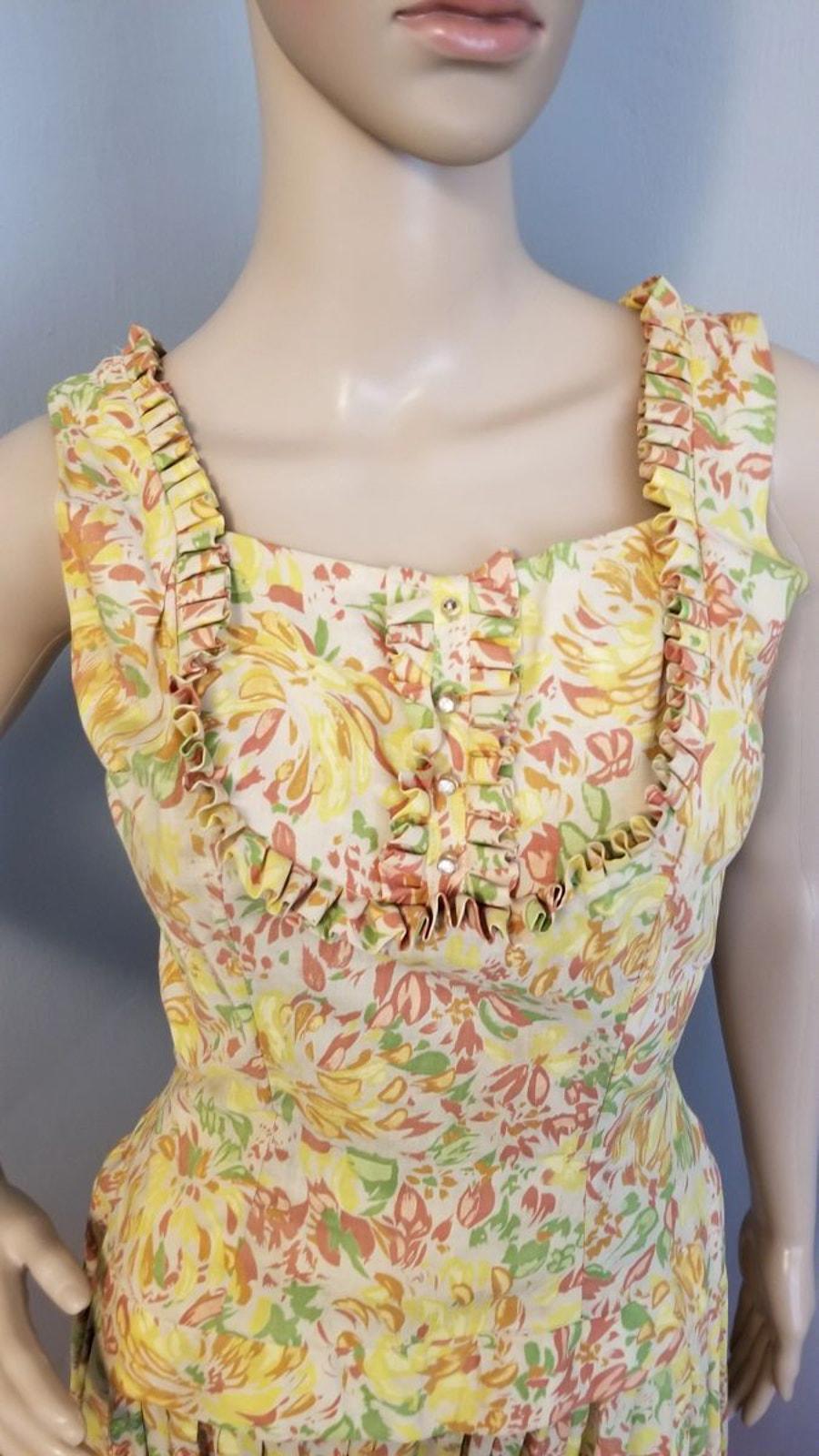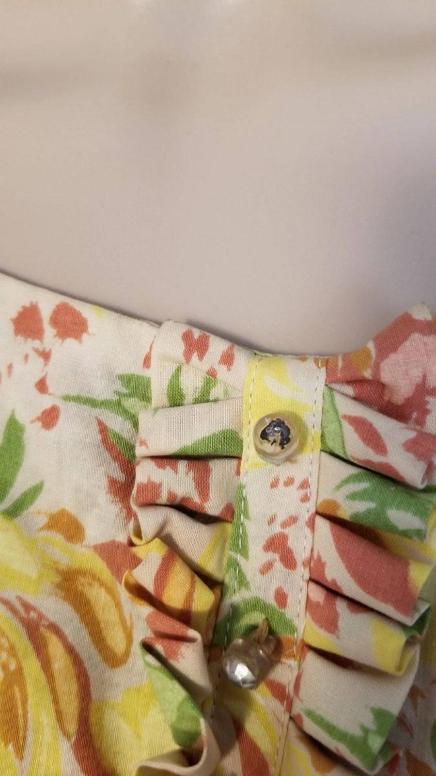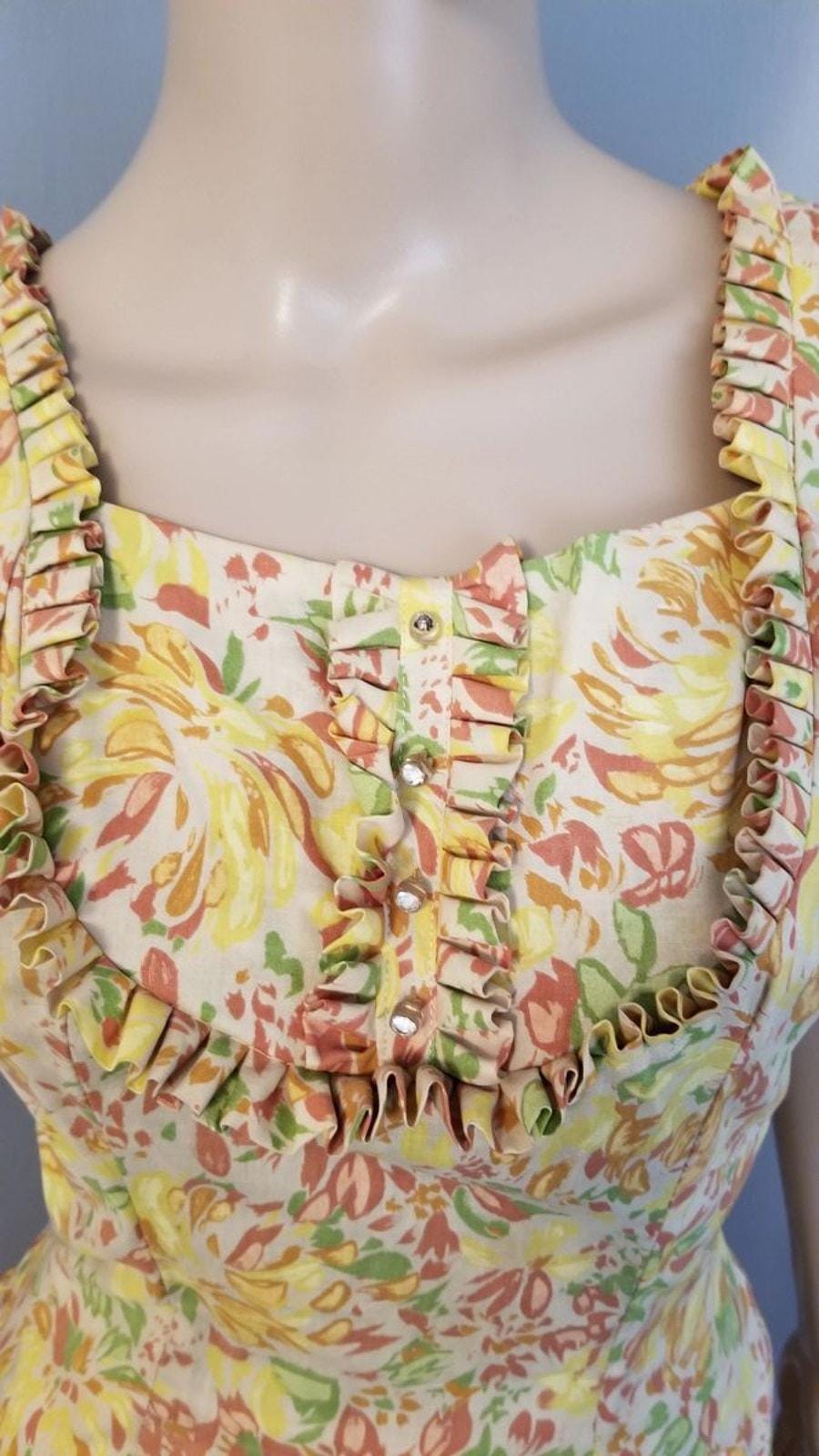 1950s Summer Cotton Frock in tan, green, yellow and nutmeg muted floral design. Super cute tuxedo ruffles on the chest and neckline.