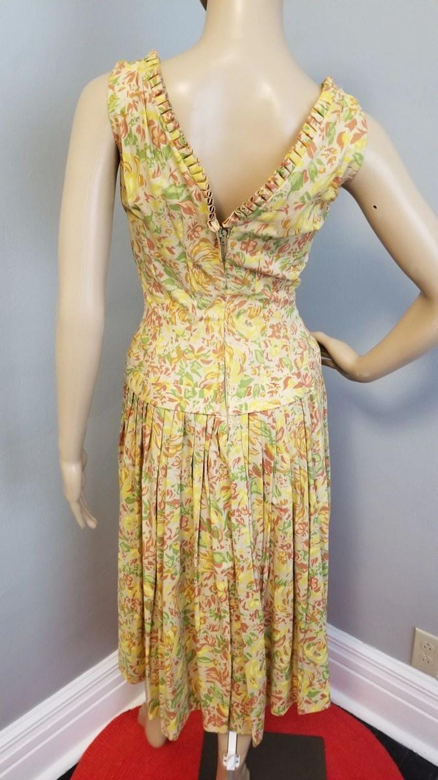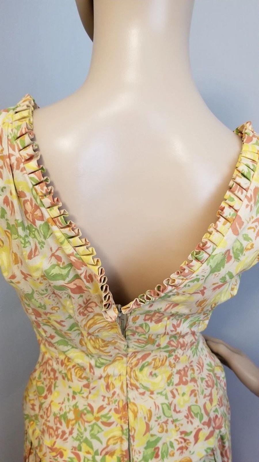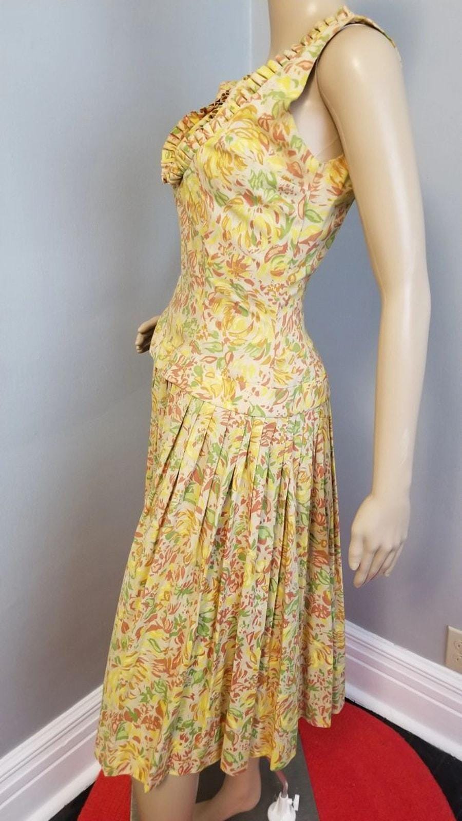 1950s Summer Cotton Frock in tan, green, yellow and nutmeg muted floral design. Super cute tuxedo ruffles on the chest and neckline.