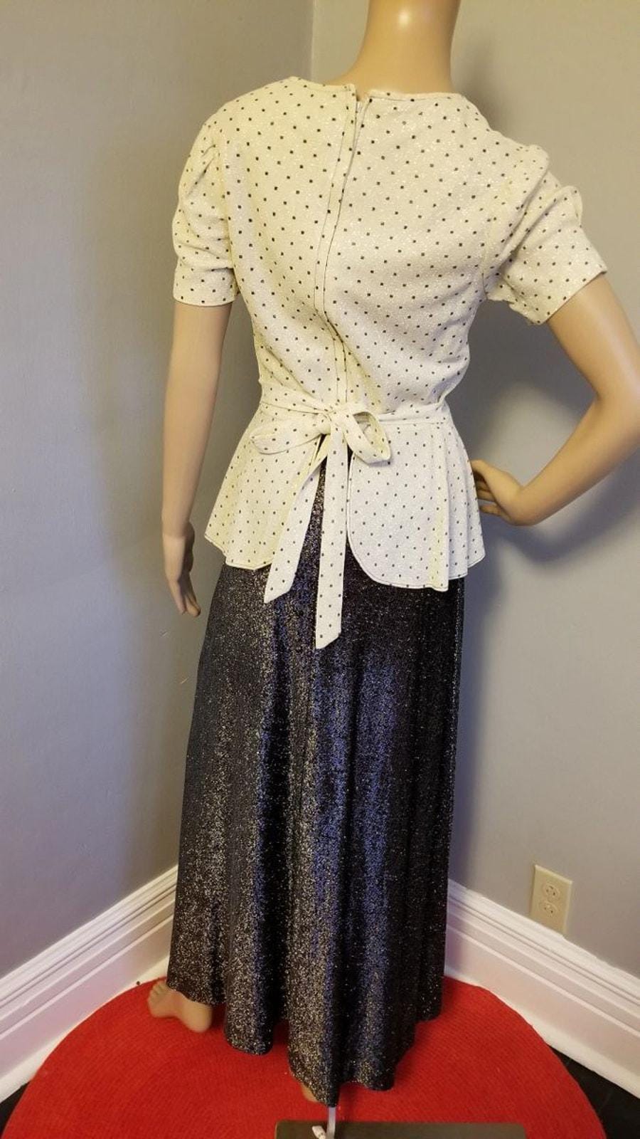 70s Vintage Lurex Peplum Dress, Black, White & Silver Maxi Evening Dress - S