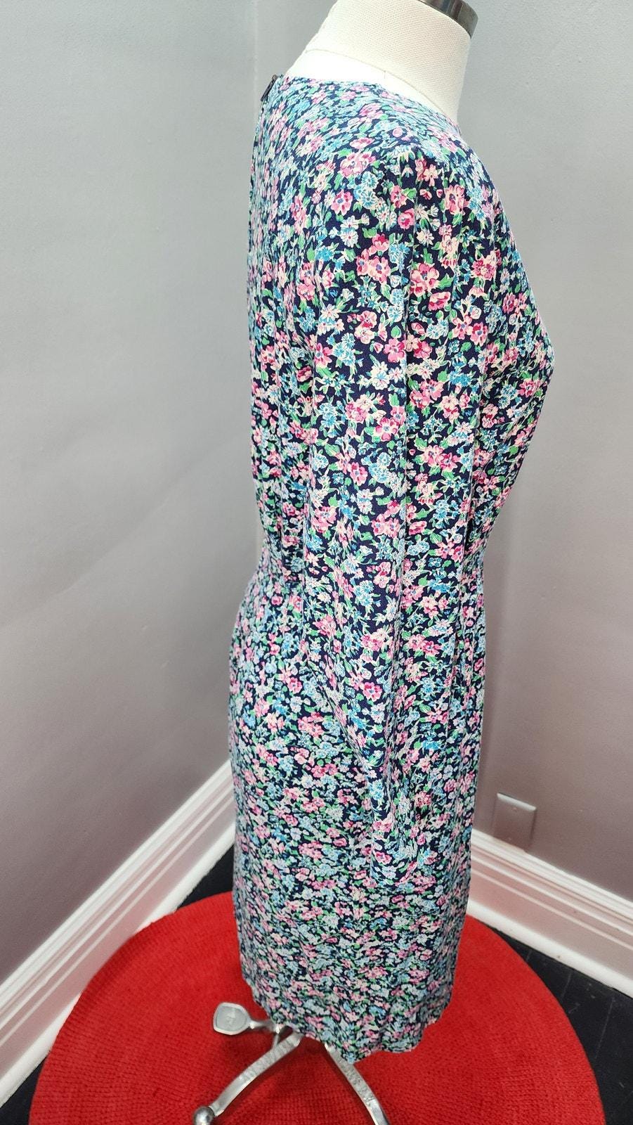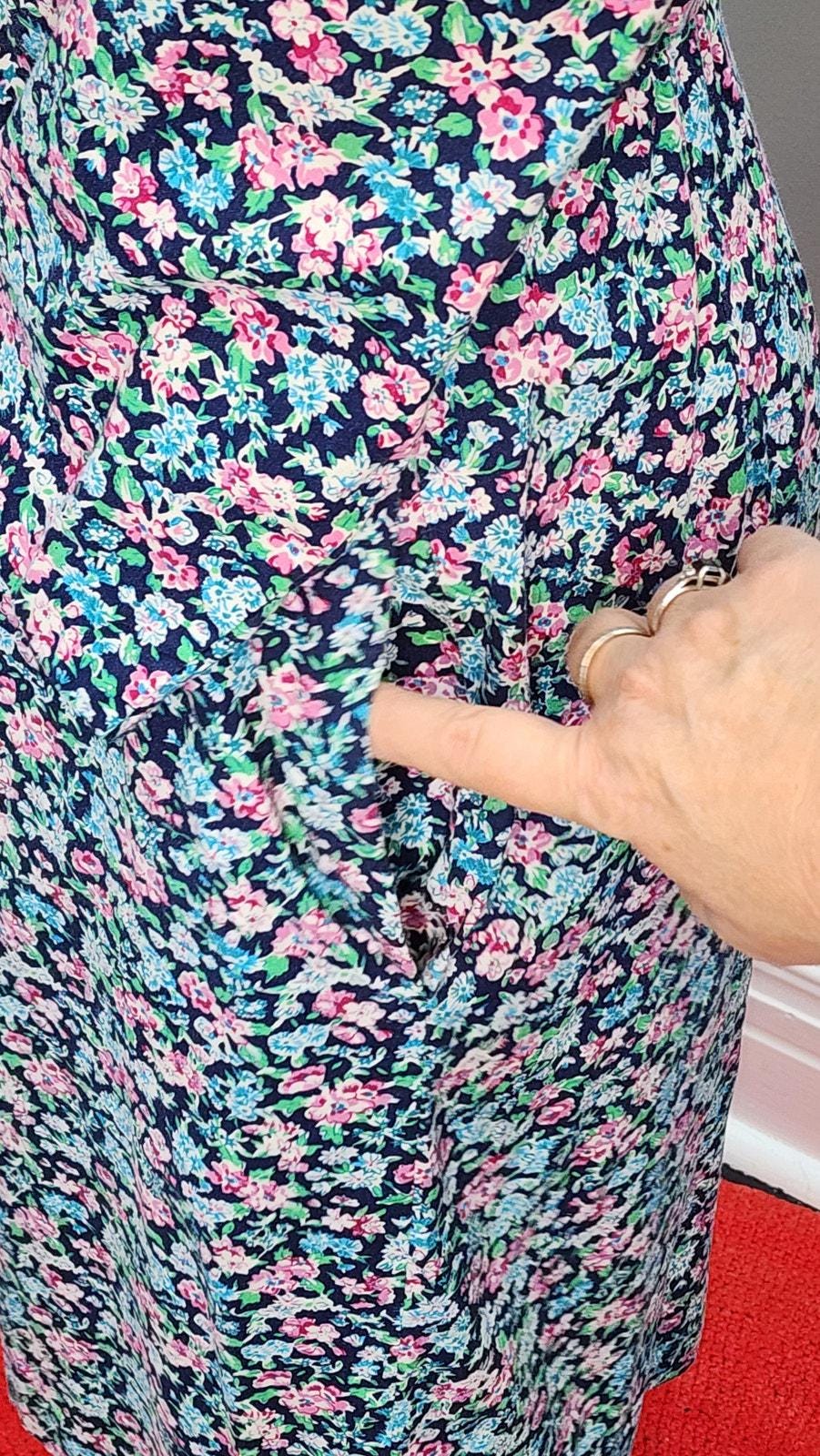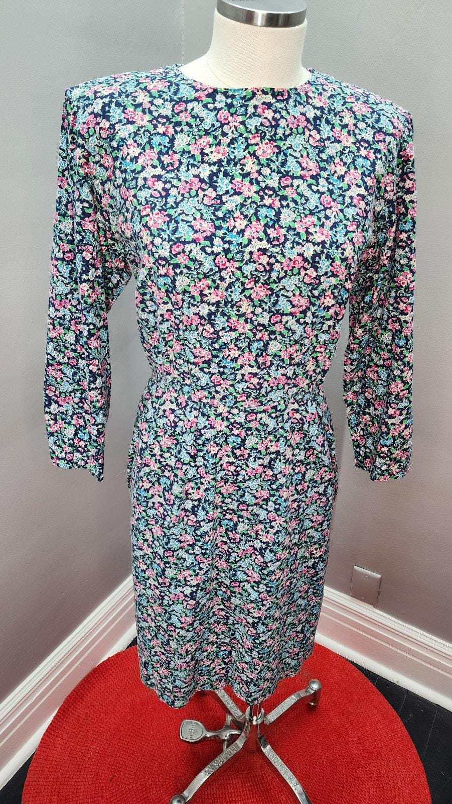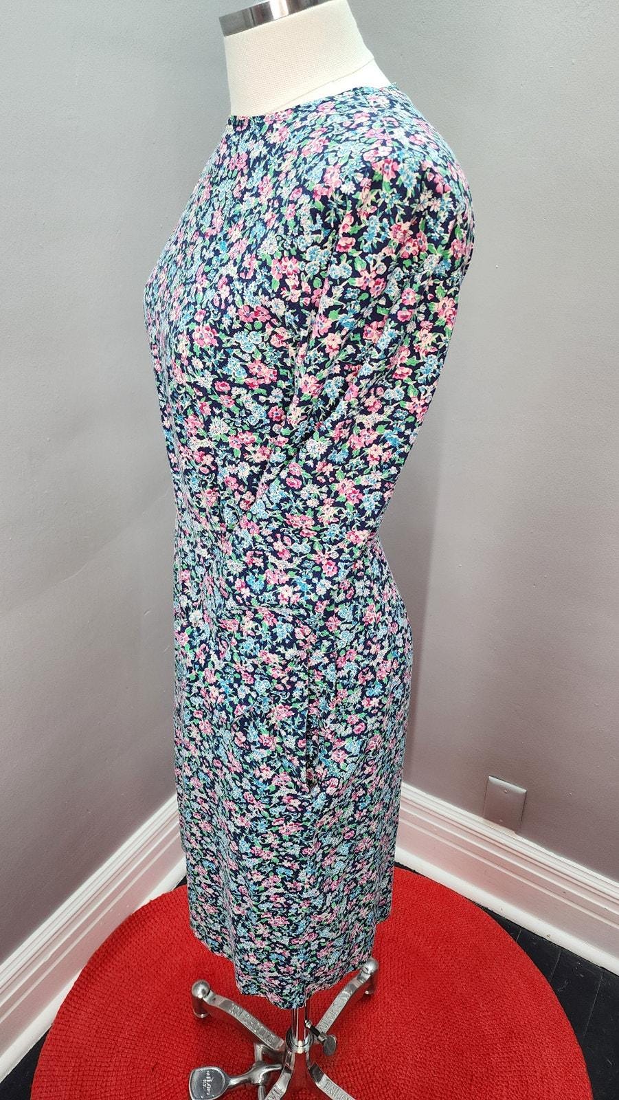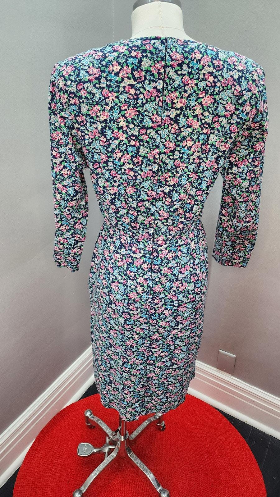 Cute and easy wearing 80S does 40s cotton wiggle or sheath dress. Appears to be handmade by a very good seamstress. Removable shoulder pads, back zipper closure, 3/4 sleeves, and two pockets! Love a dress with pockets.