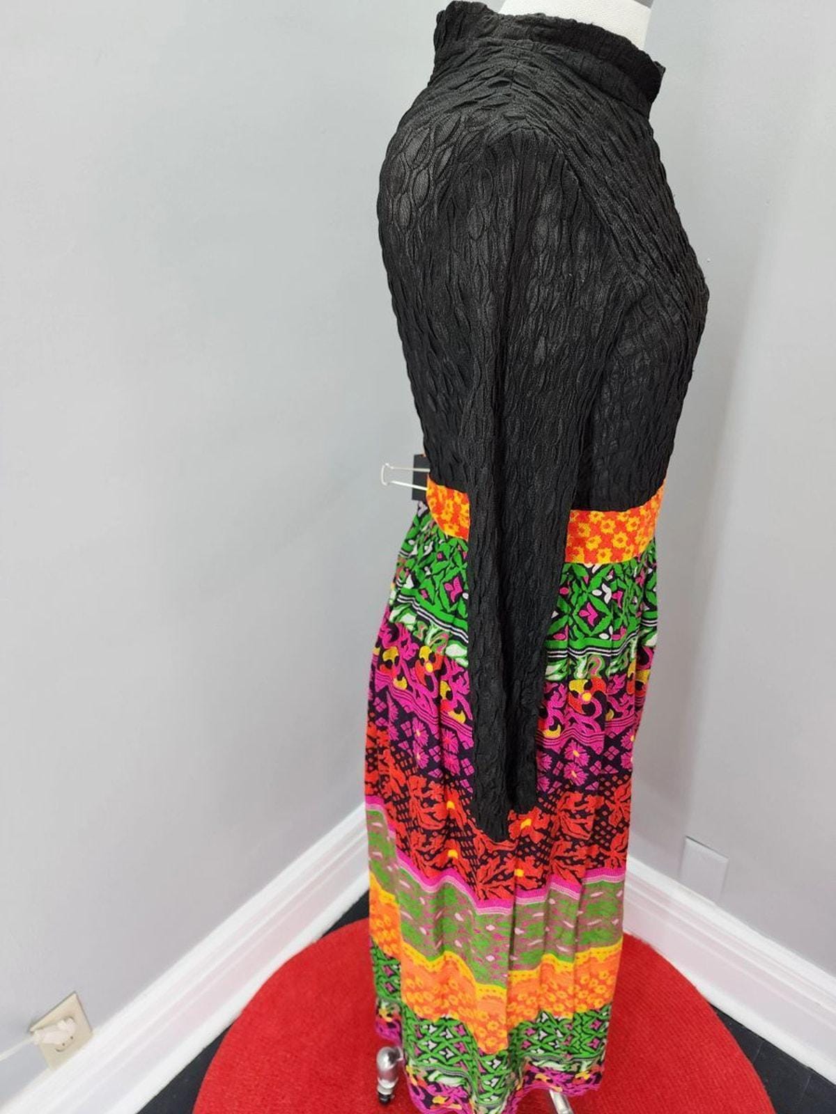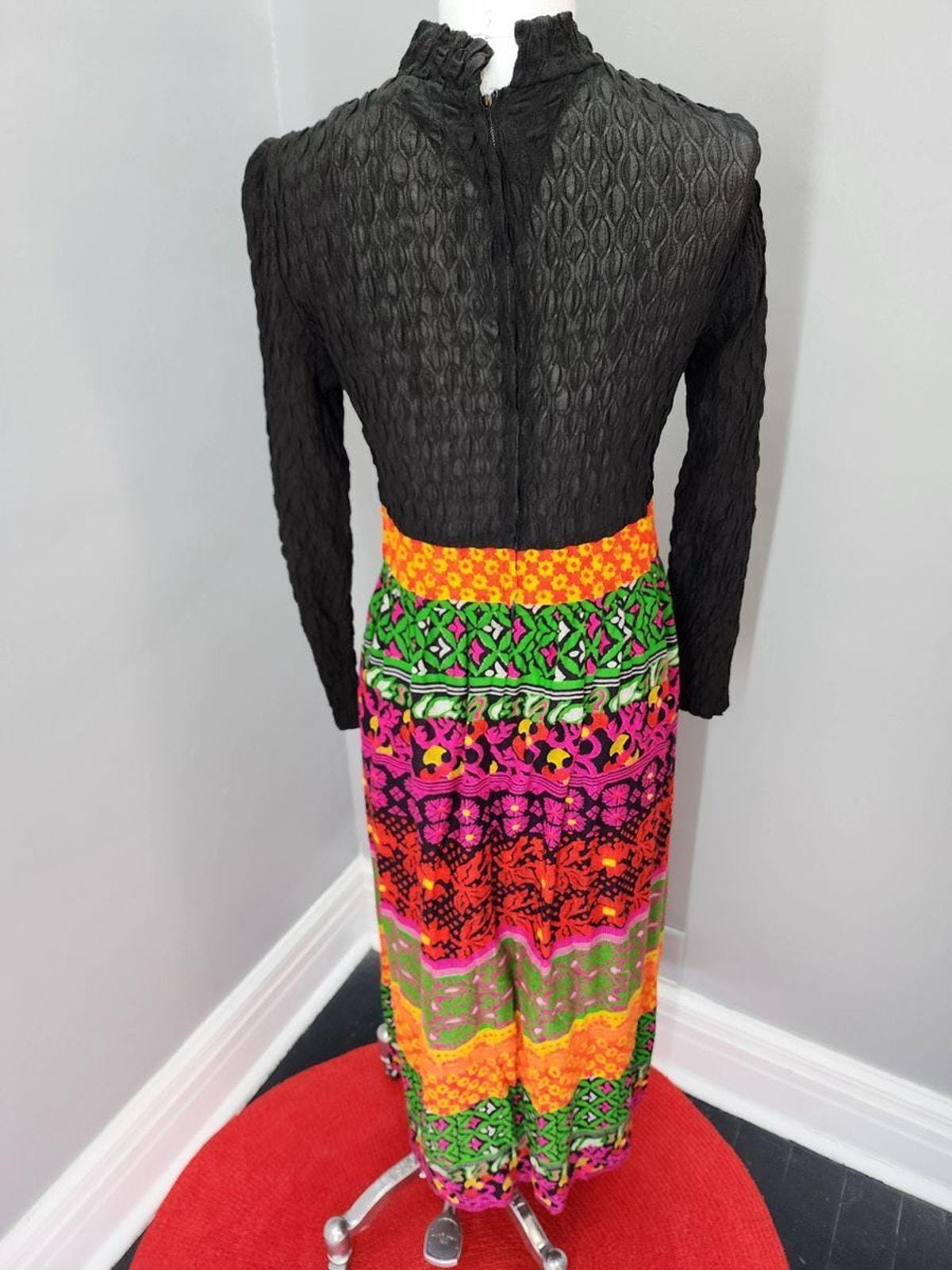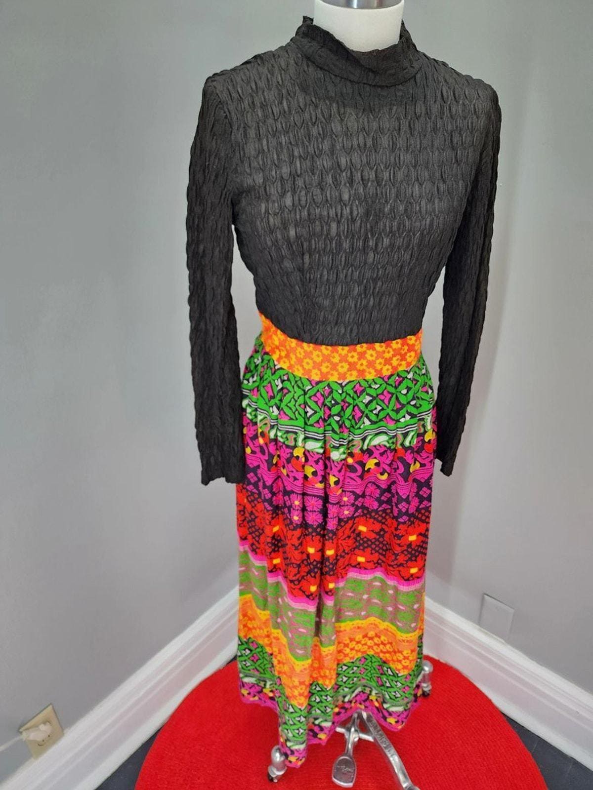 Bright and groovy, are the words to describe this late 60s, early 70s, maxi with its black sheer crinkled top, 20" metal zipper back closure, and a bright multi patterned skirt.