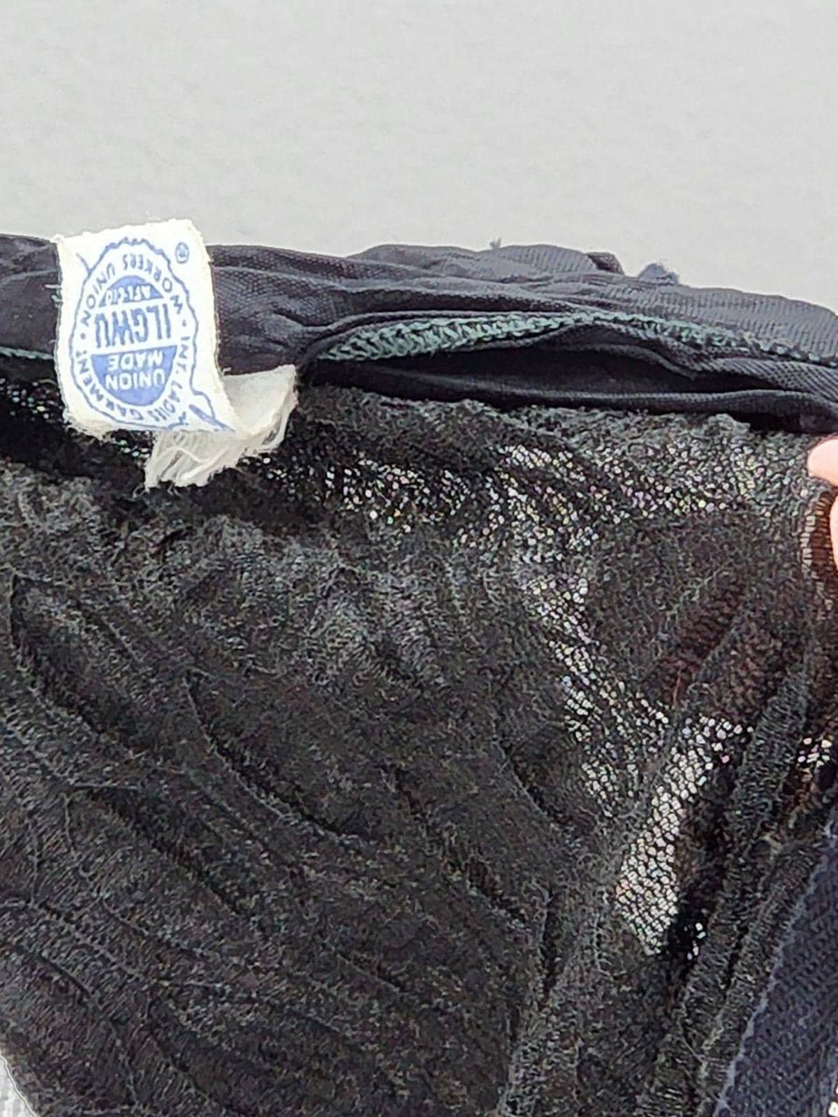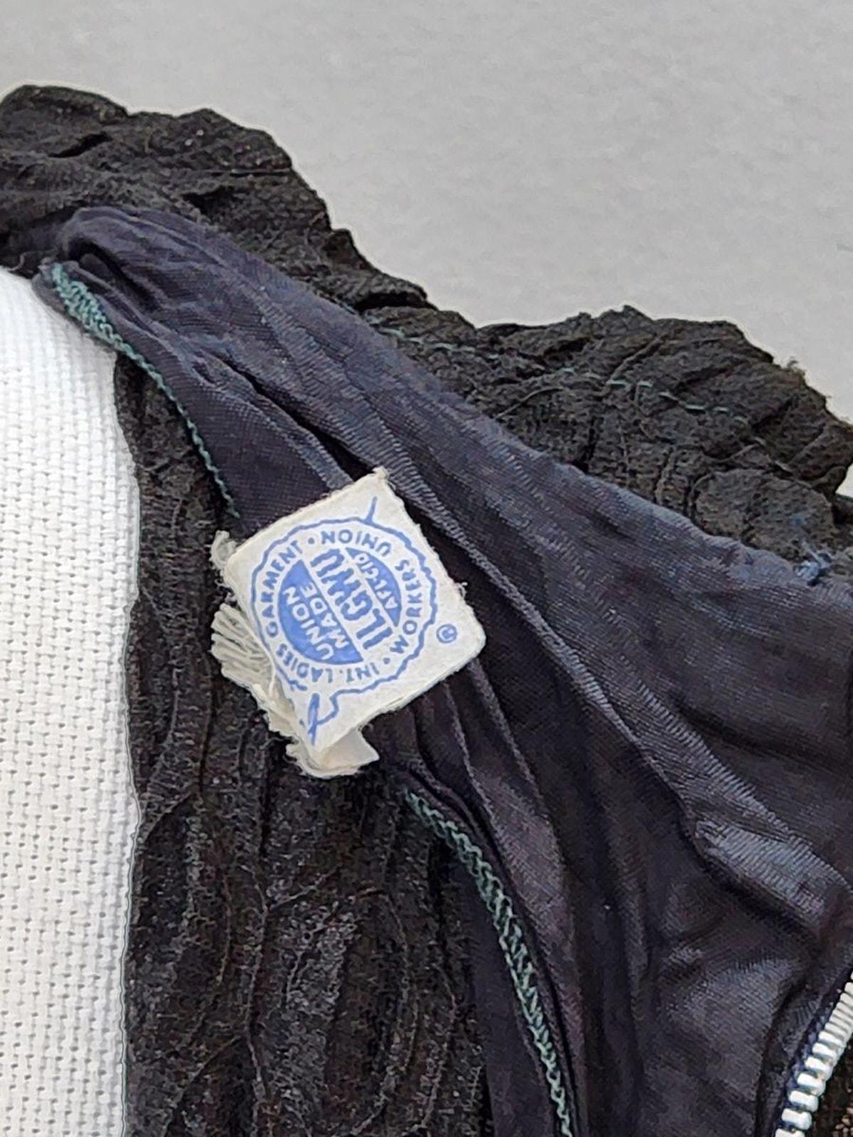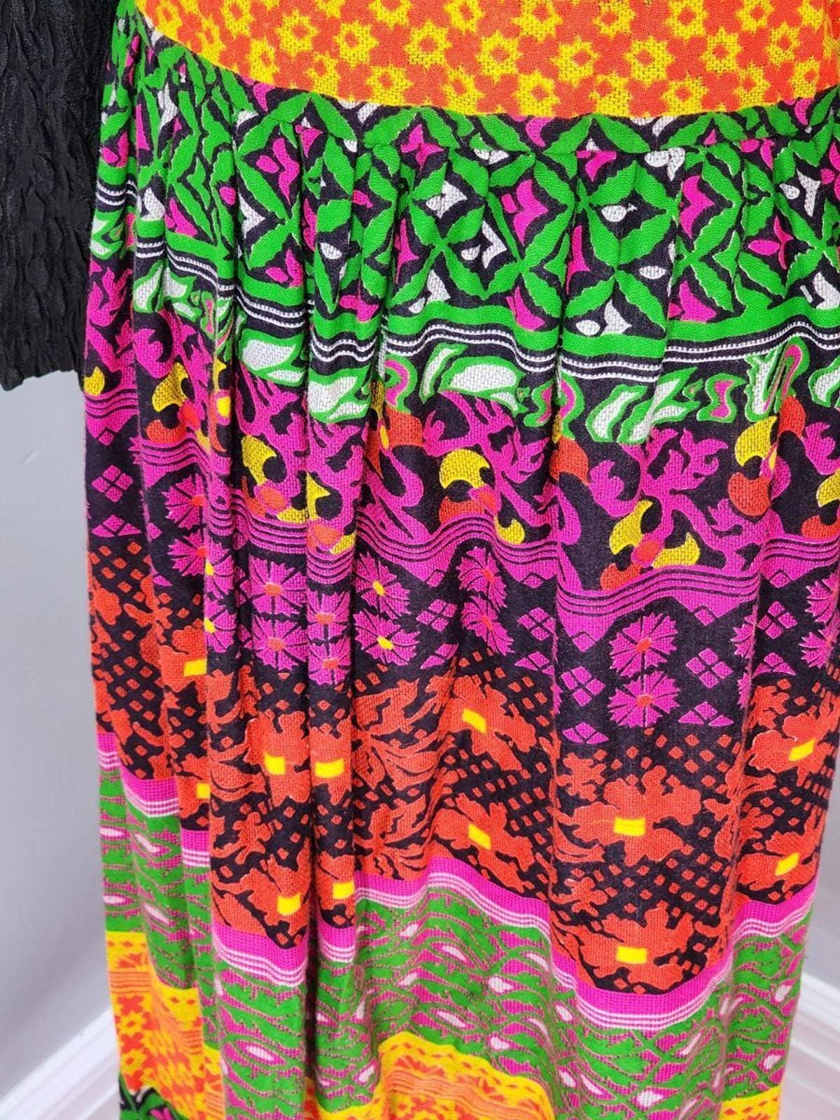 Bright and groovy, are the words to describe this late 60s, early 70s, maxi with its black sheer crinkled top, 20" metal zipper back closure, and a bright multi patterned skirt.