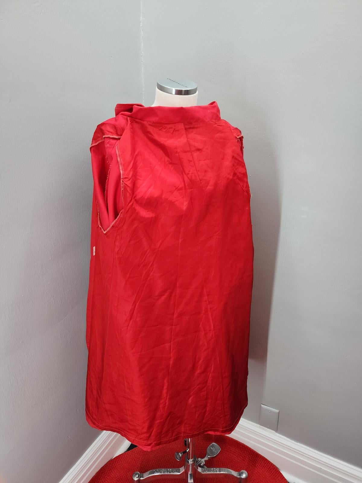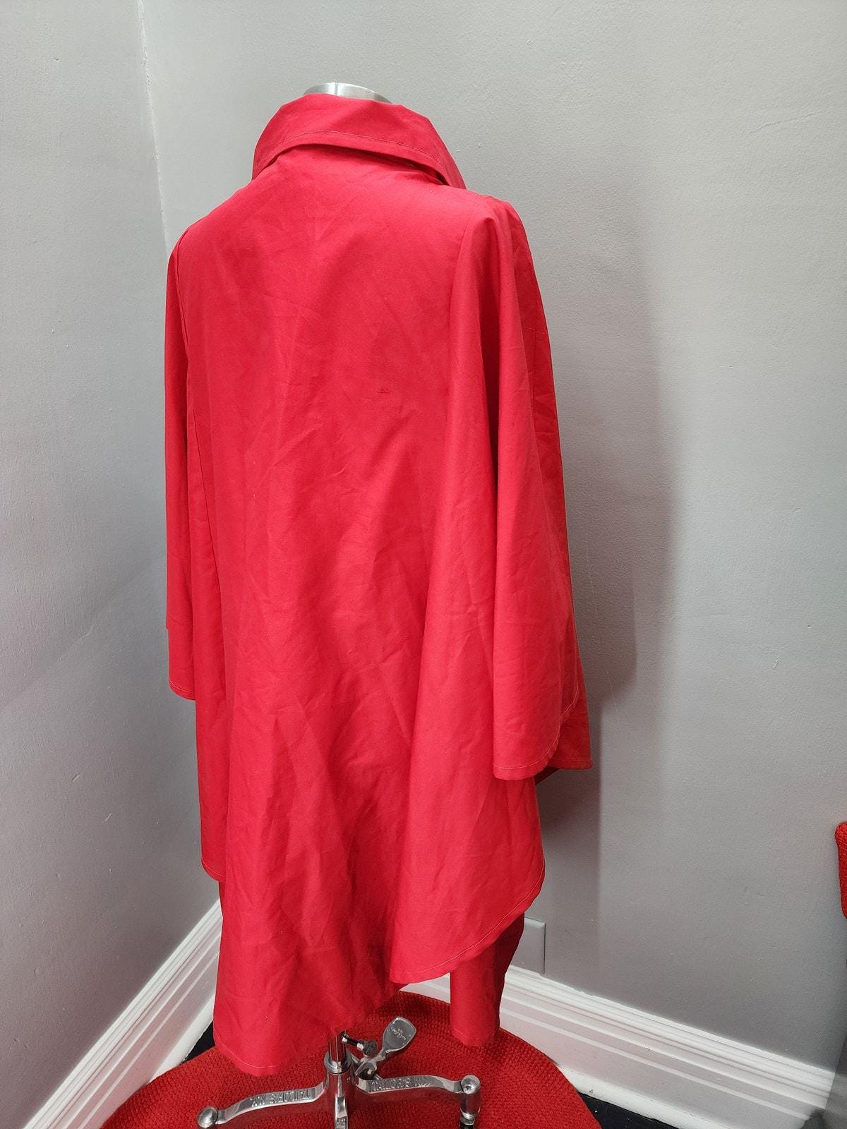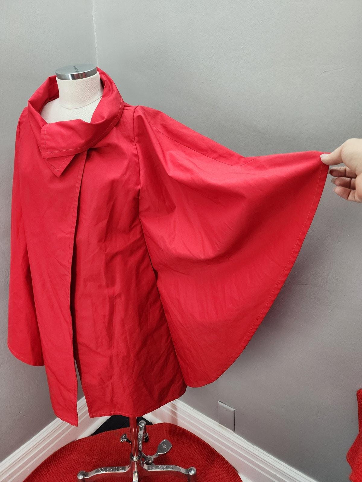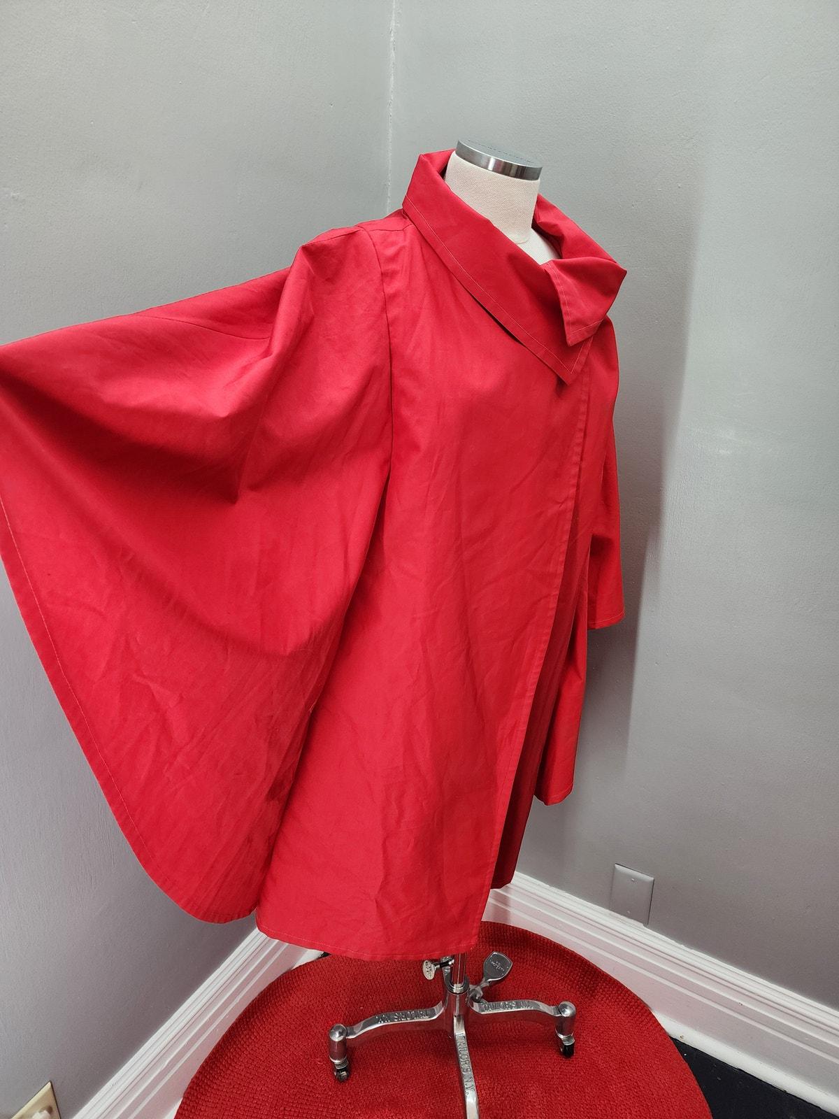 Super cute "cape" coat in a bright red. Two button closure at the neck, crossover button collar with huge full angel sleeves. Great little throw-over for a windy or rainy day!