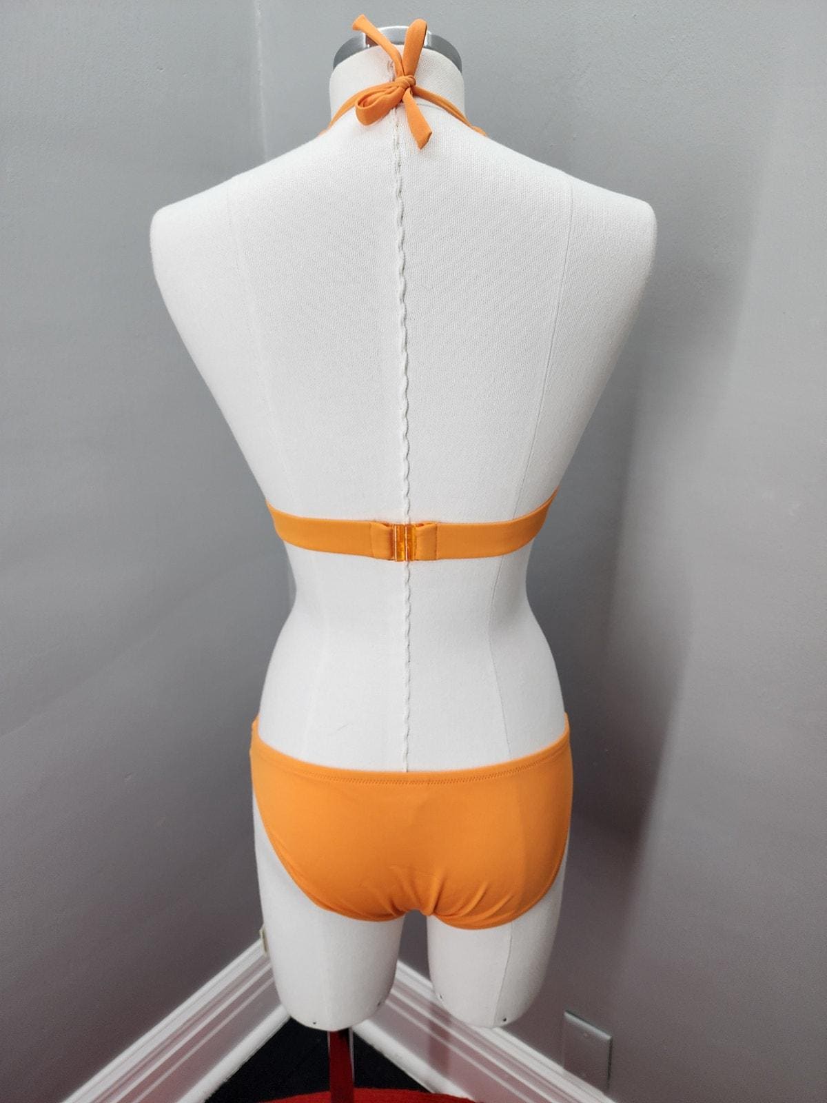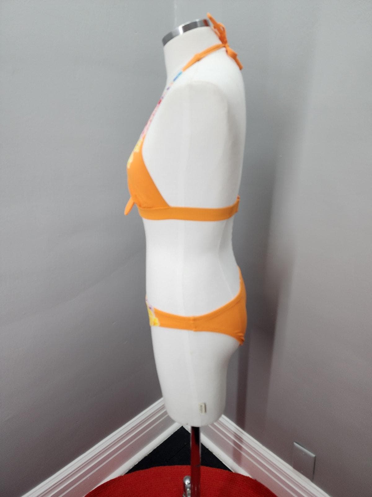 Cute halter top and low rise bikini bottoms. Orange Sorbet color with bright floral pattern on the front. No padding in halter top.