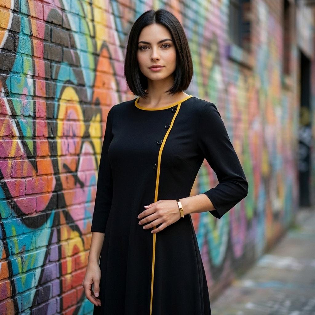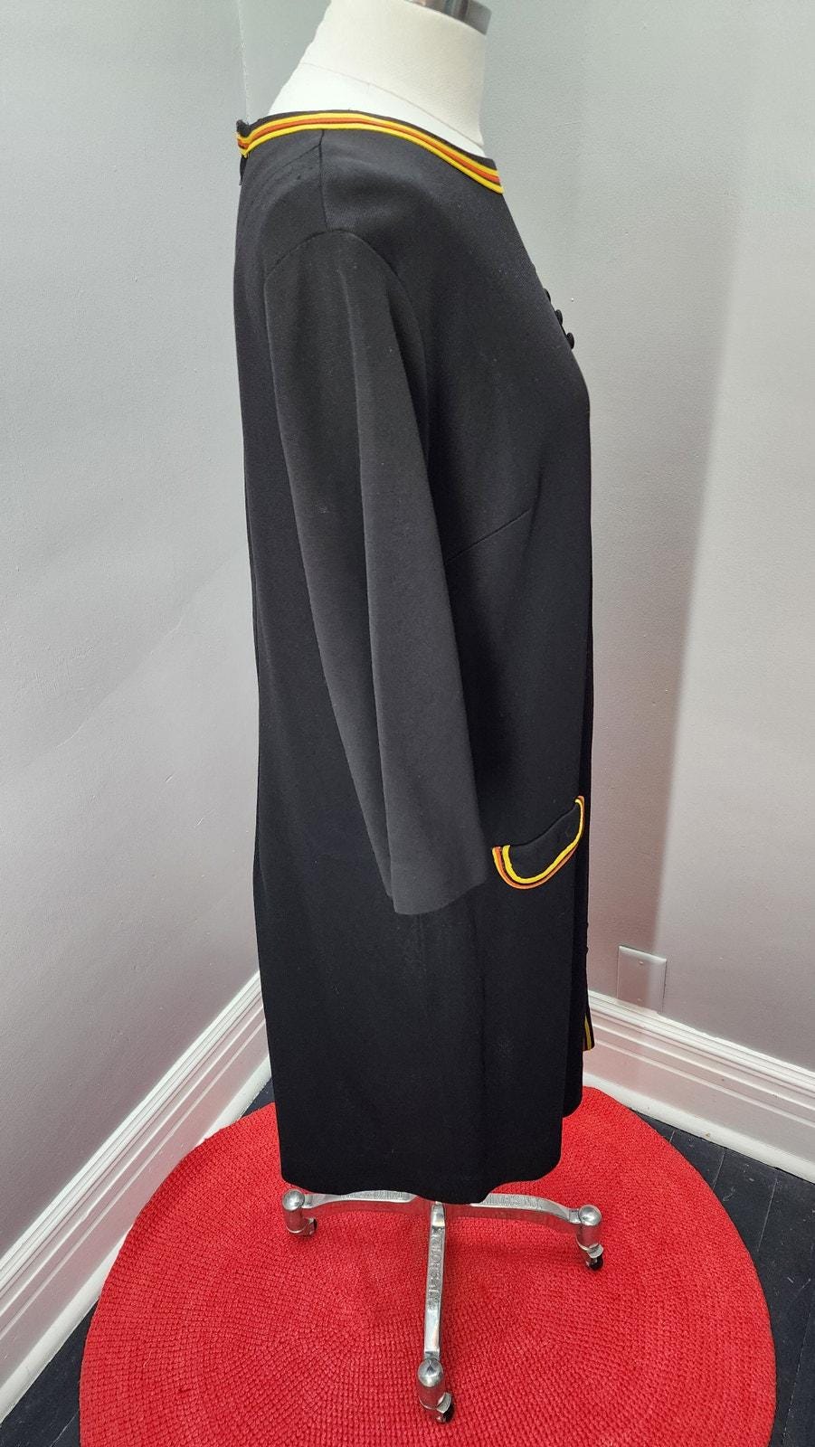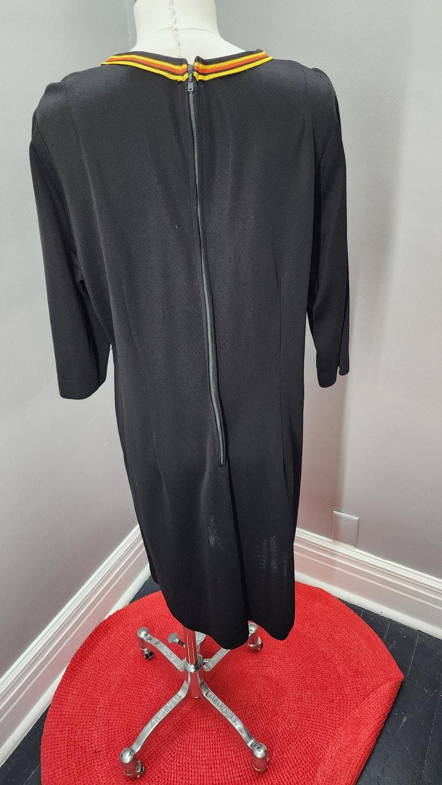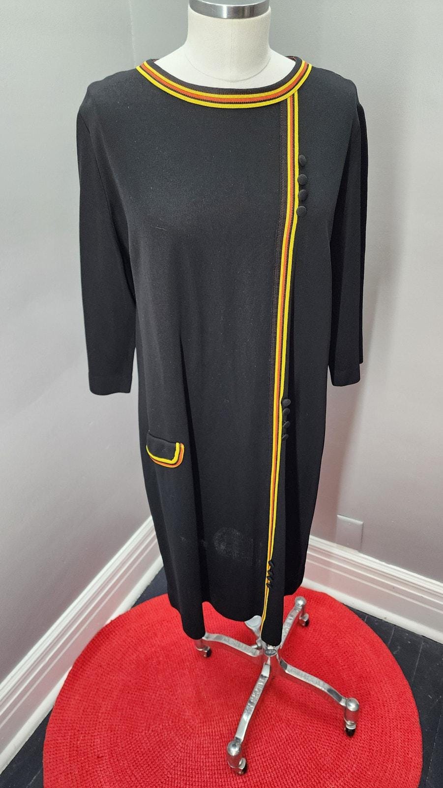 This striking black knit shift dress features bold yellow and orange trim that frames the neckline, runs down the front, and accents the hip pocket for a chic mod look reminiscent of the era’s graphic color-play.