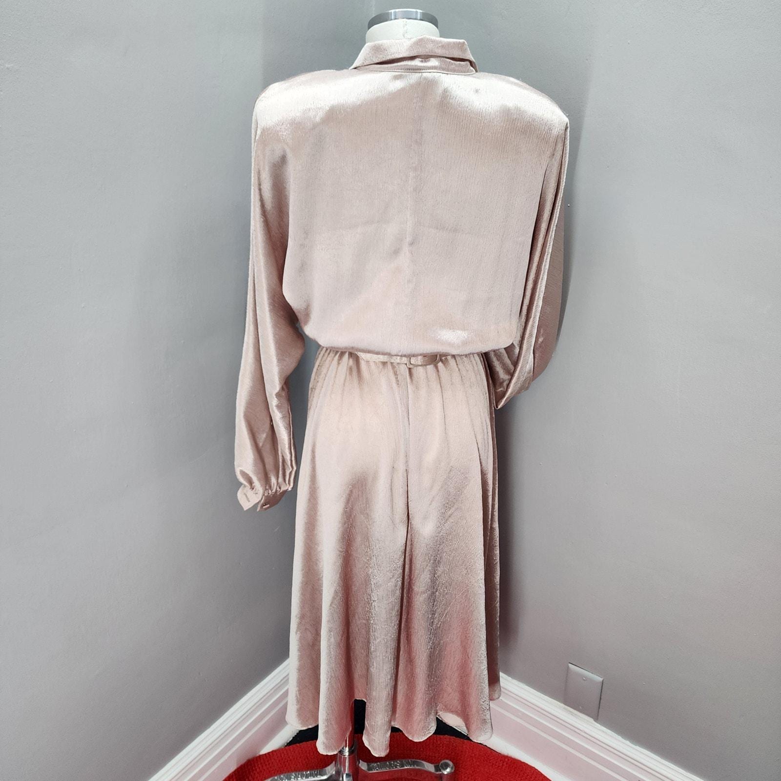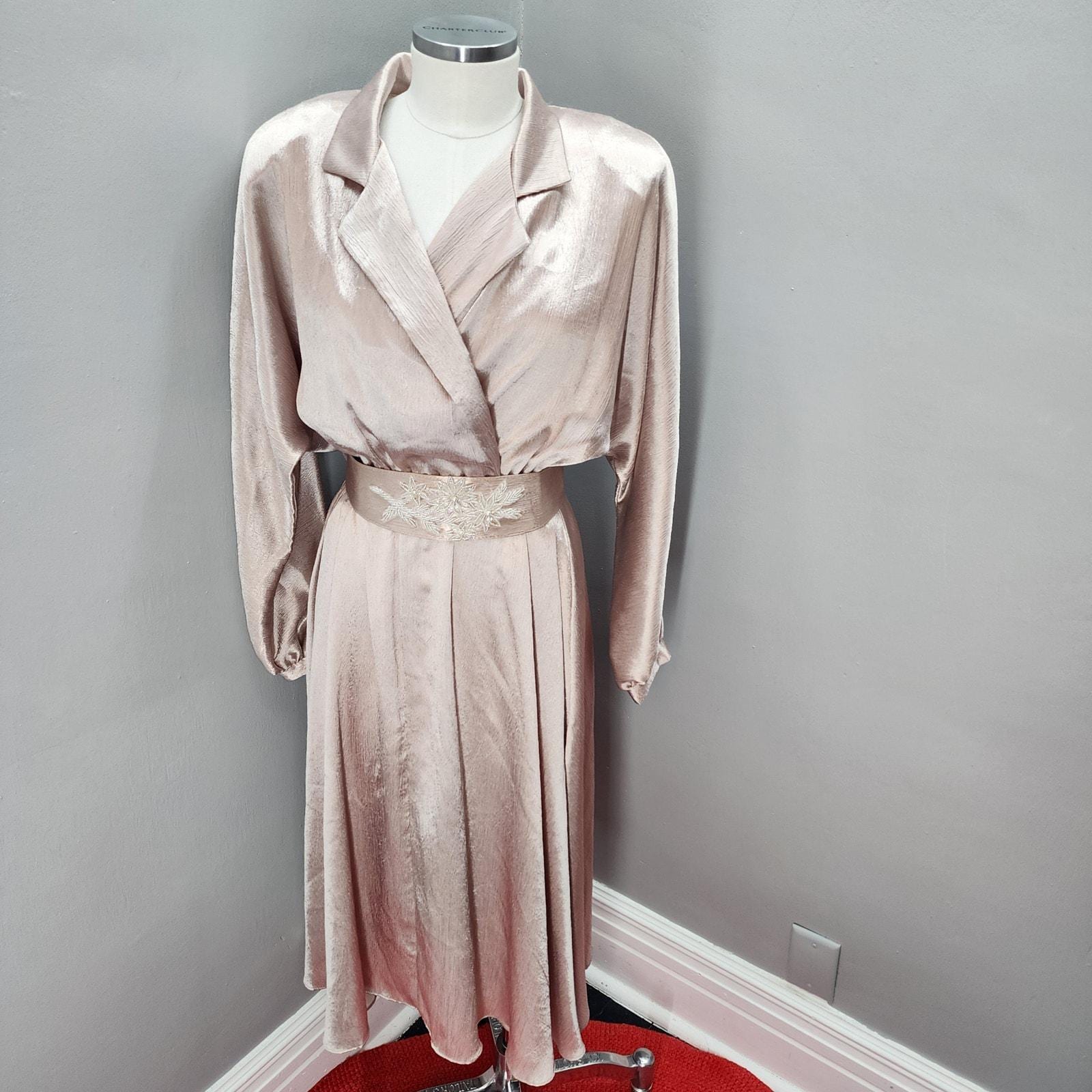 Elegant yet casual wearing Vintage Samantha Black dress in a shiny champagne polyester. Surplice neckline, dolman sleeve, classic 80s large shoulder pads, elastic waist, original belt, huge flowy sweep. Easy wearing, easy traveling dress.