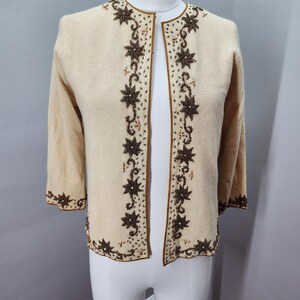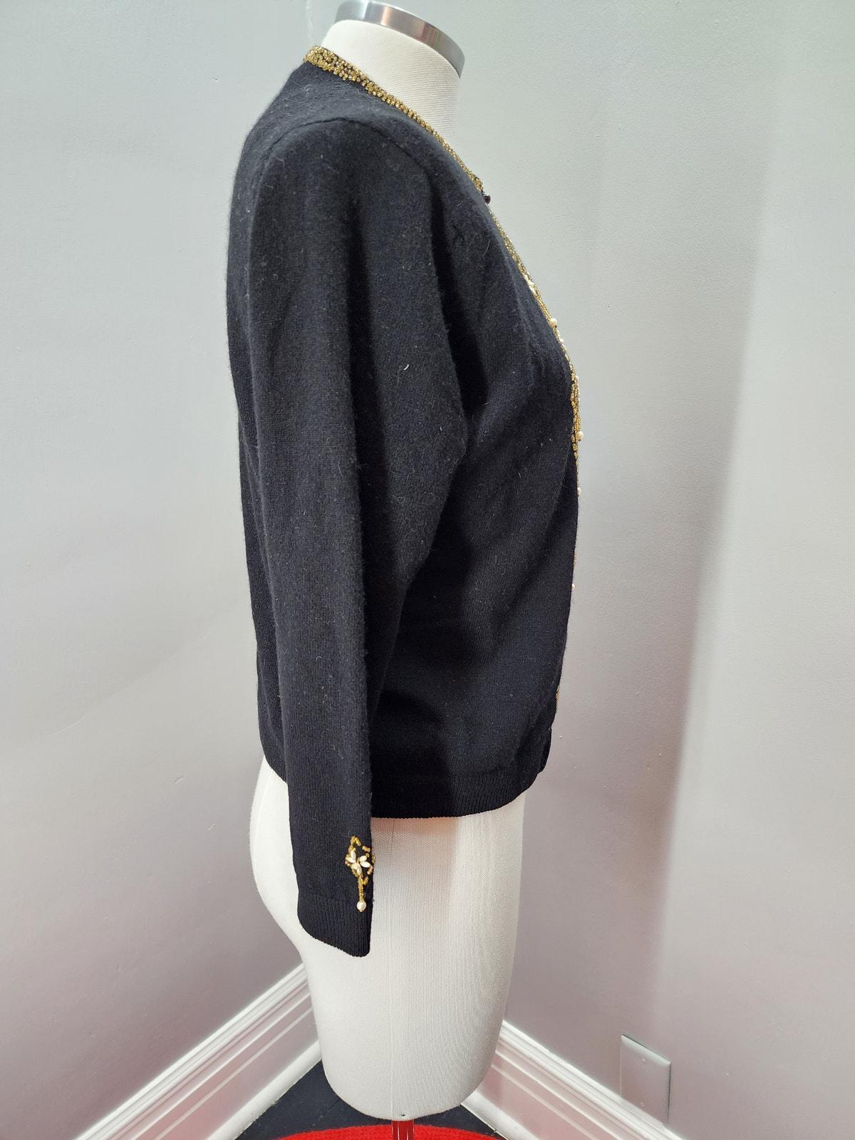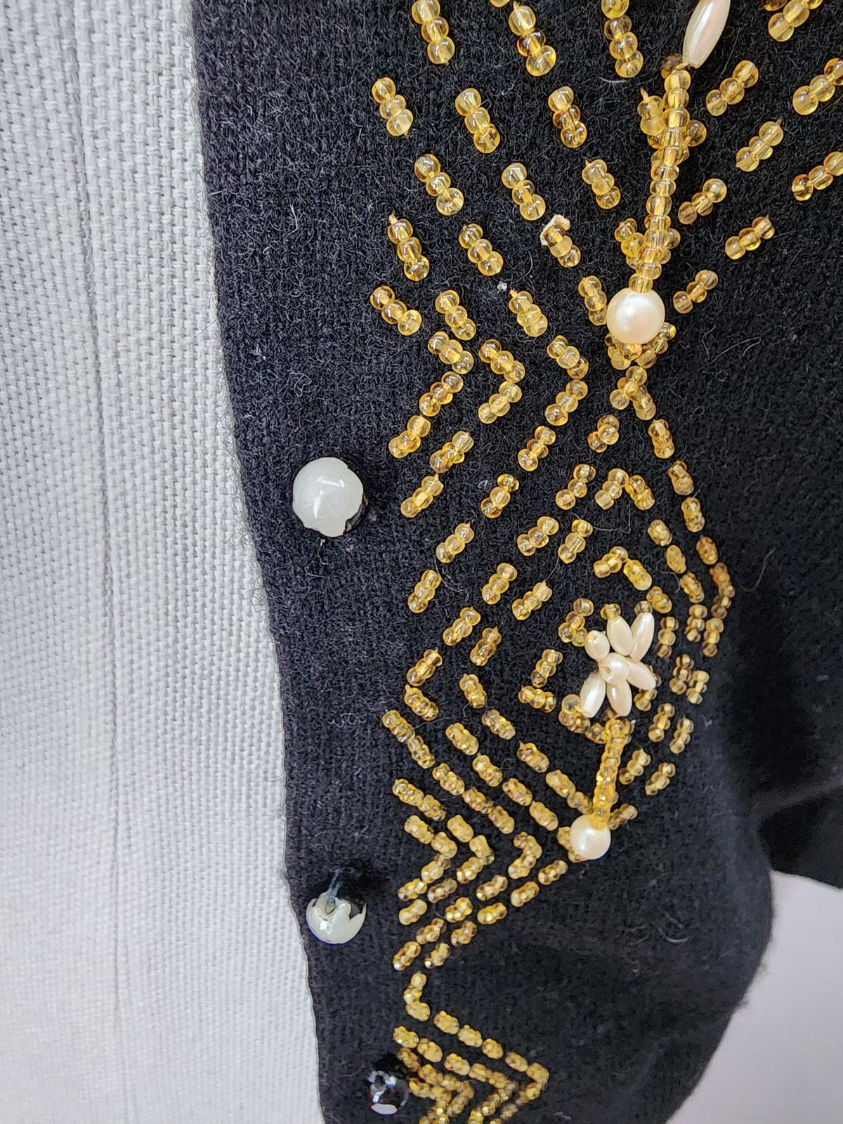 Beautiful 1950s black Angora/Lambswool Cardigan with pearl and gold colored beads. Silk lined bodice, 3/4 sleeves.