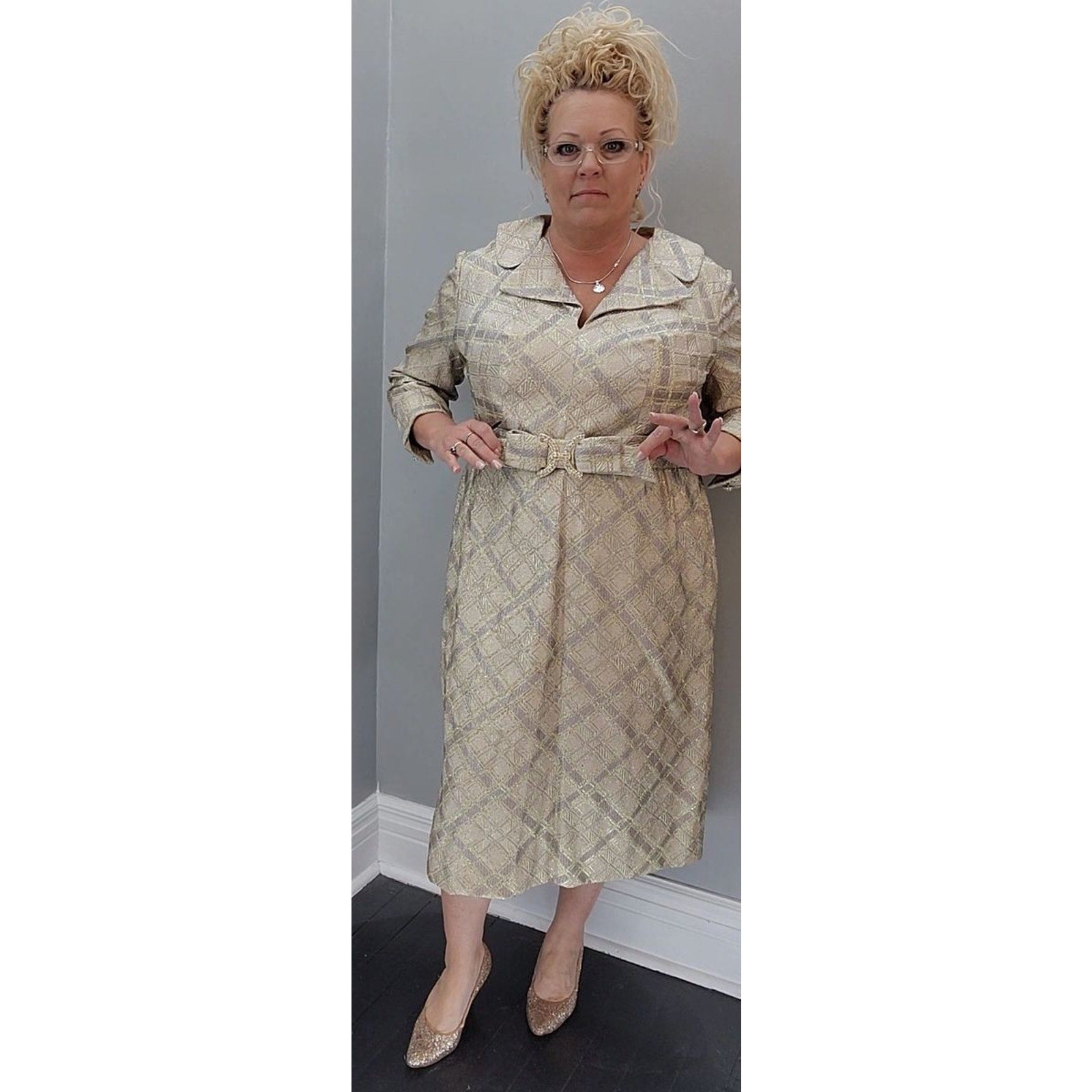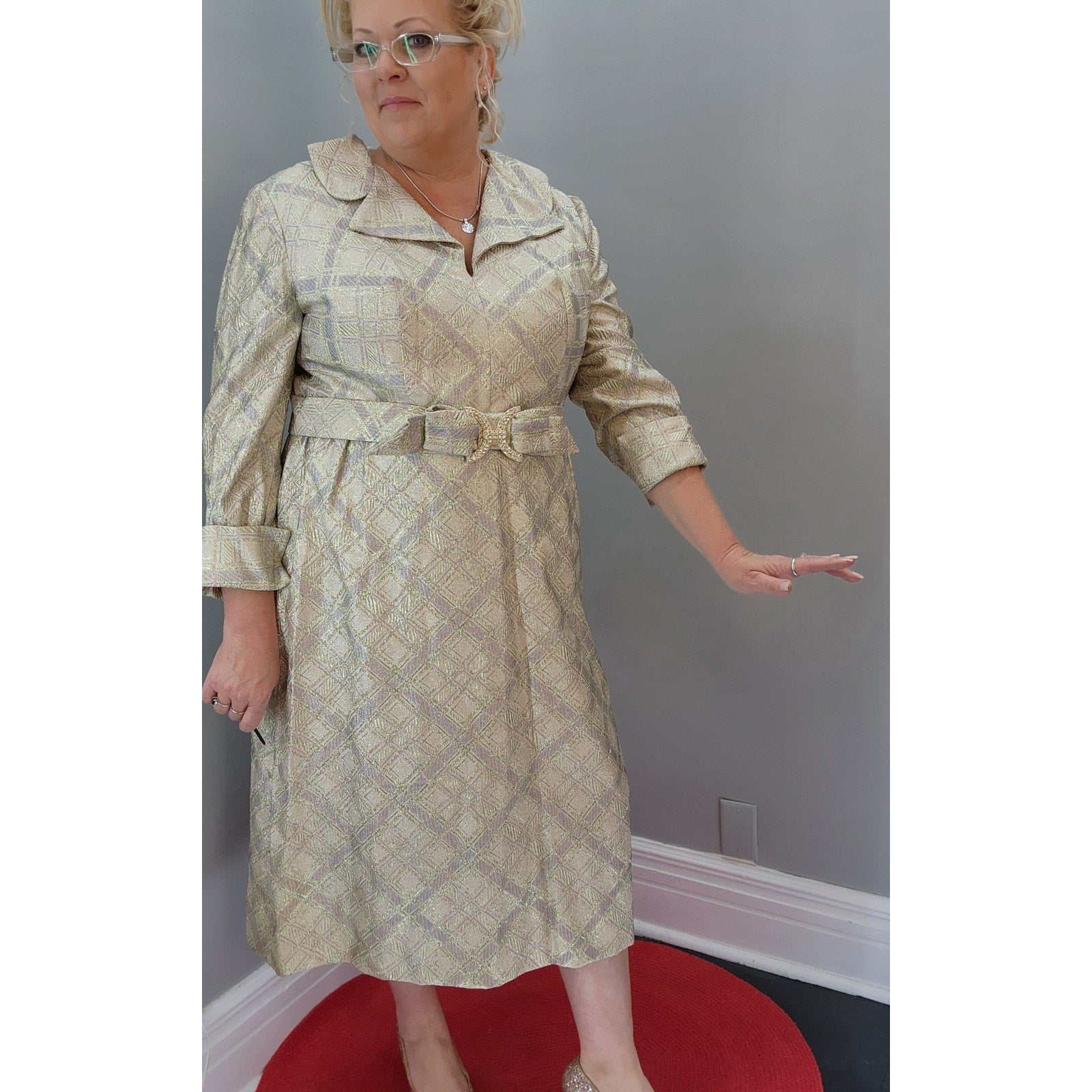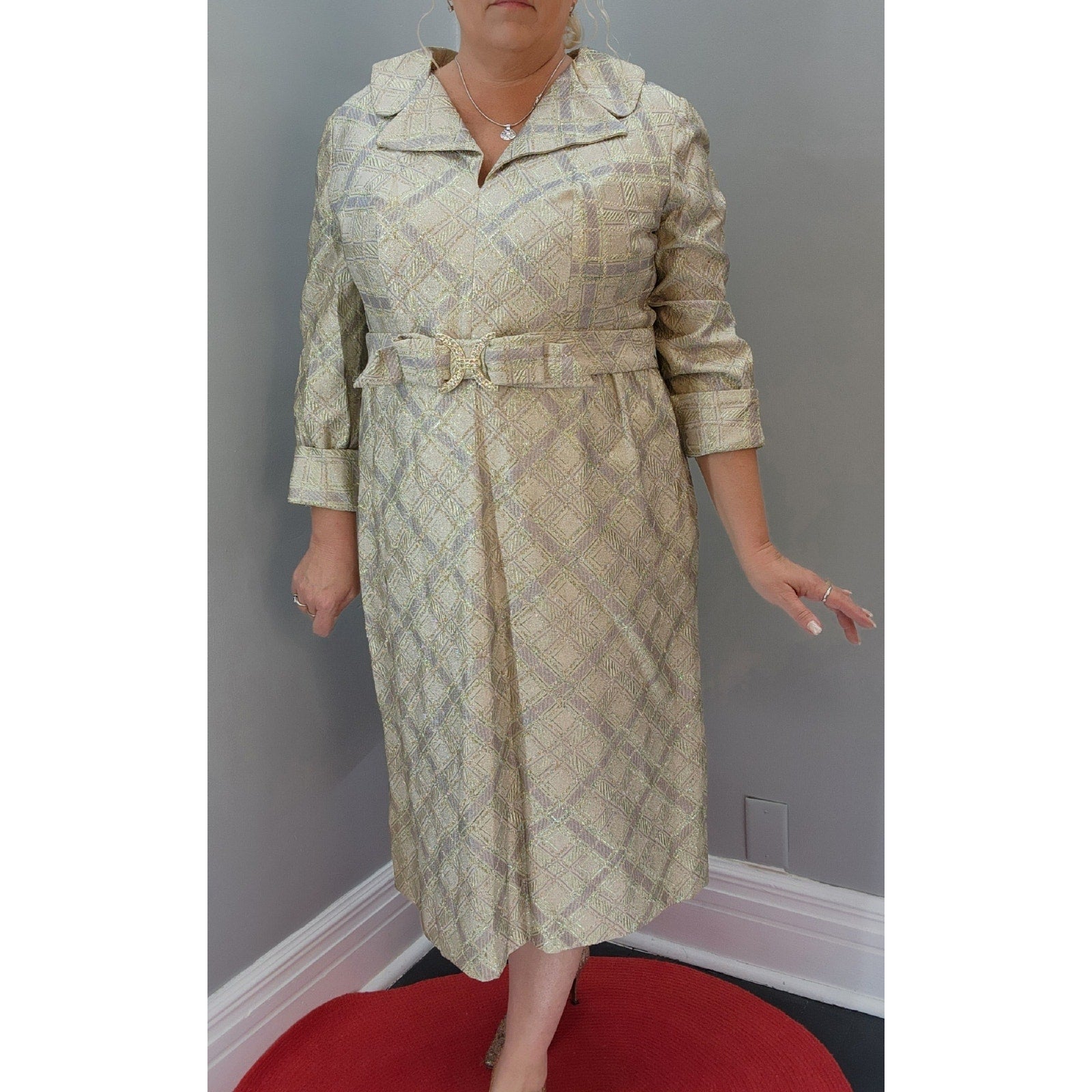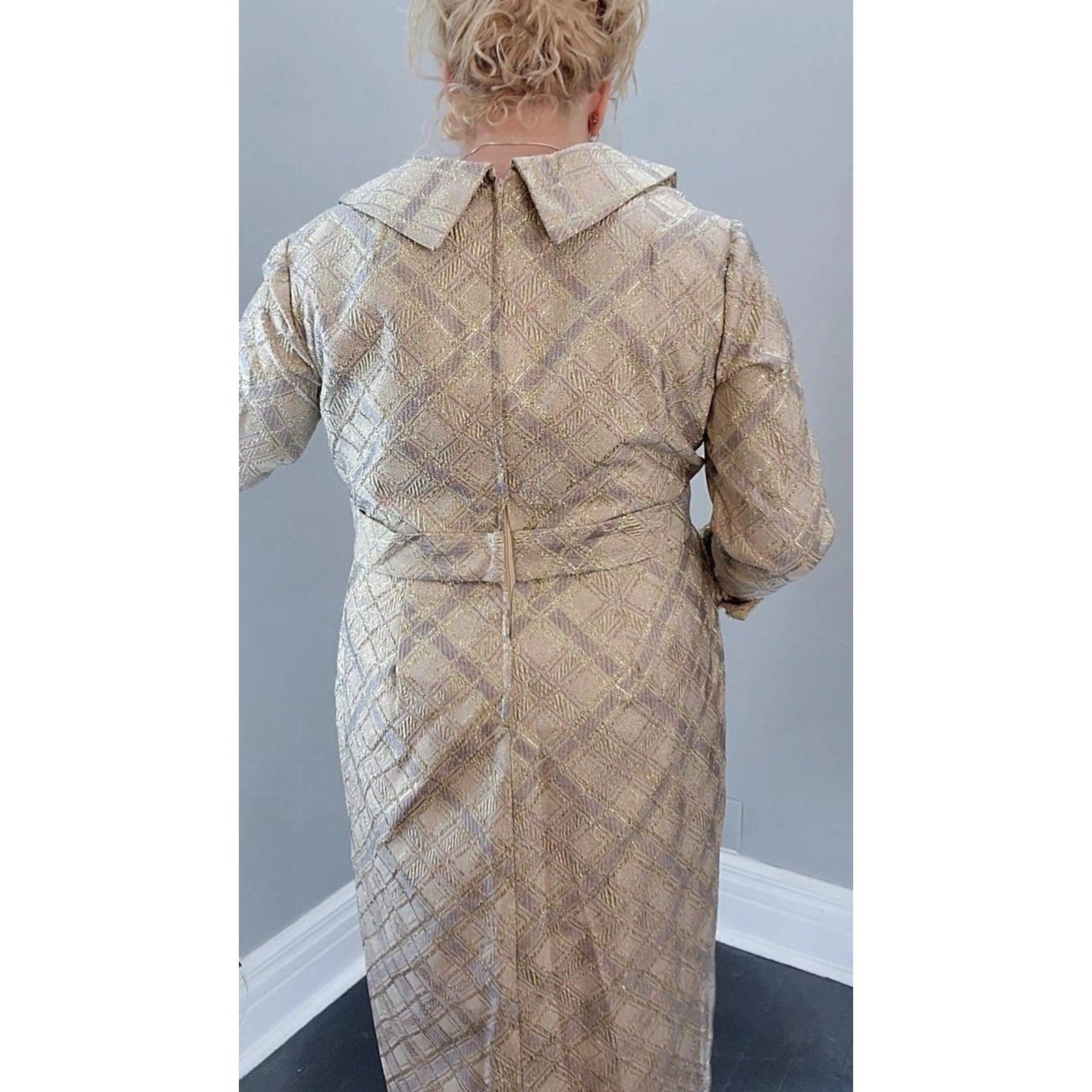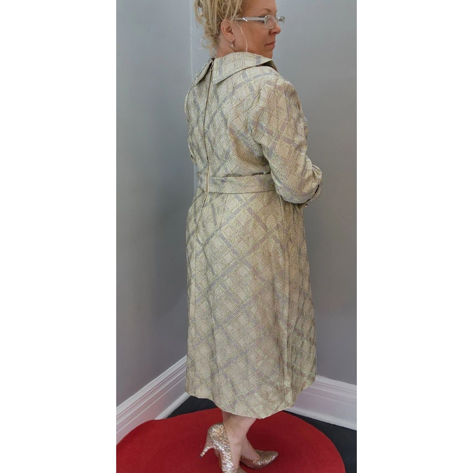 Excellent 1950's metallic lamé dress. Perfect for that holiday party or a night out on the town.