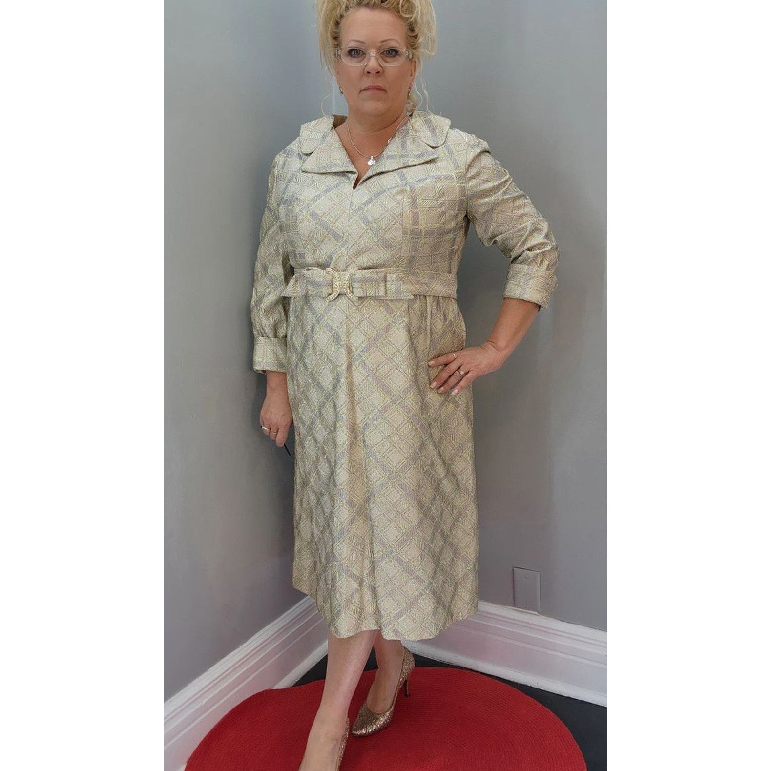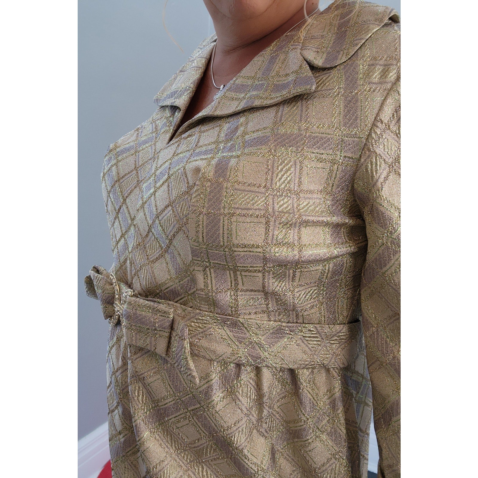 Huge collar, attached belt with rhinestone buckle, 3/4 sleeves have a french cuff look with rhinestone button detail. Fully lined. Metal zipper back closure.