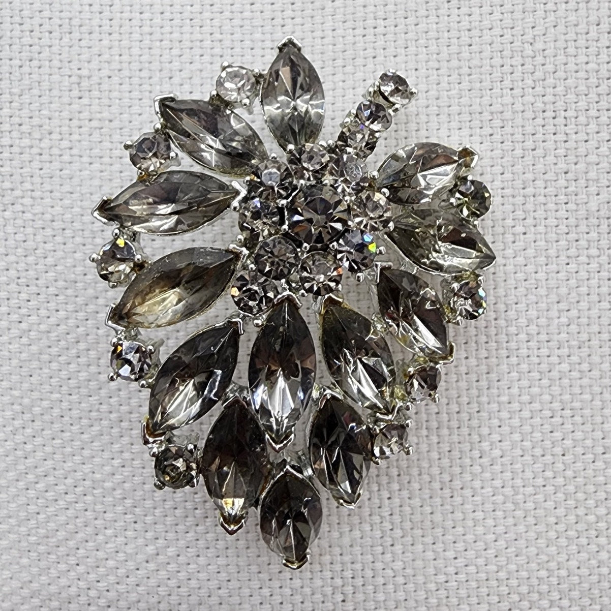 50s Vintage Weiss Lapel Brooch Pin, Smokey Grey Rhinestone, Silver Hardware