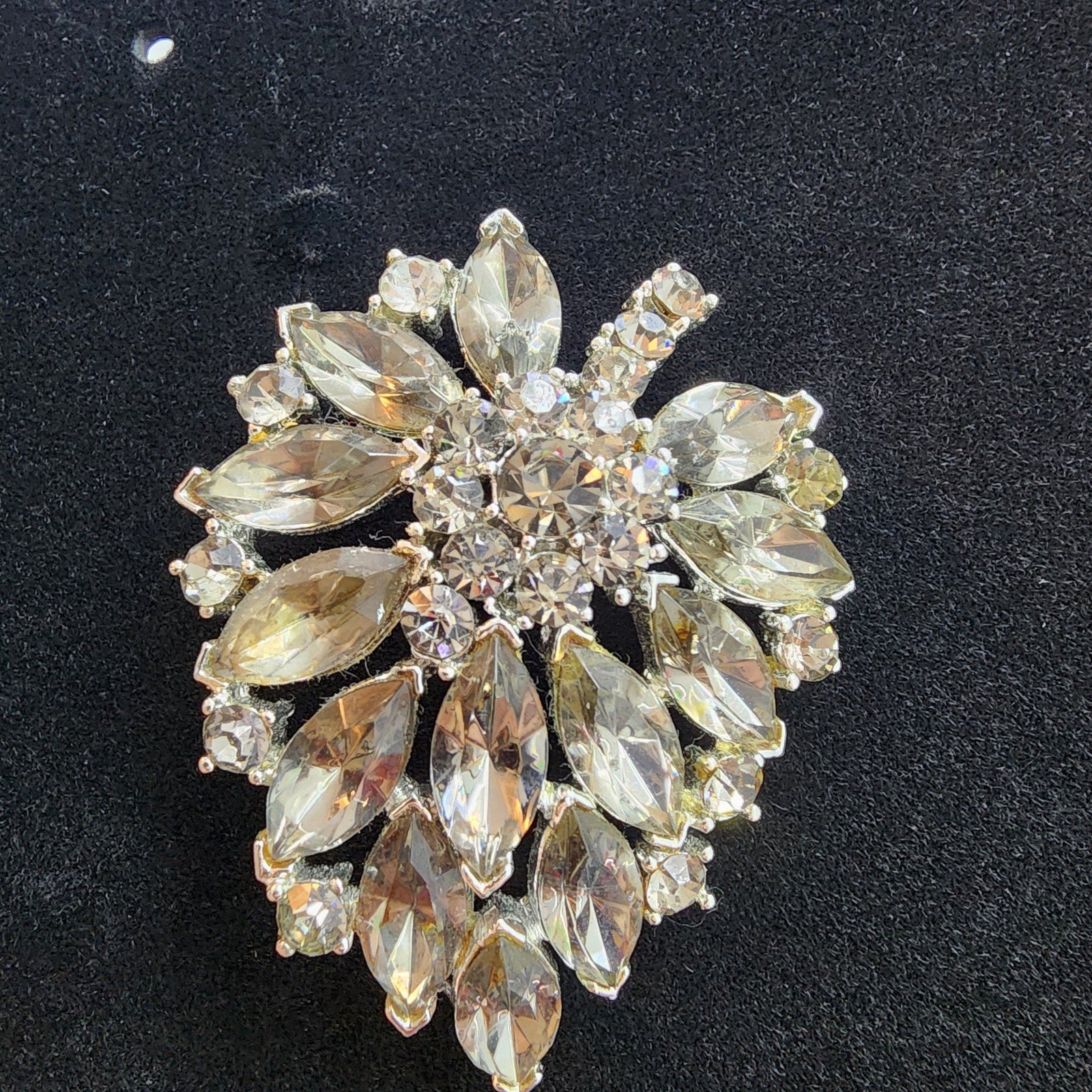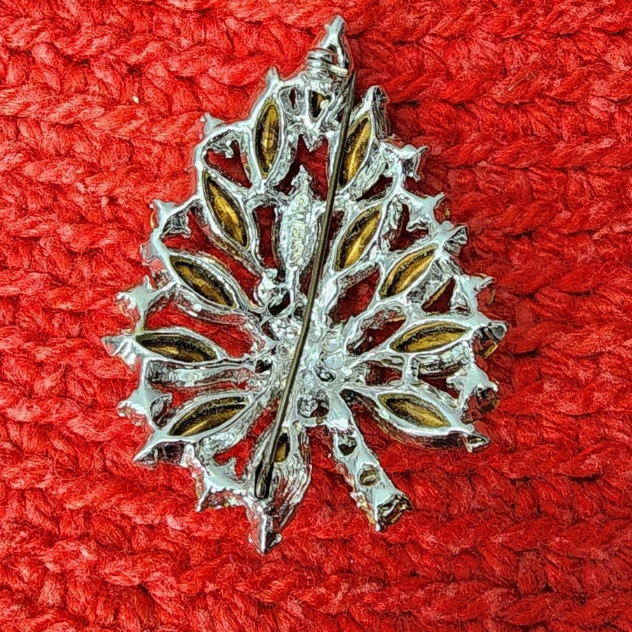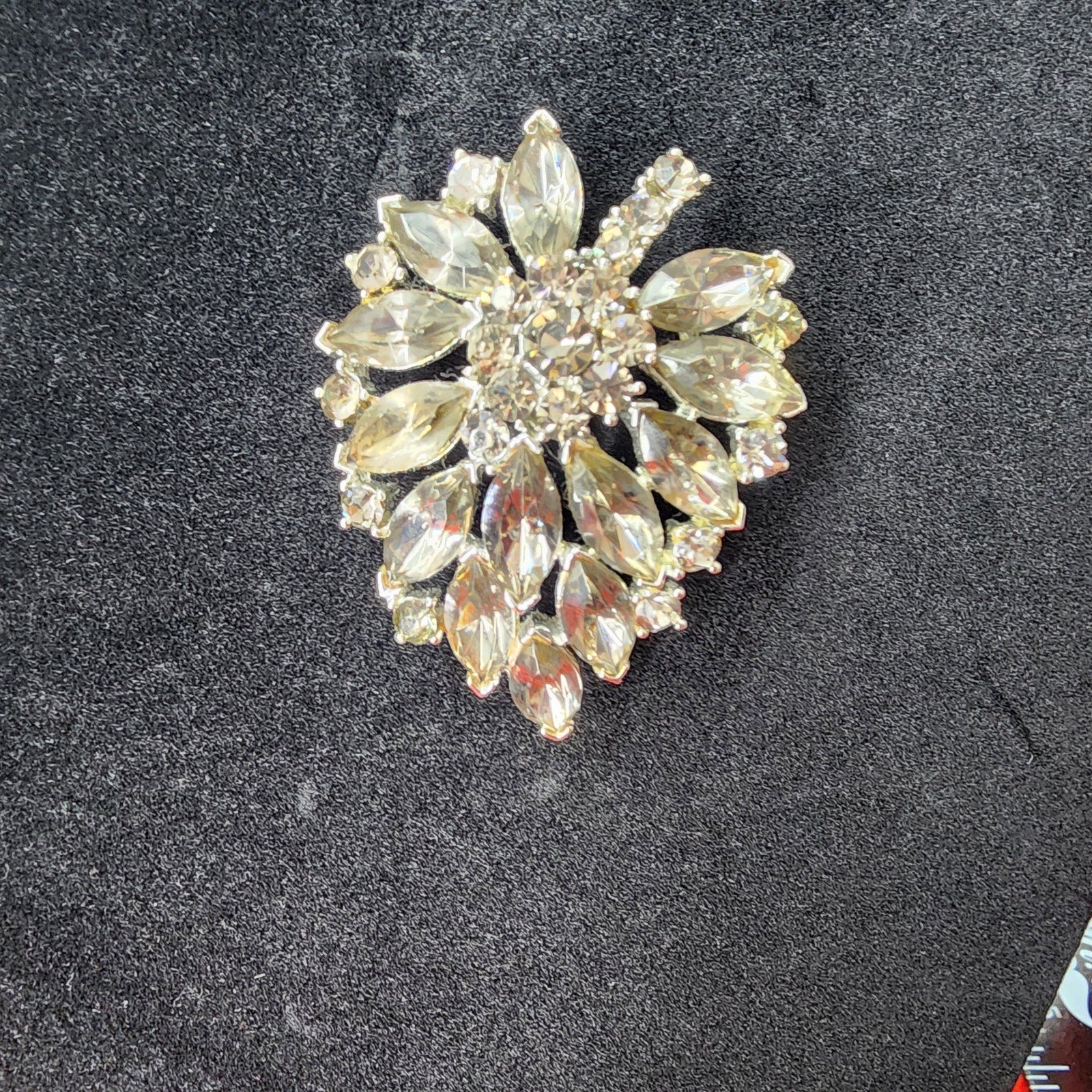 Beautiful Weiss broach. Leaf design with silver tone hardware and Smokey grey marquise rhinestones. Nice weighty piece.