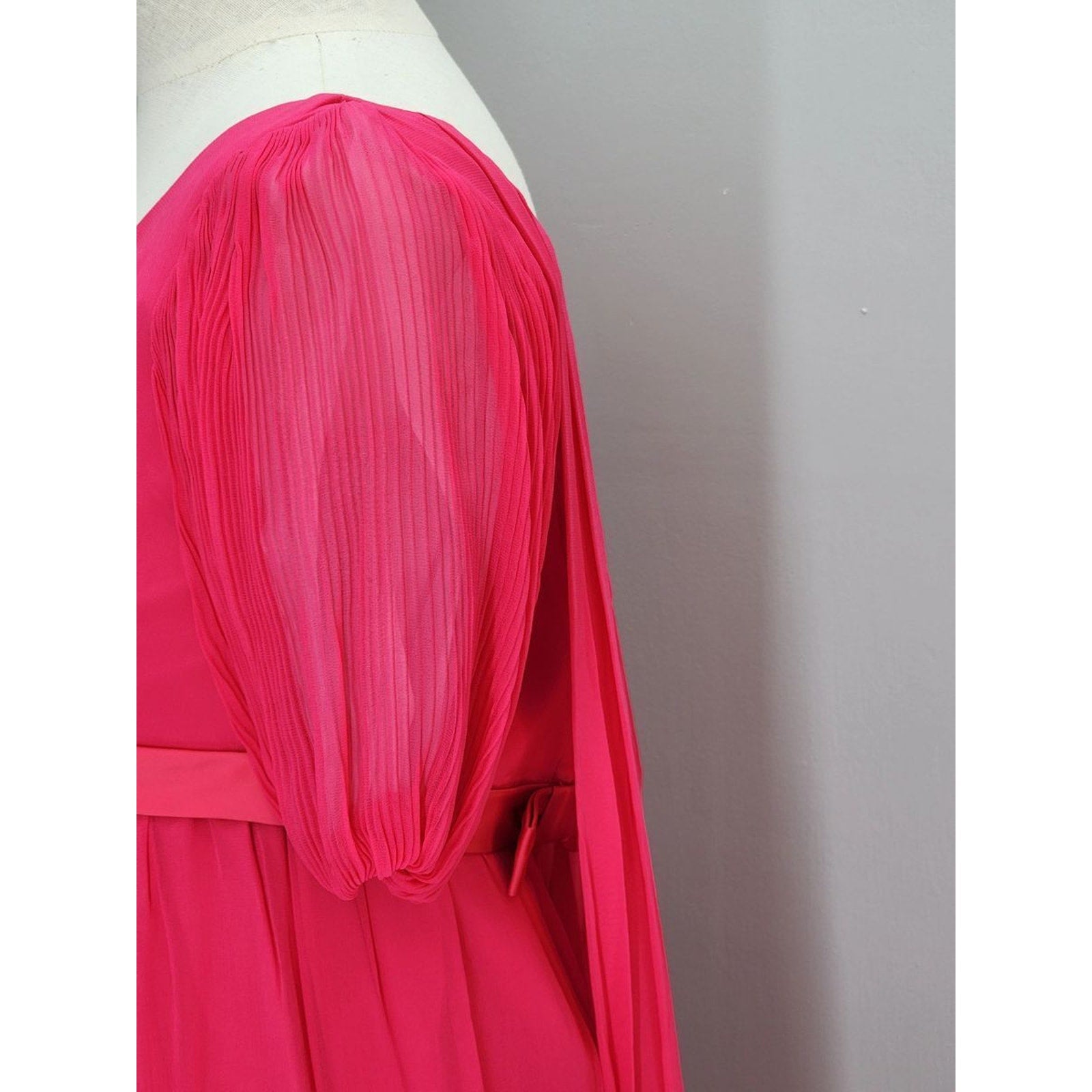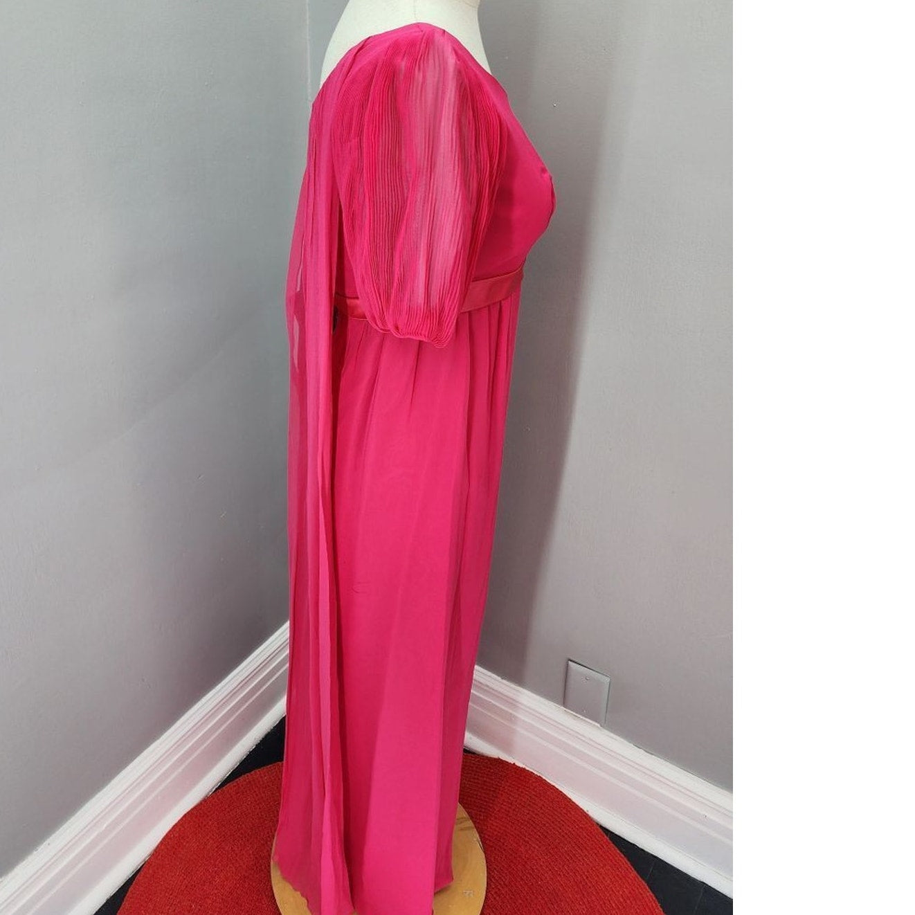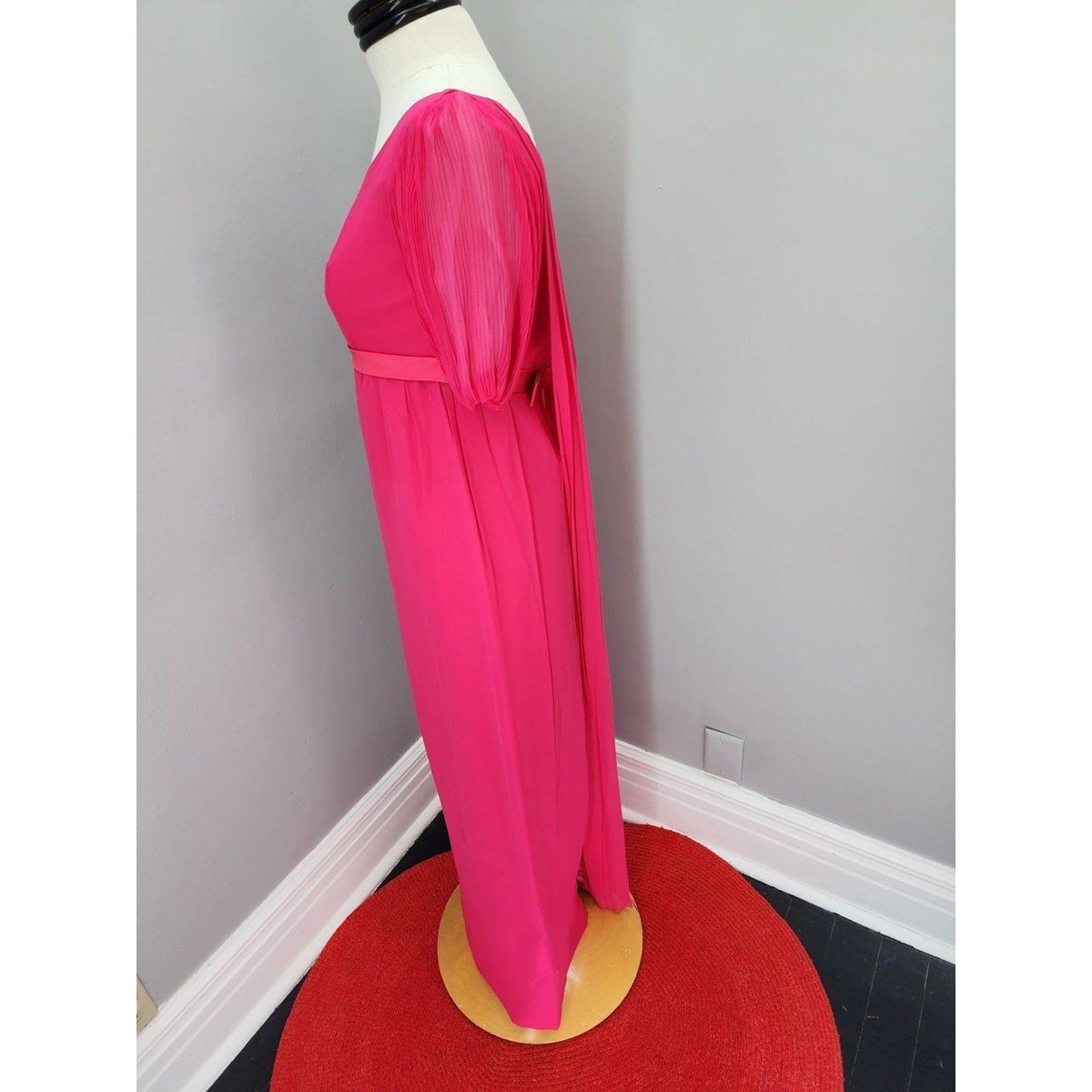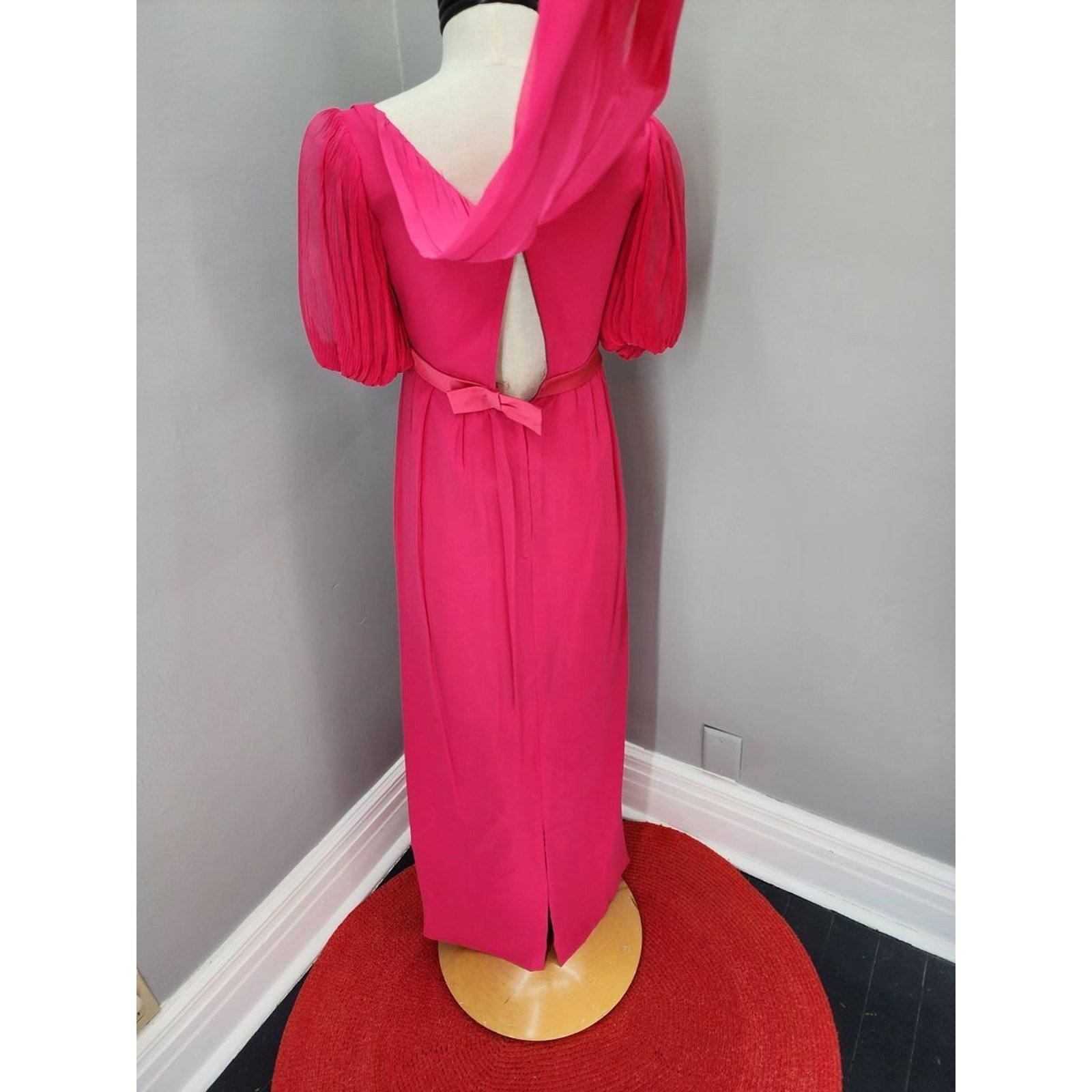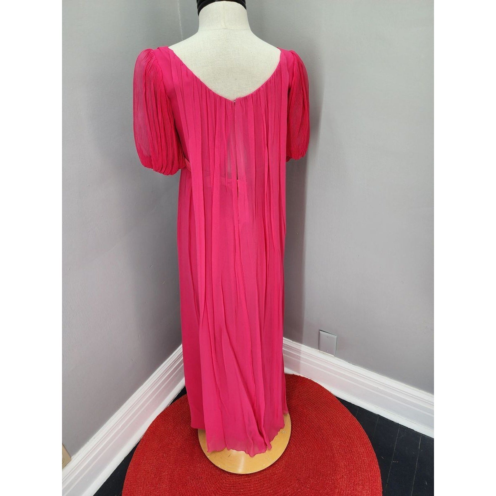 This sweet gown has accordion pleated, puffy chiffon sleeves, chiffon watteau train that hangs from the shoulders, 16" metal zipper in back.