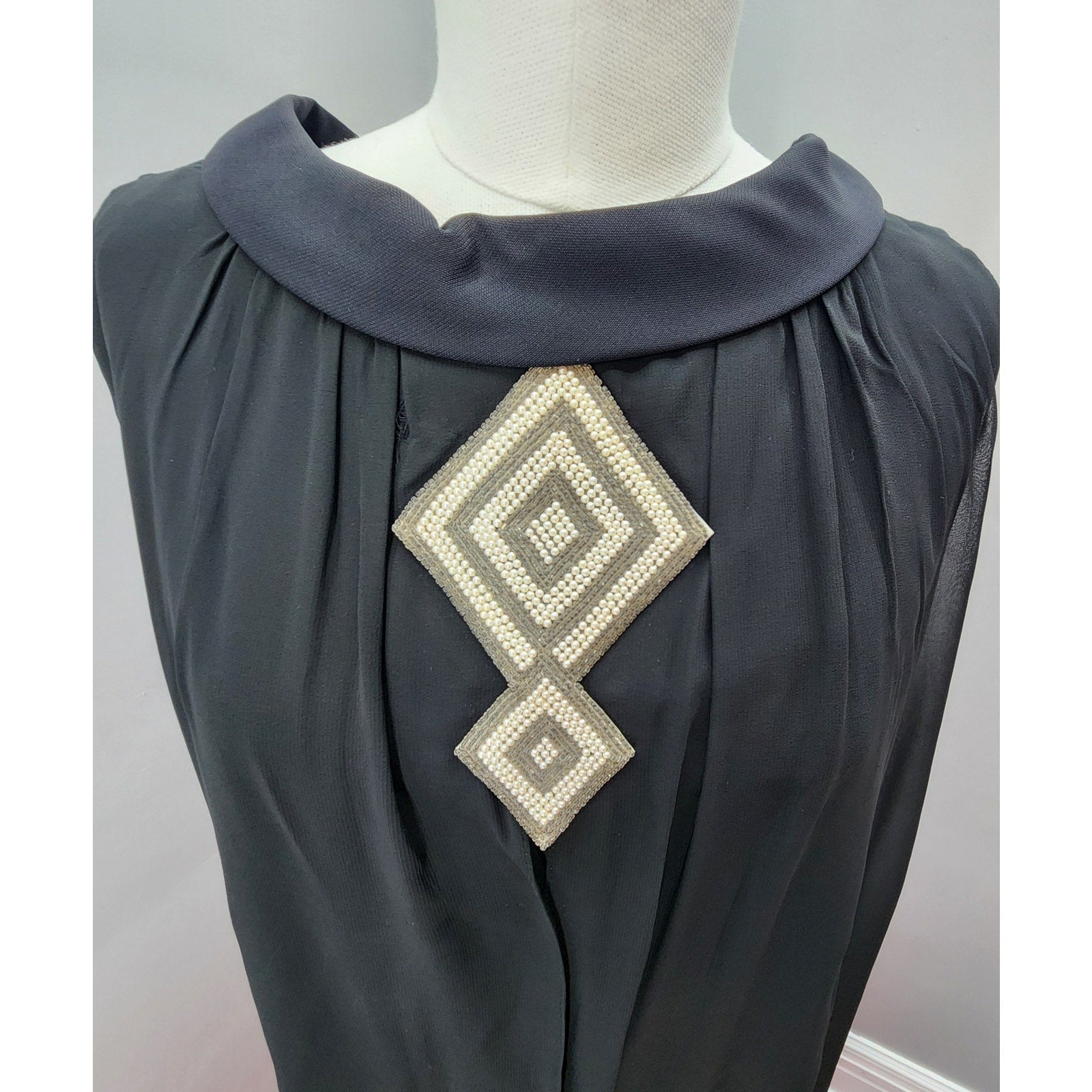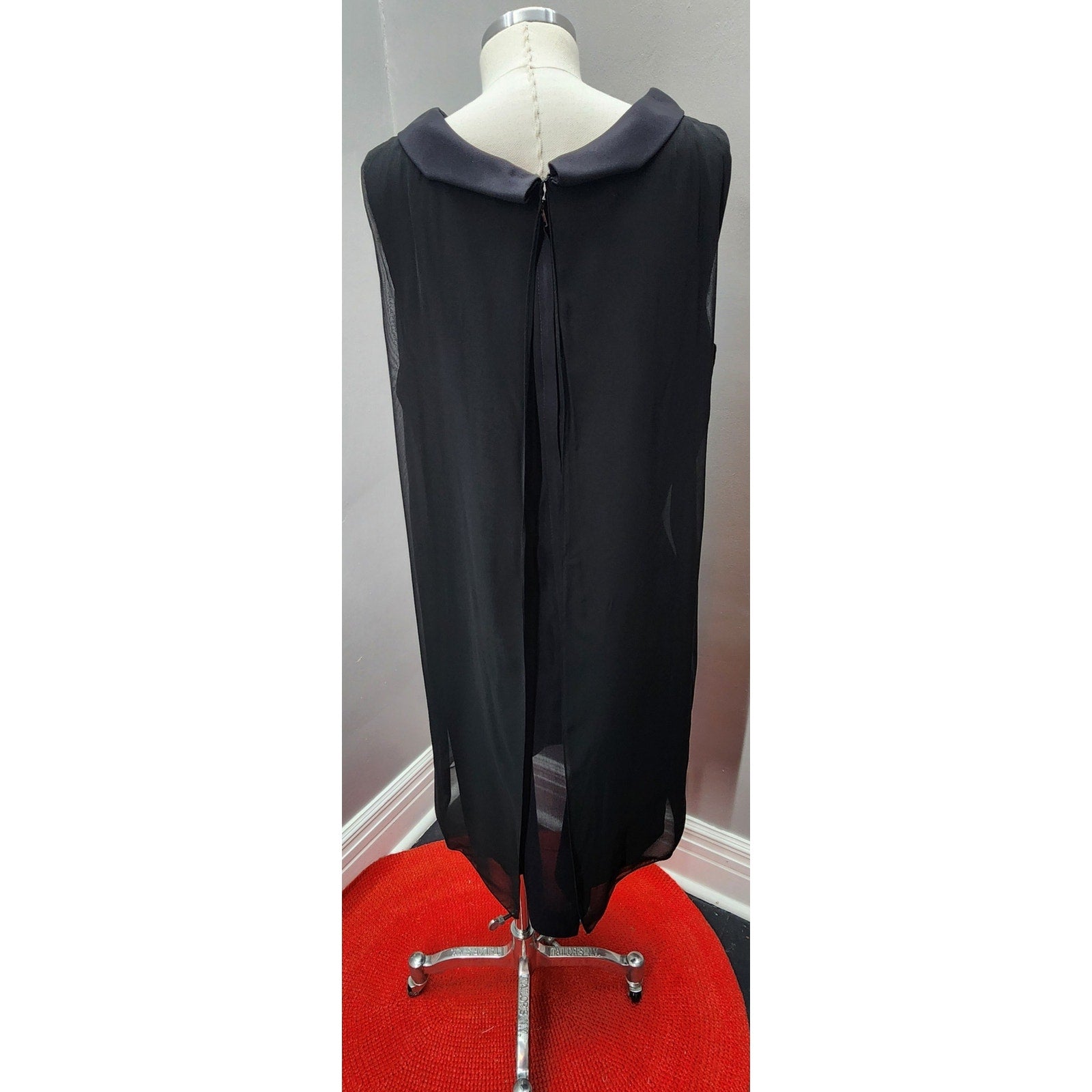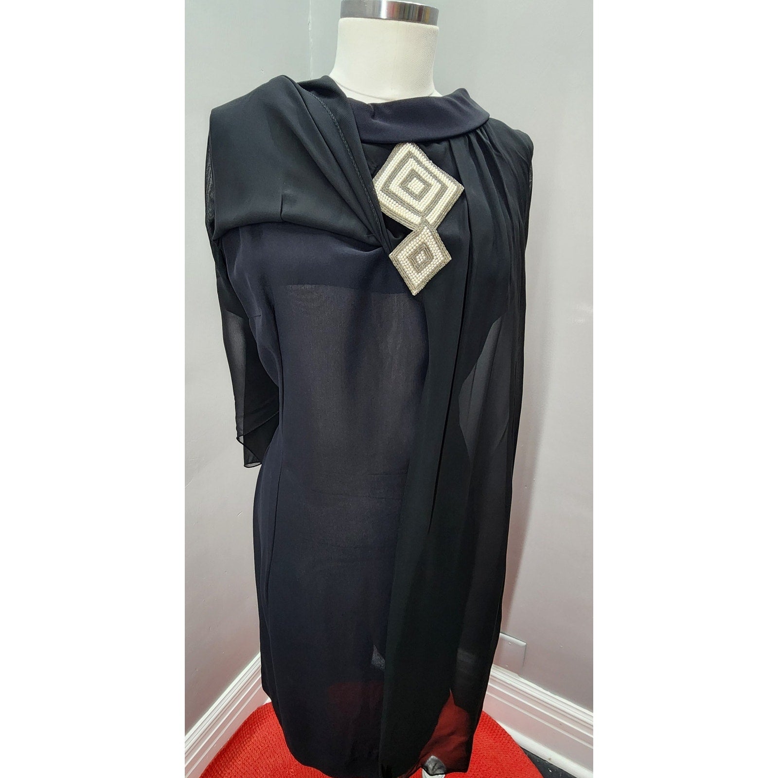 This elegant vintage dress features a classic black sheath silhouette, layered with sheer nylon for a graceful, flowing look. A beaded applique accents the oval neckline, adding a touch of retro sophistication. Lightweight and flattering, this dress is perfect for any cocktail or evening event.