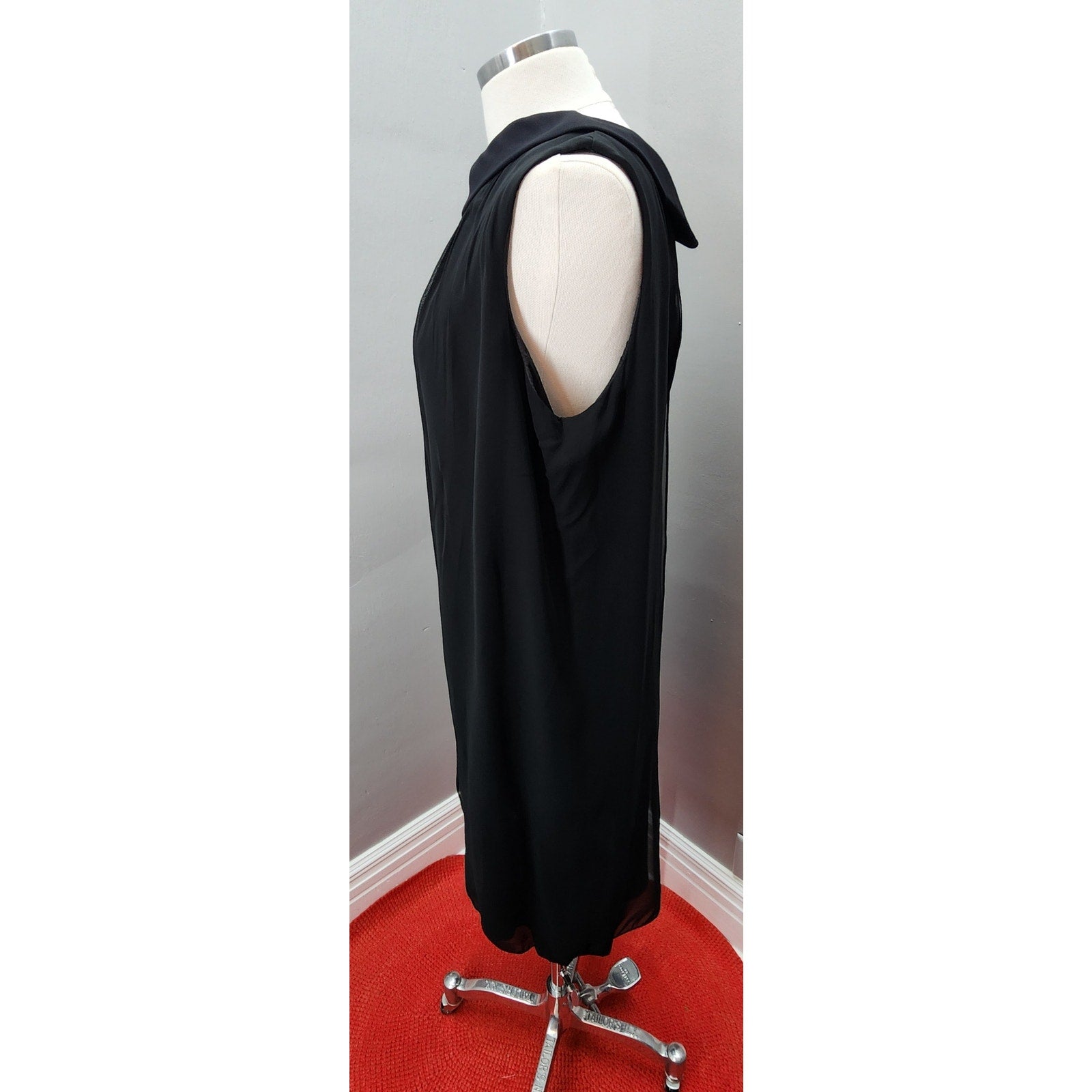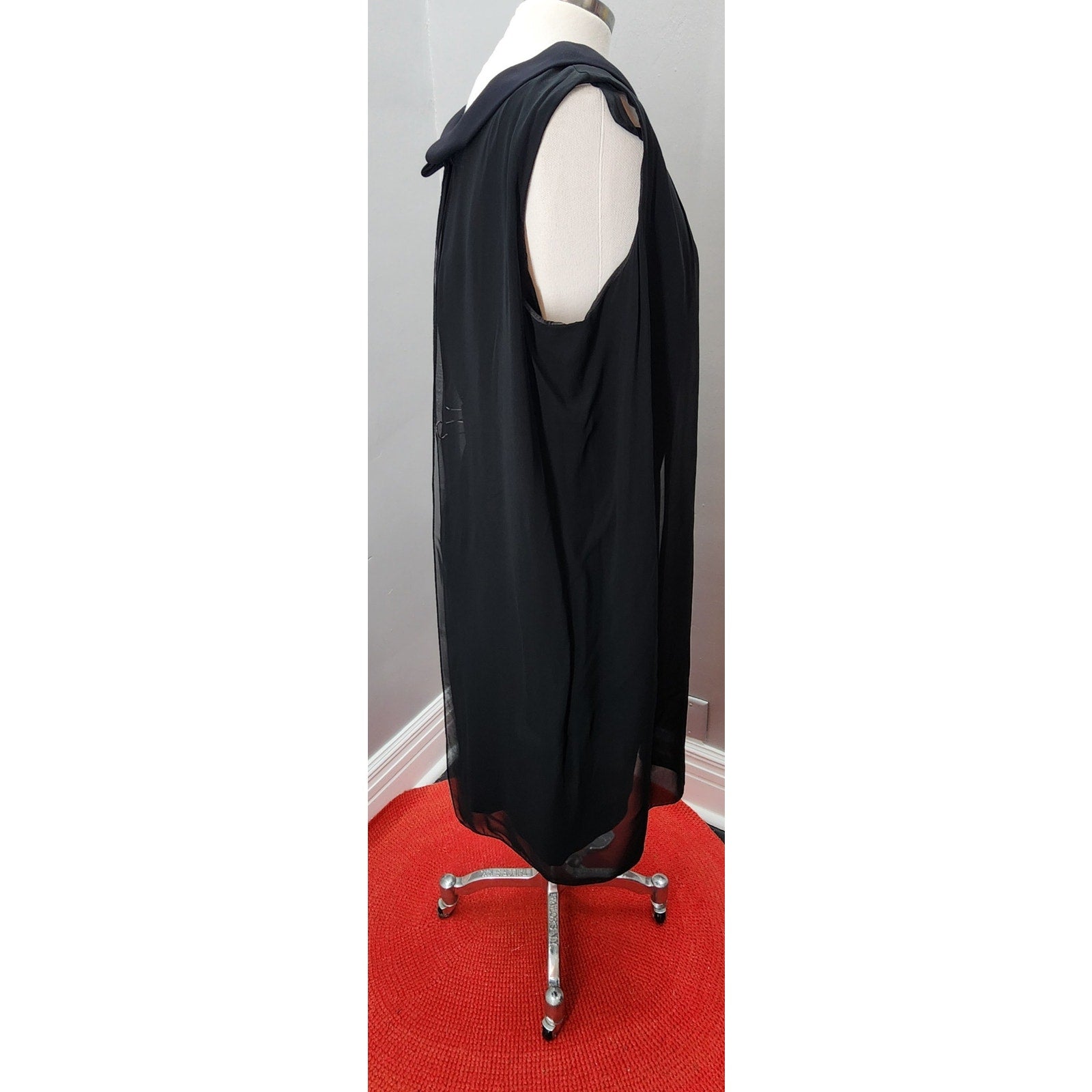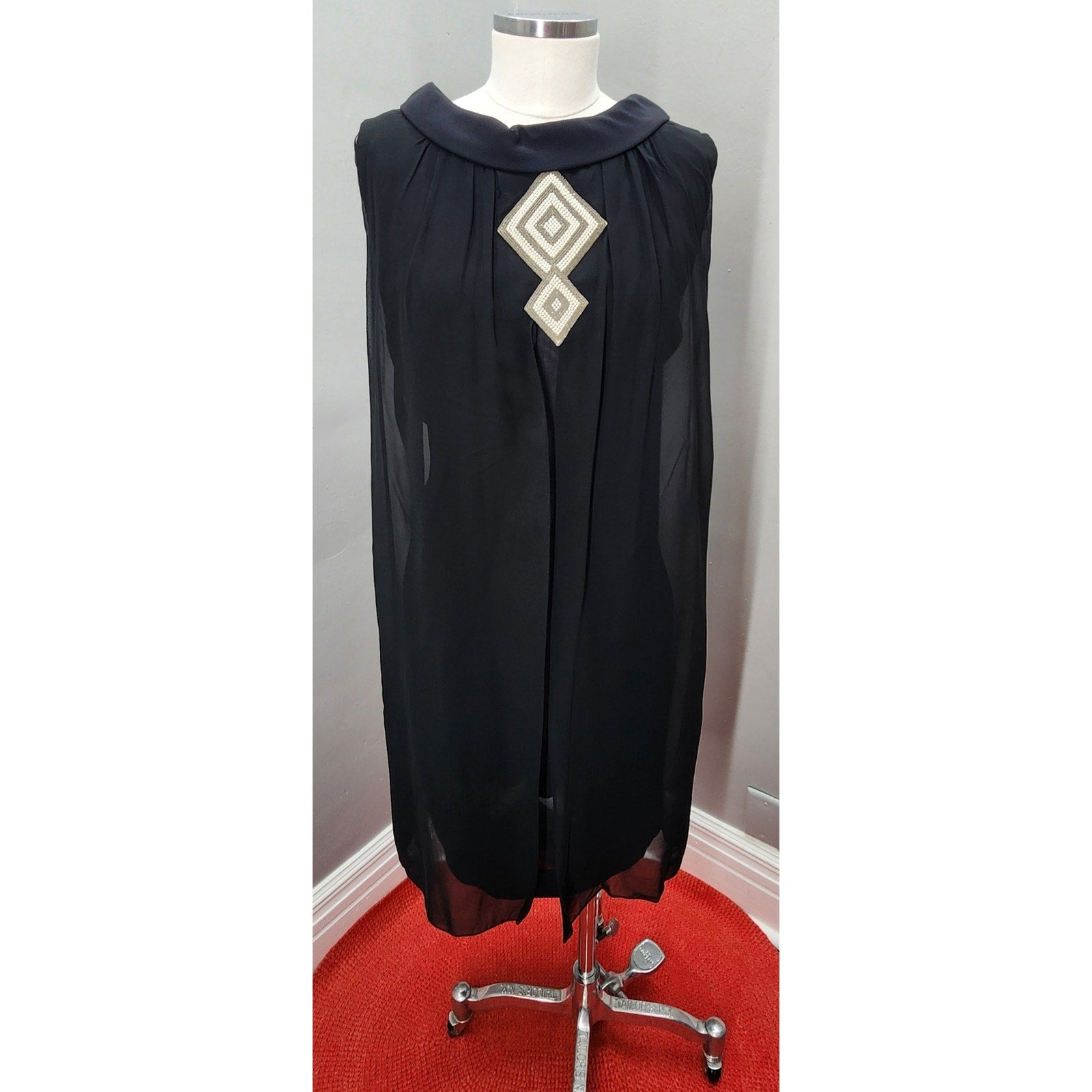 This elegant vintage dress features a classic black sheath silhouette, layered with sheer nylon for a graceful, flowing look. A beaded applique accents the oval neckline, adding a touch of retro sophistication. Lightweight and flattering, this dress is perfect for any cocktail or evening event.