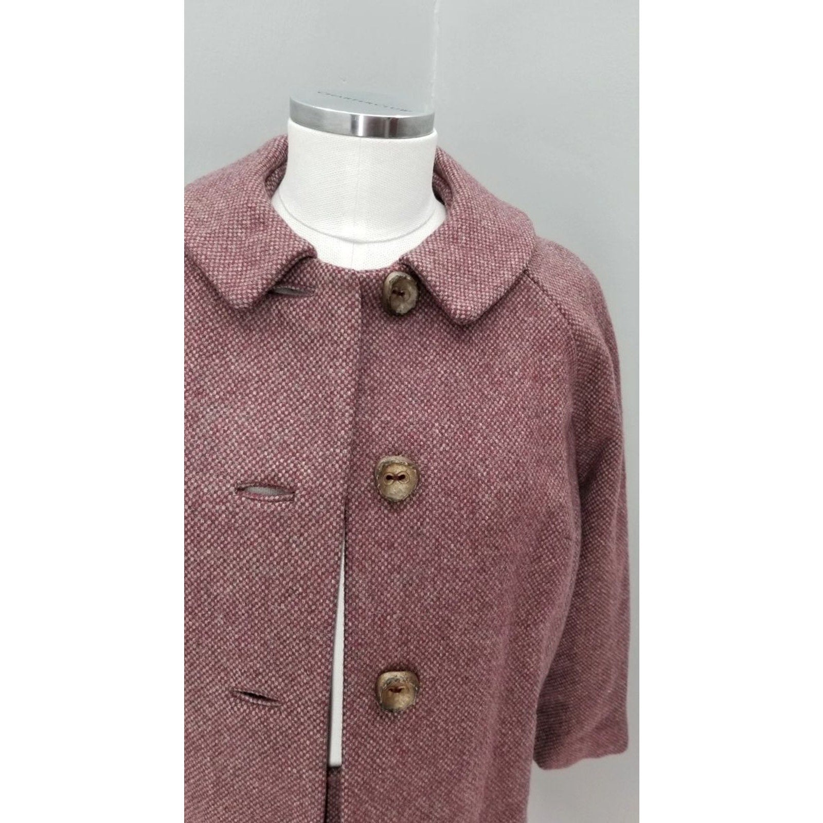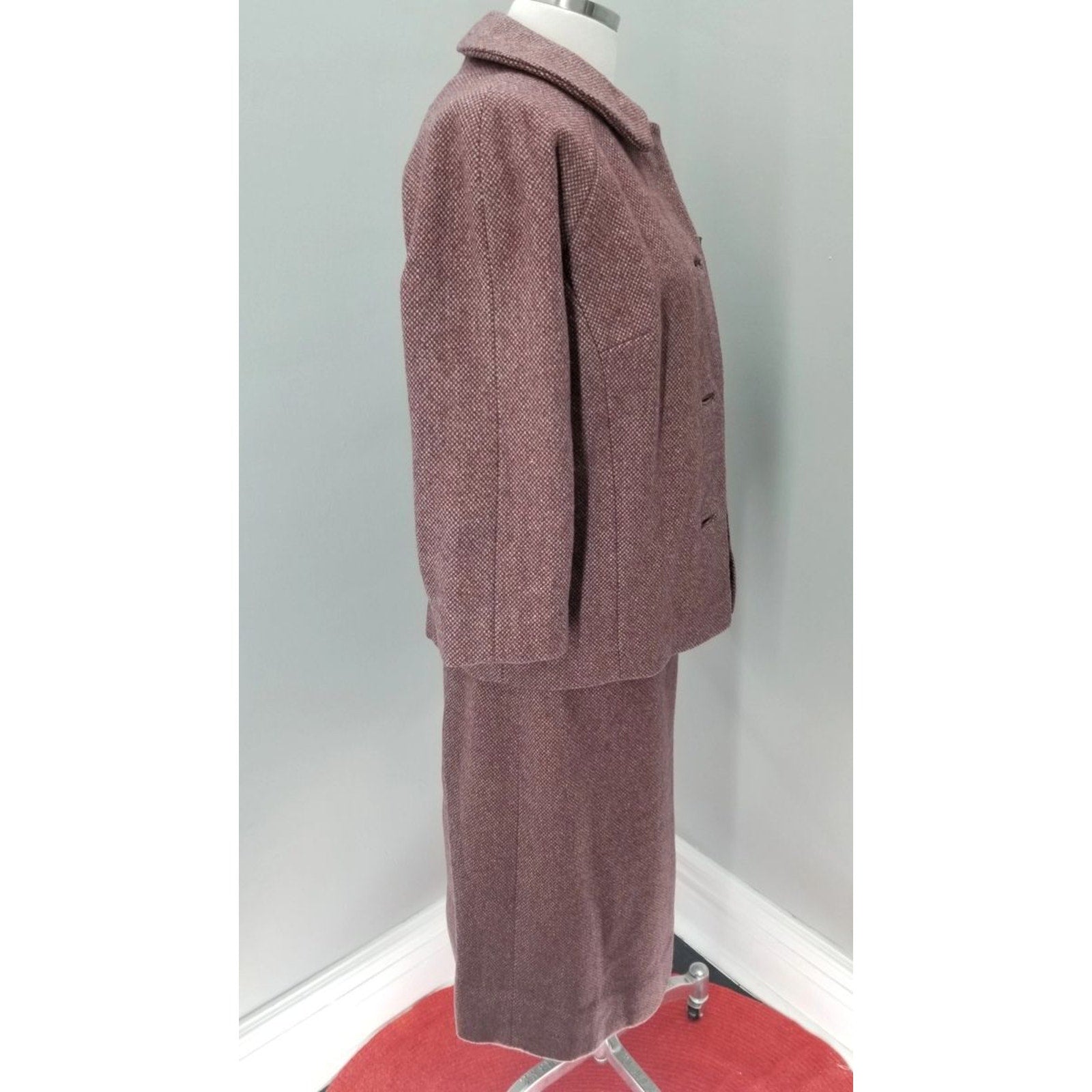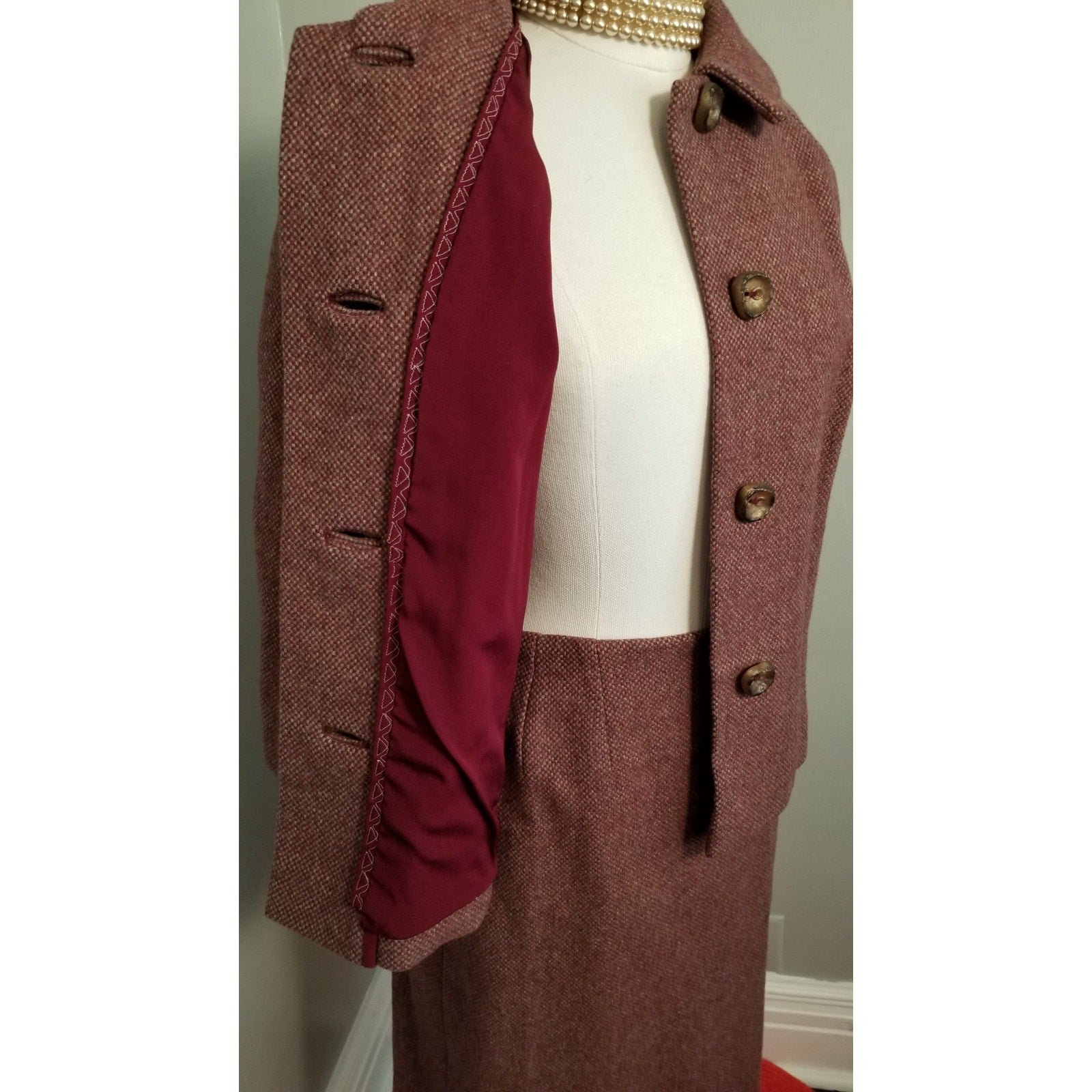 This is a late 50s early 60s tailored wool blend power suit in burgundy and grey check is fully lined and has the cutest finishing detail on the inside. (see photos) And those buttons!!