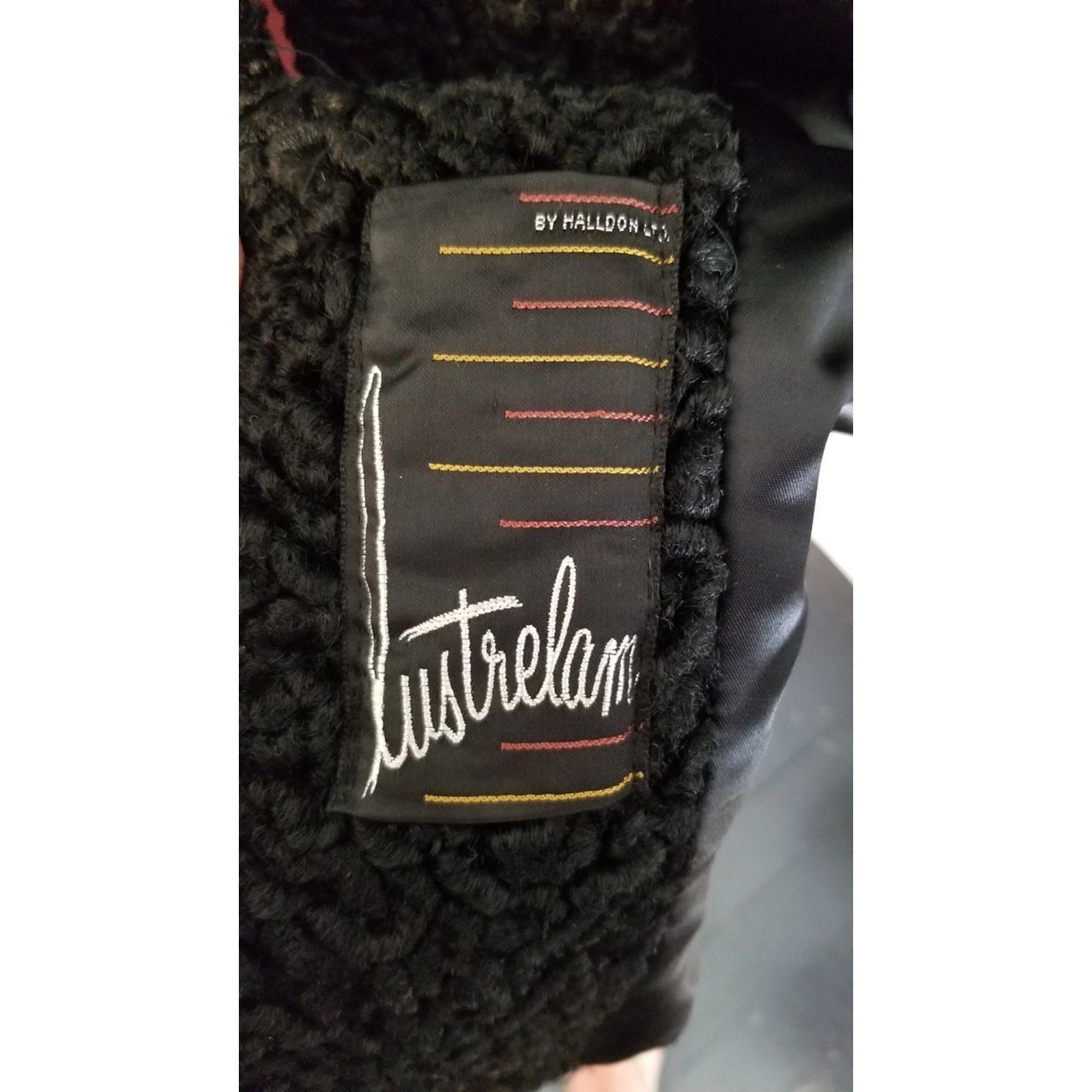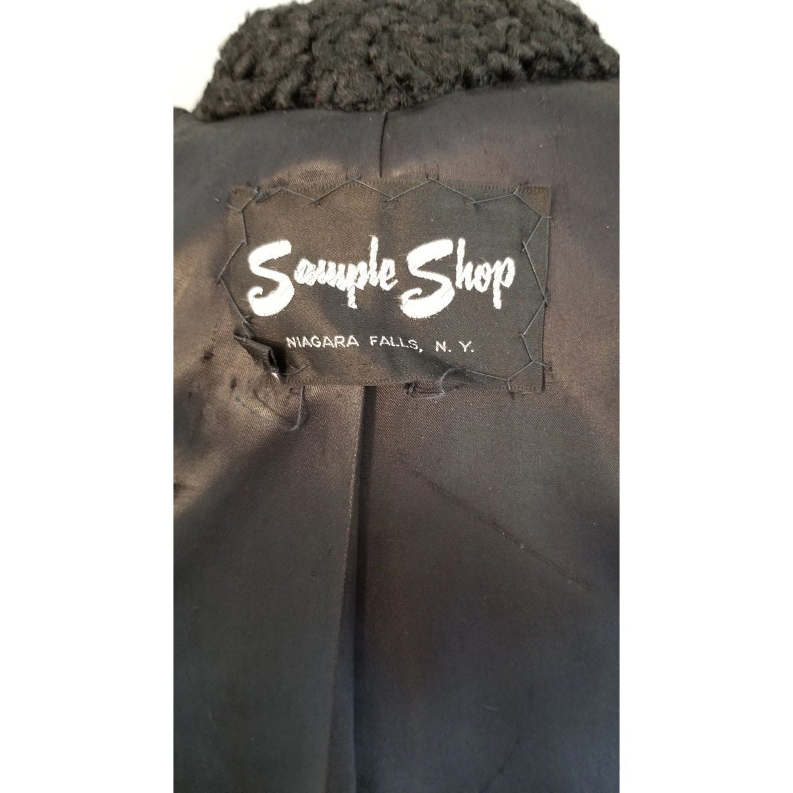 Classic faux curly lamb coat from the Sample Shop in Niagara Falls. Inky black Lusterlamb fabric by Halldon LTD, with a smoky silver mink fur collar, 3/4 sleeves and front hip slit pockets and silky satin lining, and those covered buttons.
