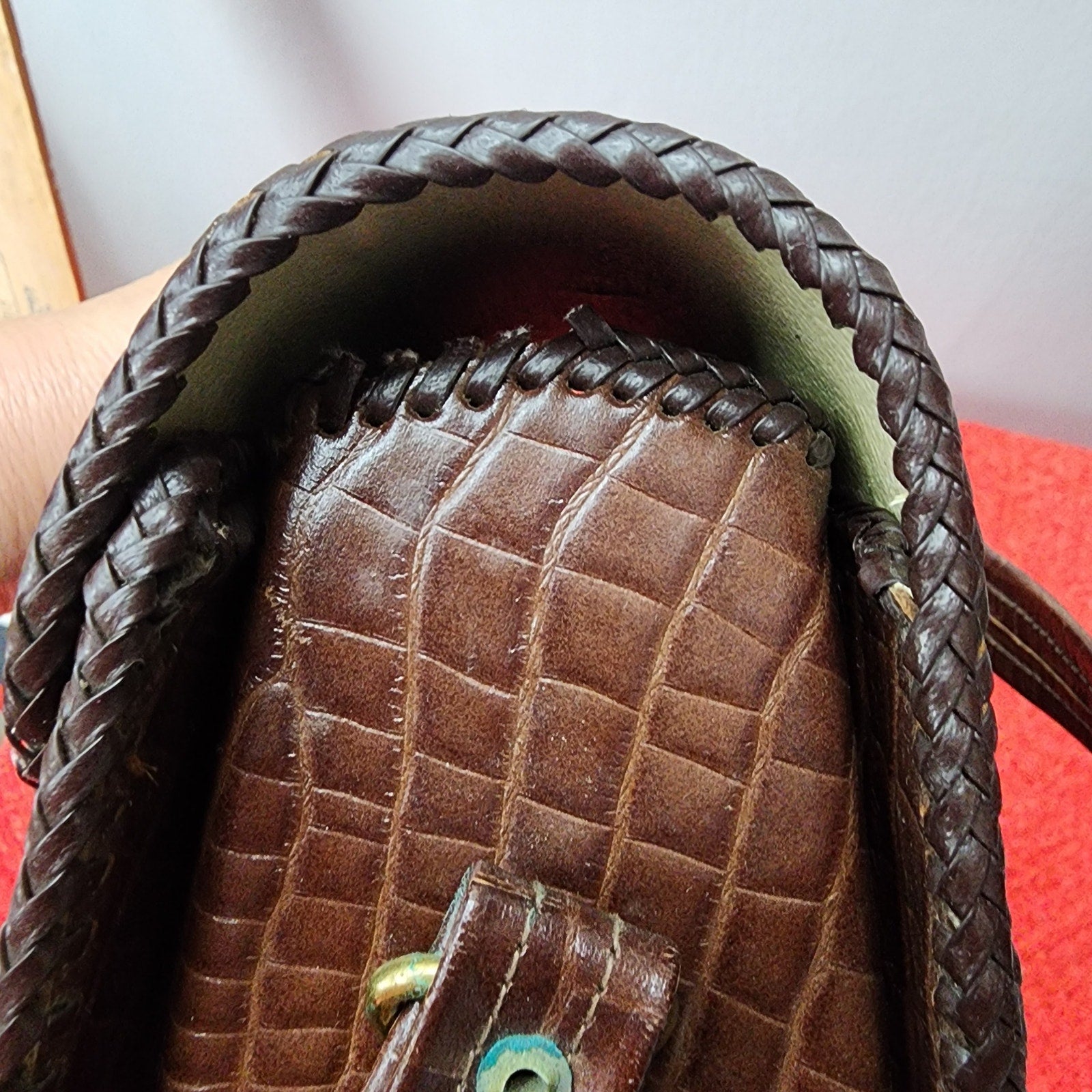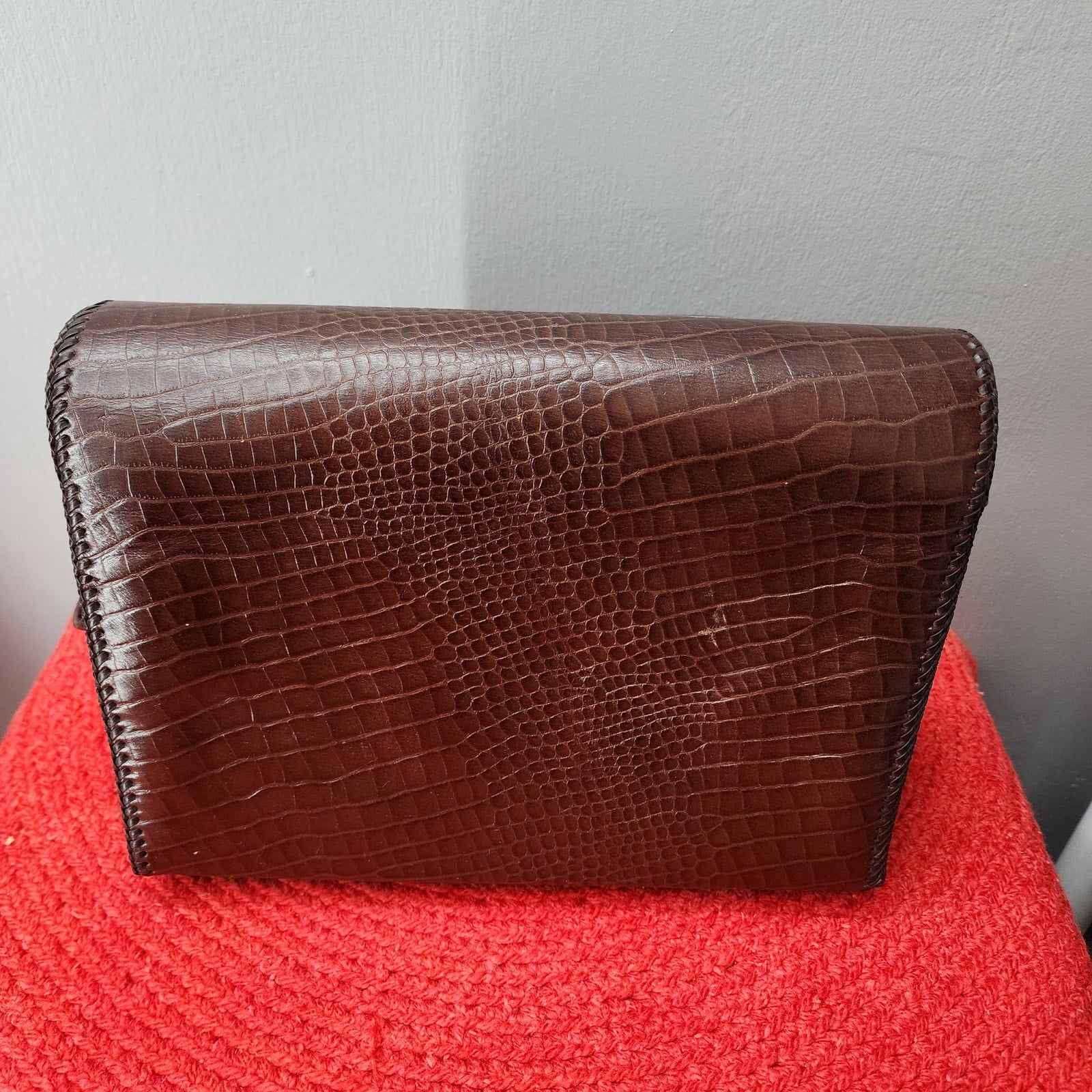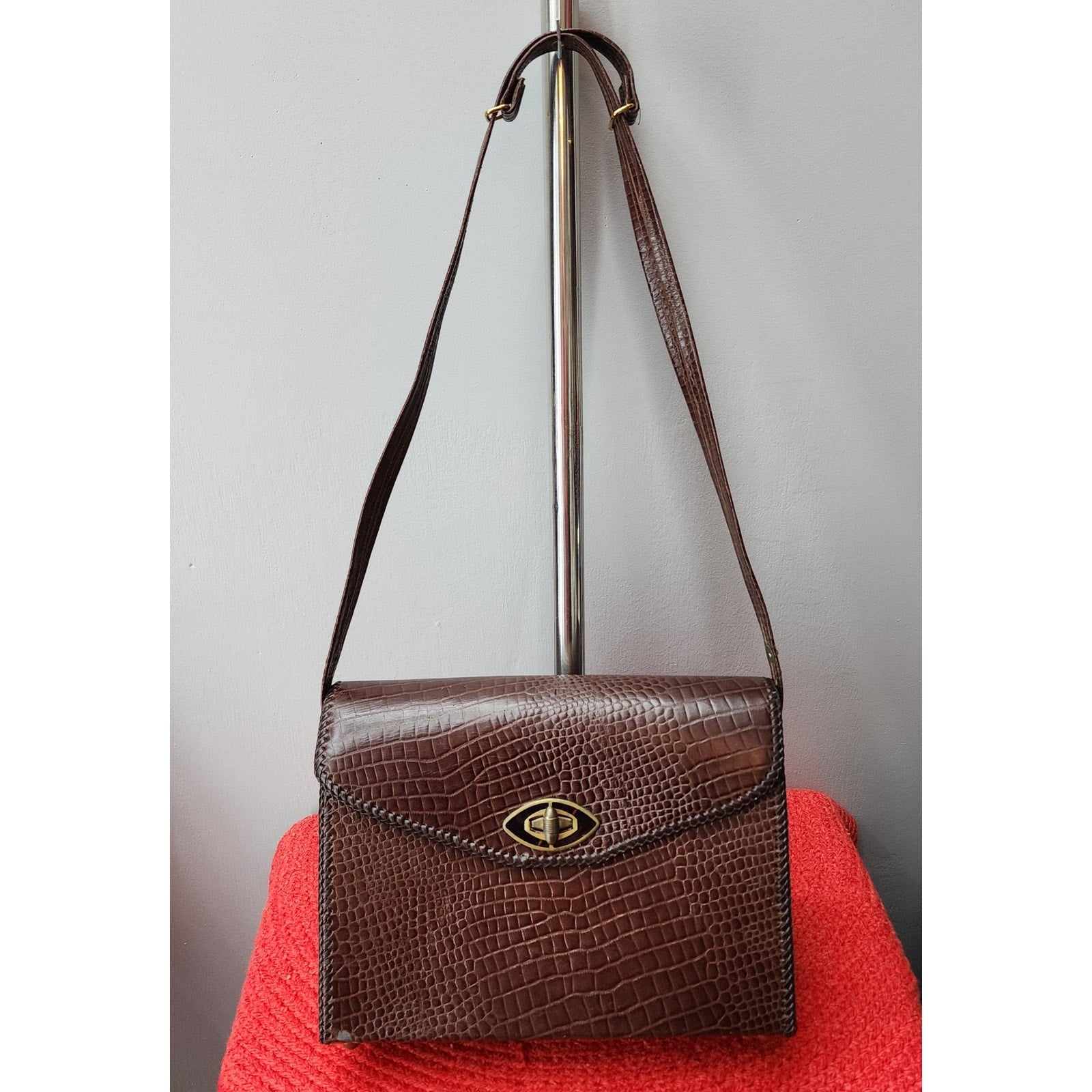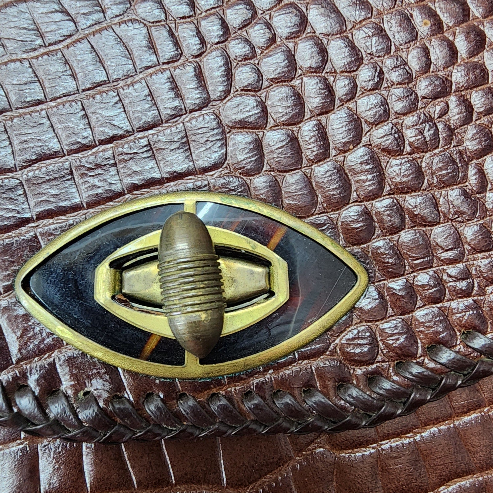 Super Chic, unbranded, vinyl faux croc design in a deep brown color, vinyl interior for easy cleaning, adjustable strap for shoulder or hand carry and a large barrel twist toggle closure with Lucite detail. Brass hardware.