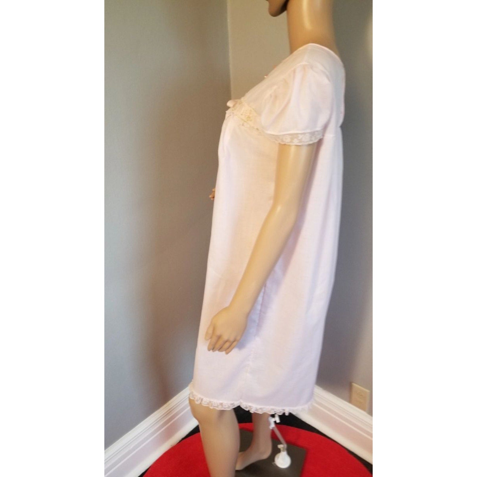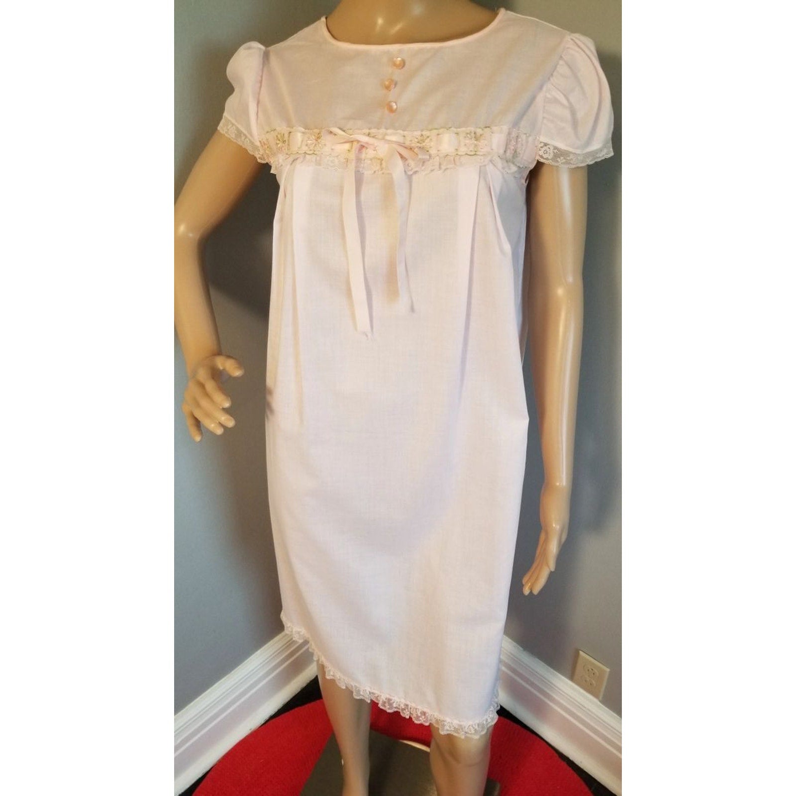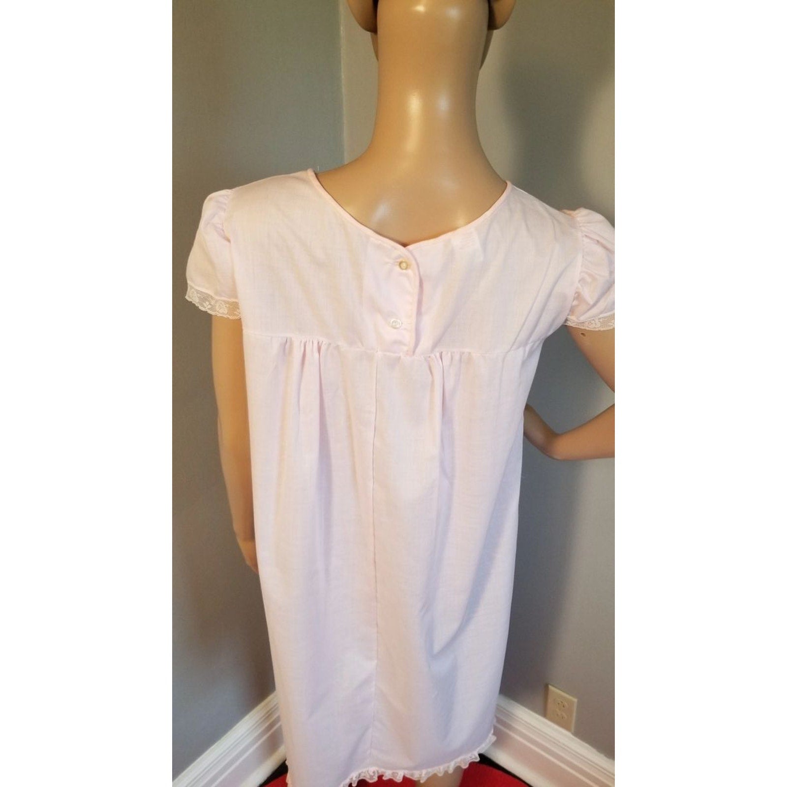 1960s Gaymode Nightie in pink with embroidered and ribbon woven yoke detail, cap sleeve with lace edge. Back button closure at the neckline.