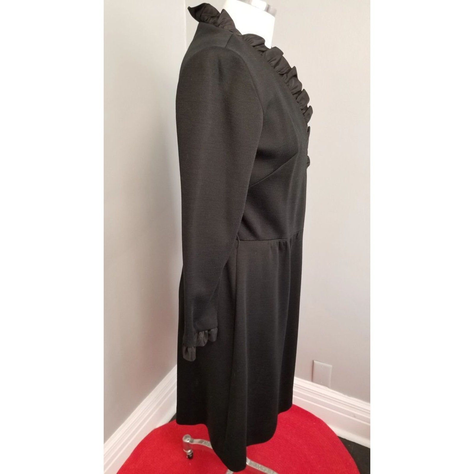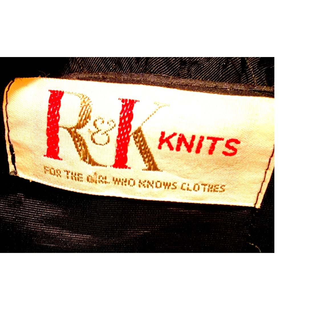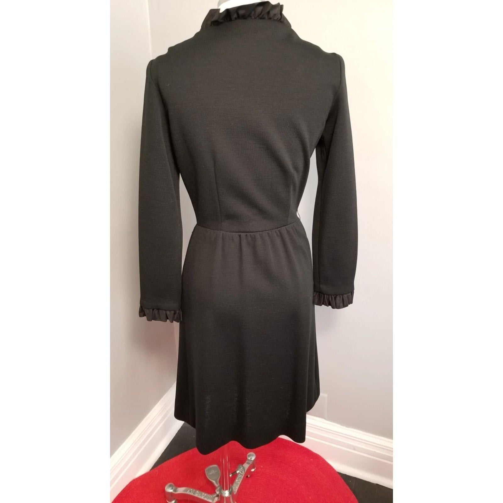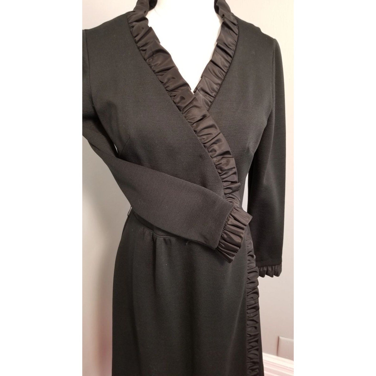 60s Vintage R&K Knit Black Wrap Dress with Satin Ruffle Trim - M