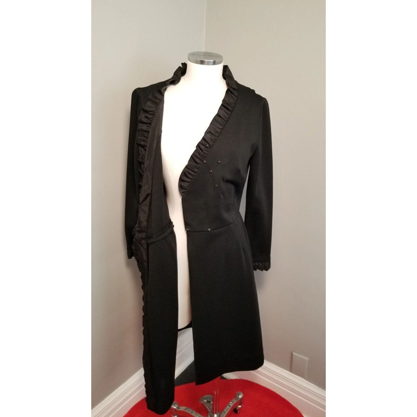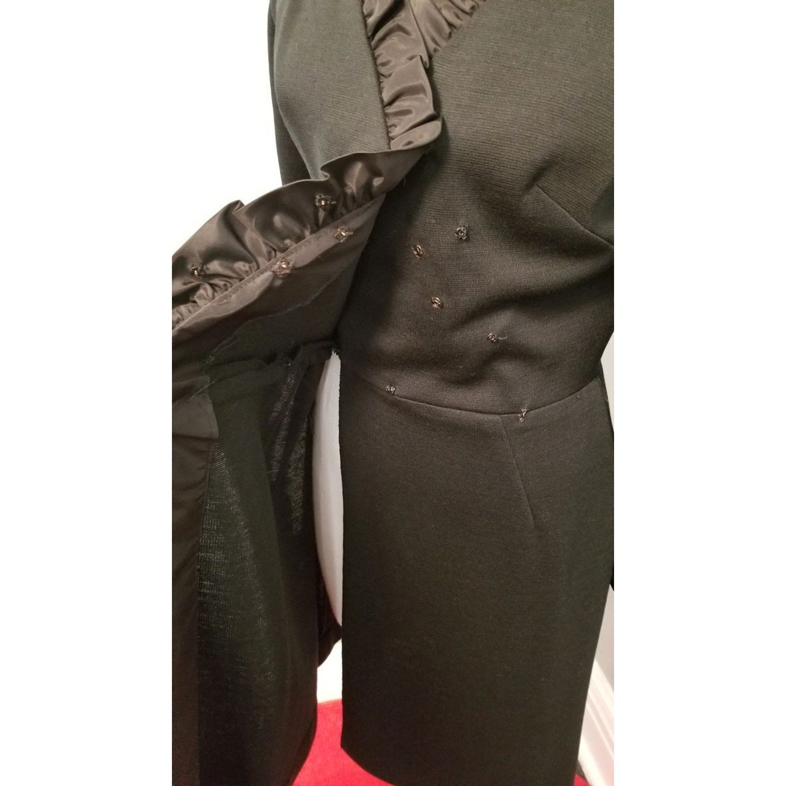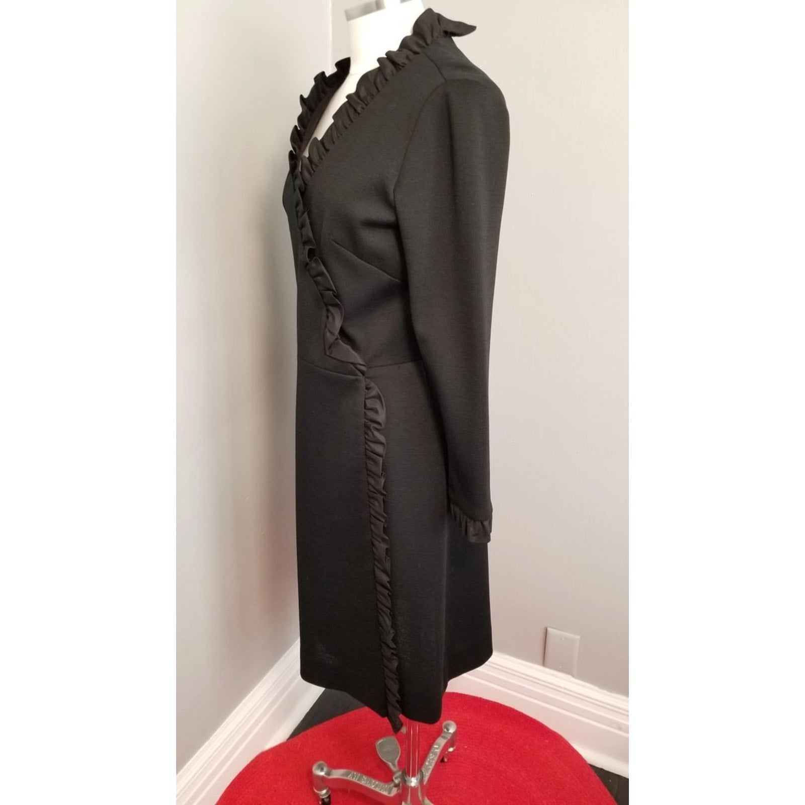 No faux wrap here! R&K Knits classic wrap dress with snap and hook & eye closure and black satin ruffle trim. A cool weather dress that can take you from the office to a night on the town!
