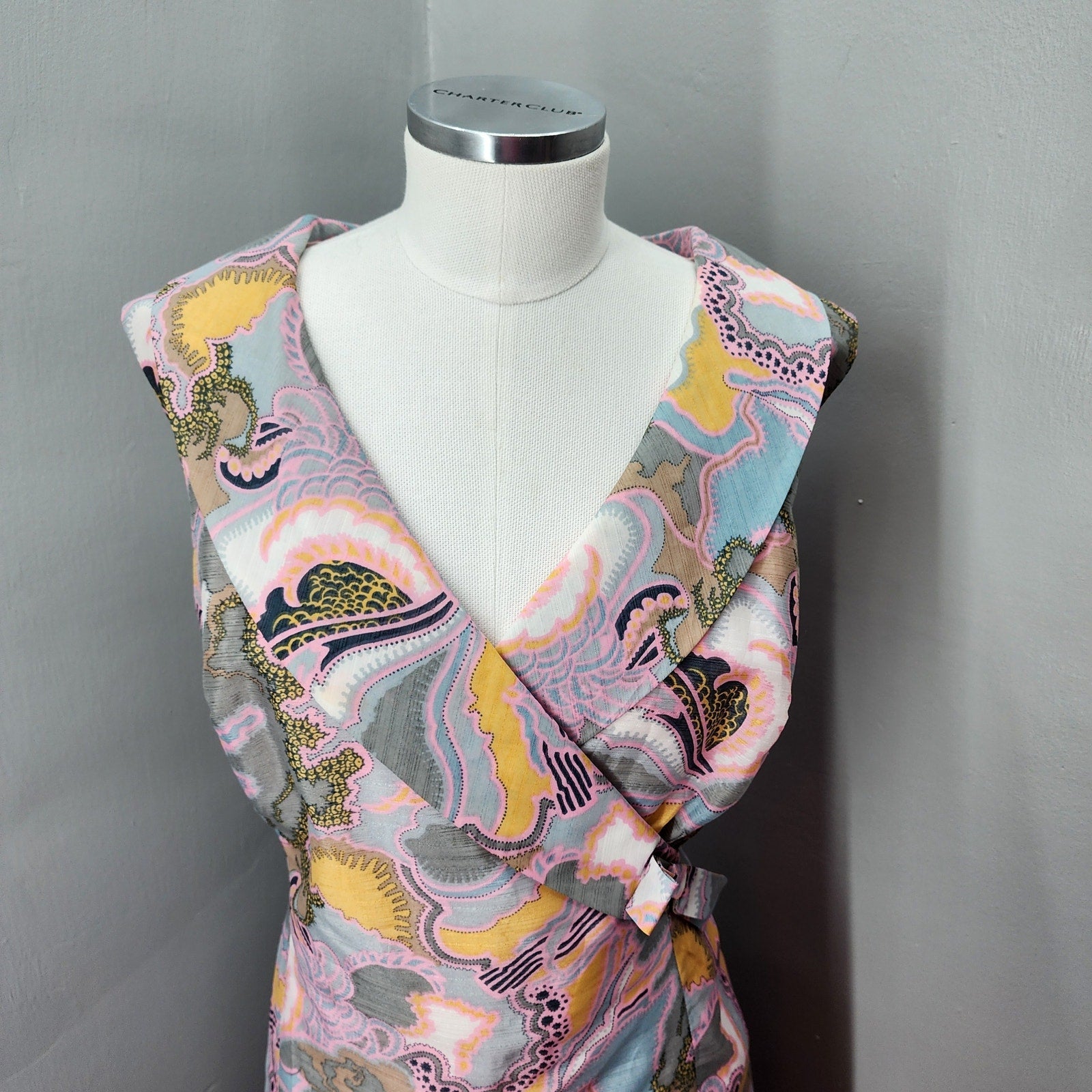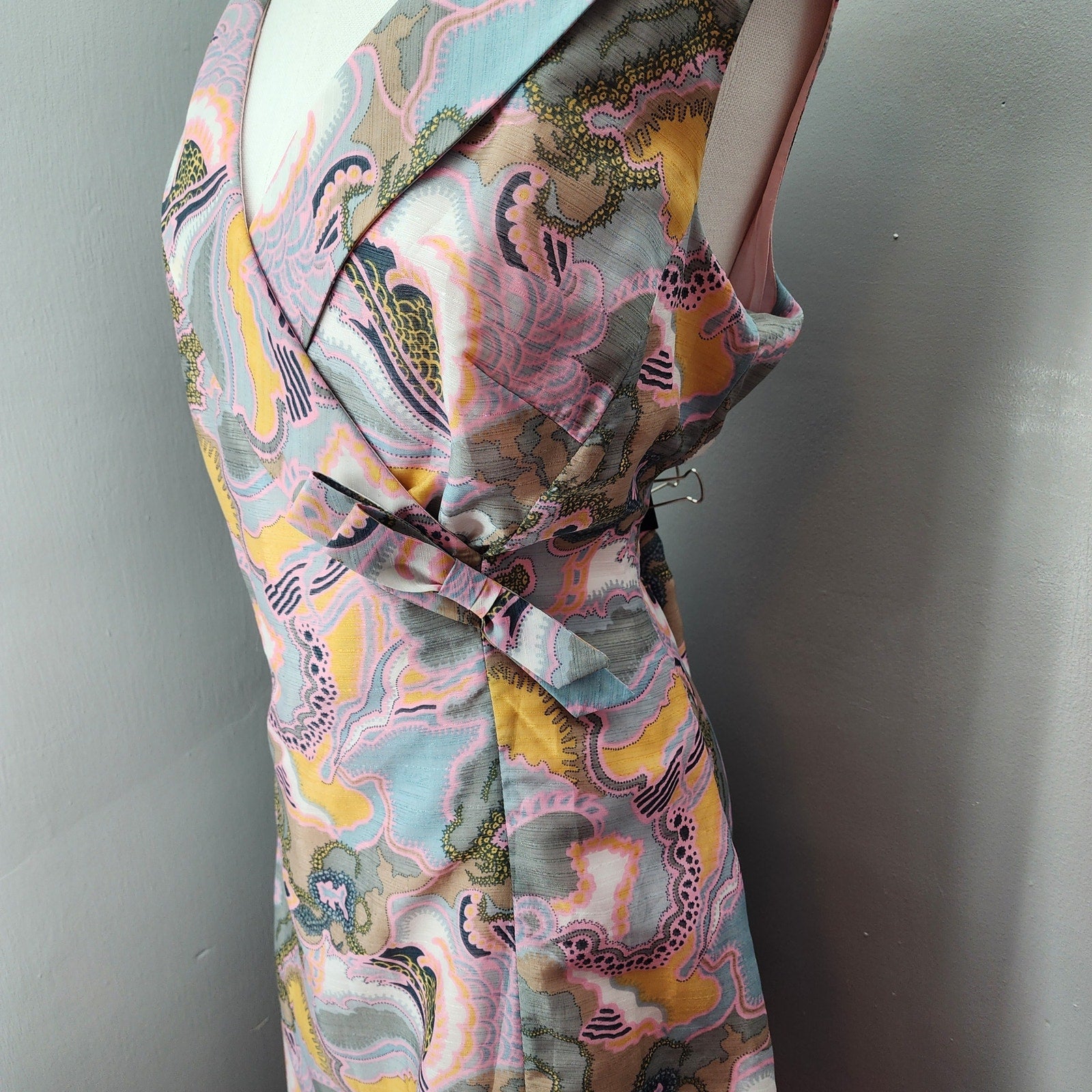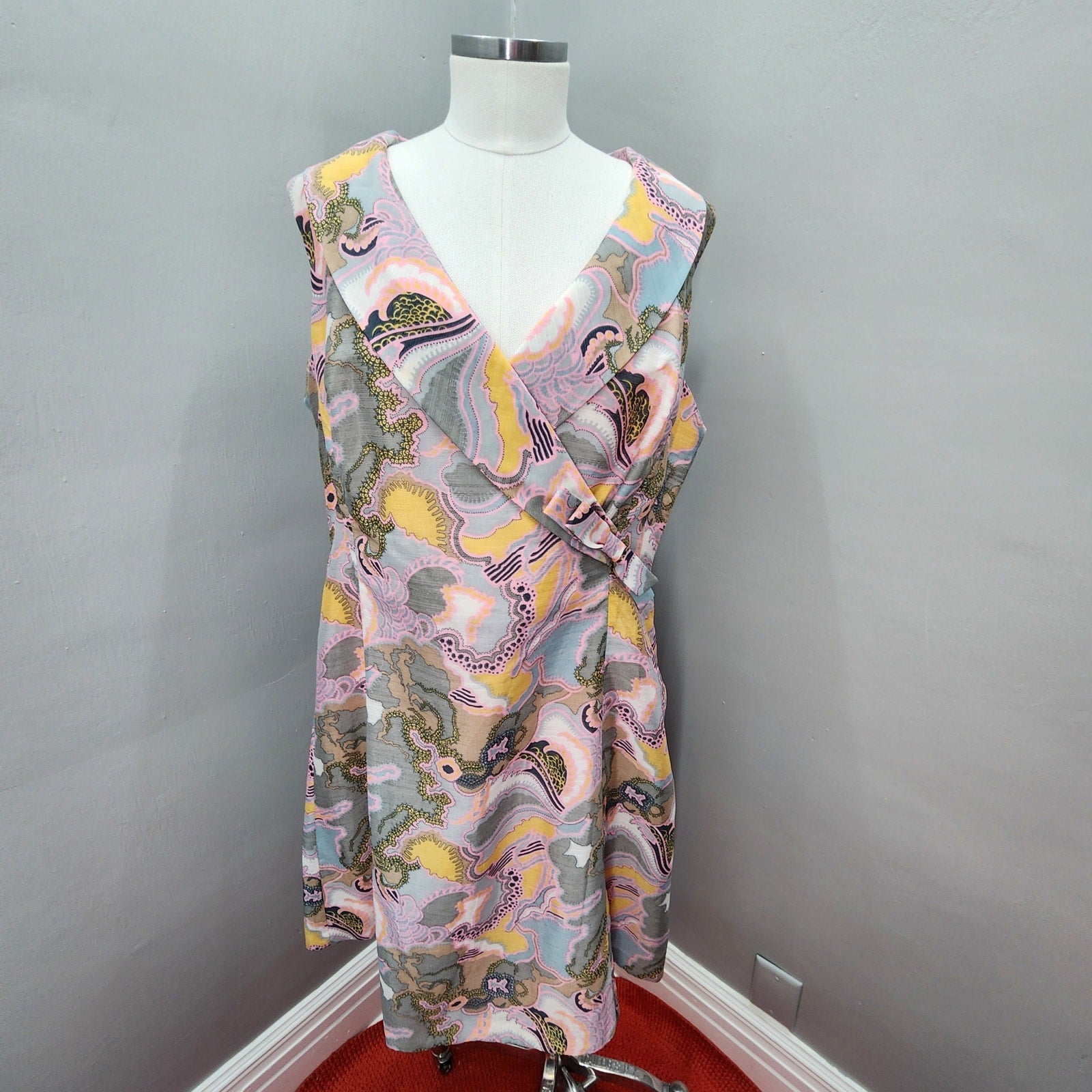 DELIGHTFUL dress in rare larger size. Interesting colorway and abstract design make this dress very eye catching. Pink, orange, grey, black, all mixed together in this material. Faux wrap design with cute bow detail, nylon back zipper, fully lined.