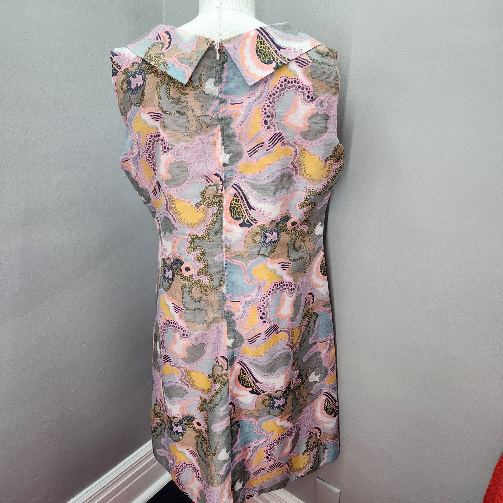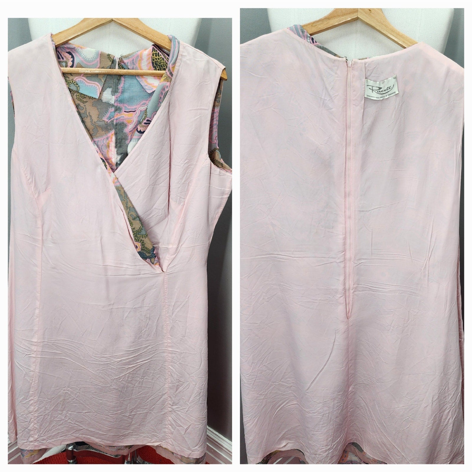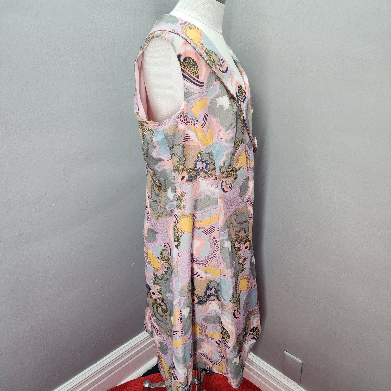 DELIGHTFUL dress in rare larger size. Interesting colorway and abstract design make this dress very eye catching. Pink, orange, grey, black, all mixed together in this material. Faux wrap design with cute bow detail, nylon back zipper, fully lined.