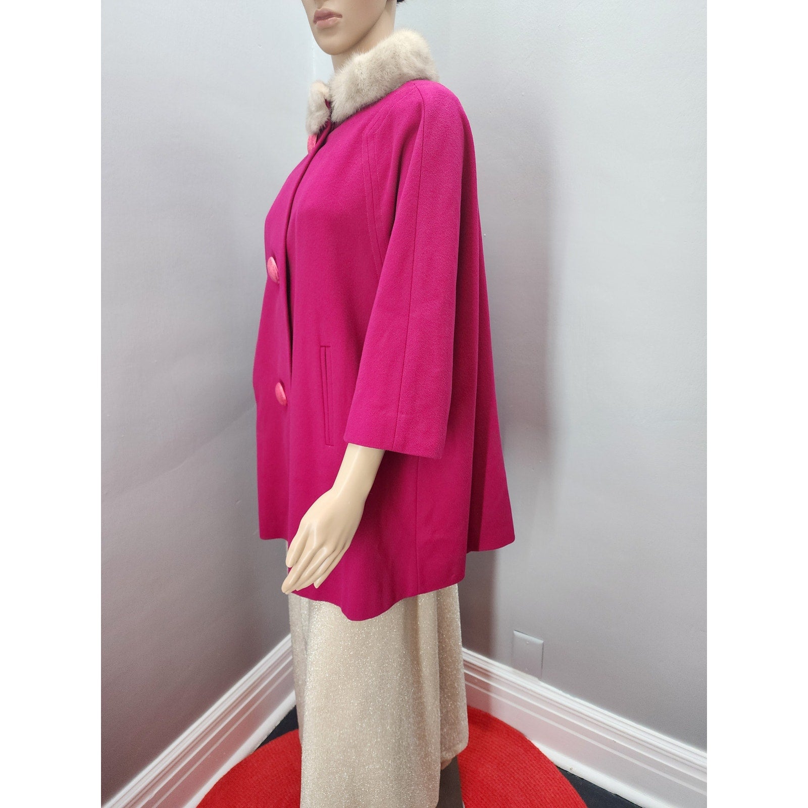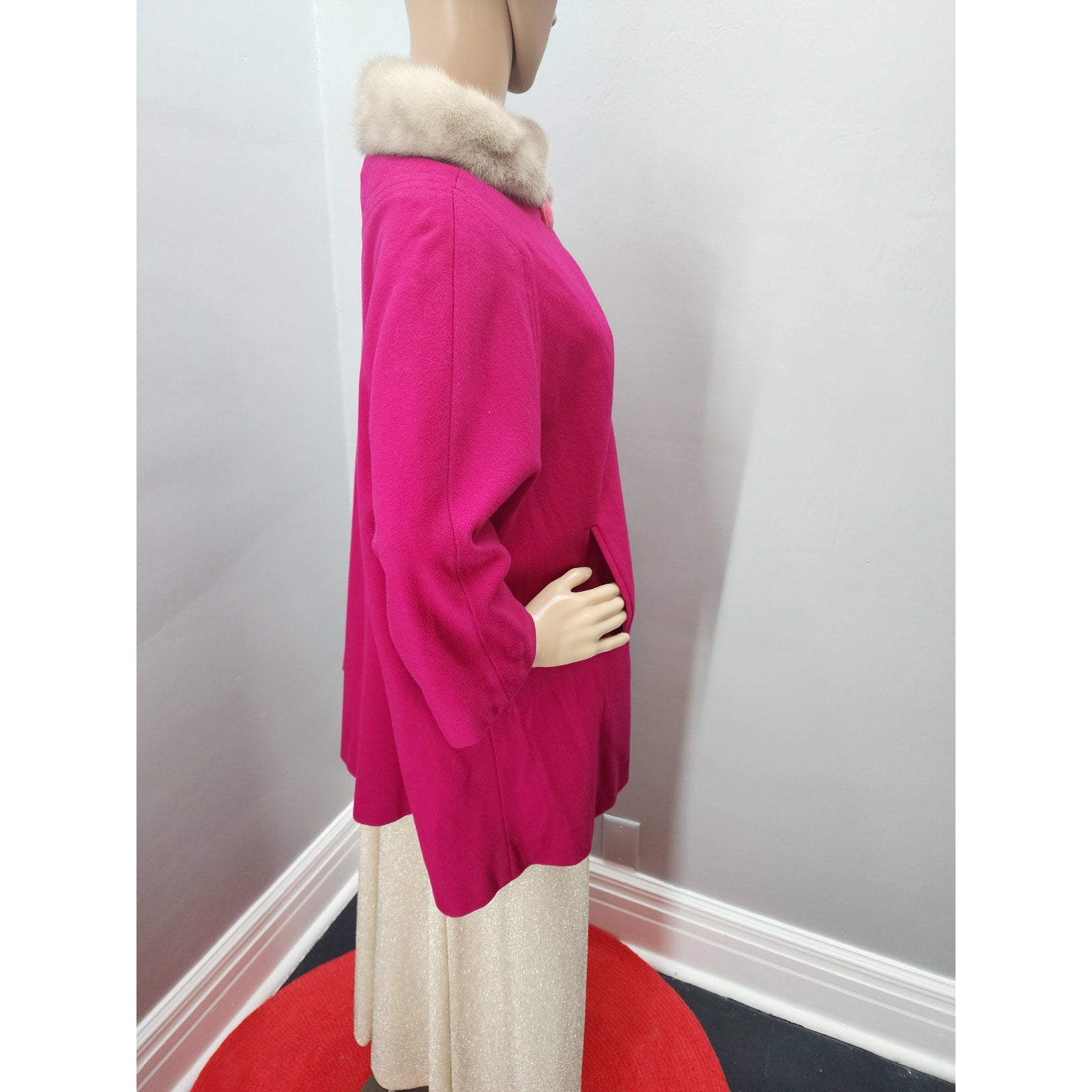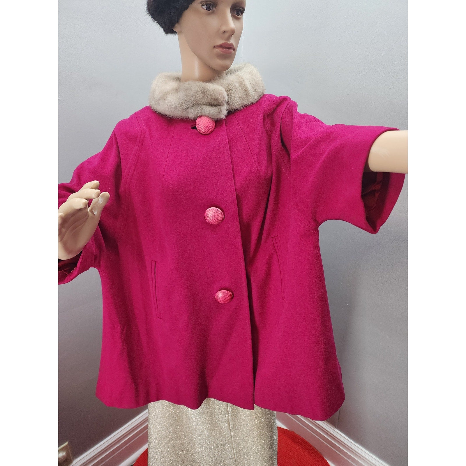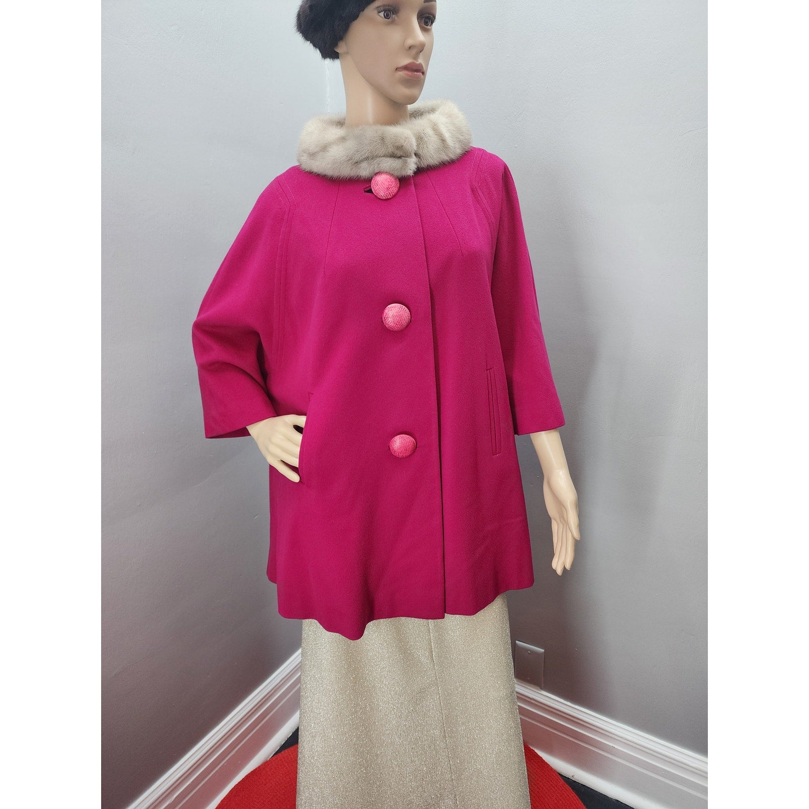 Raspberry wool short swing coat with half dolman sleeve, 2 pockets, 3 huge buttons and a silver mink collar.