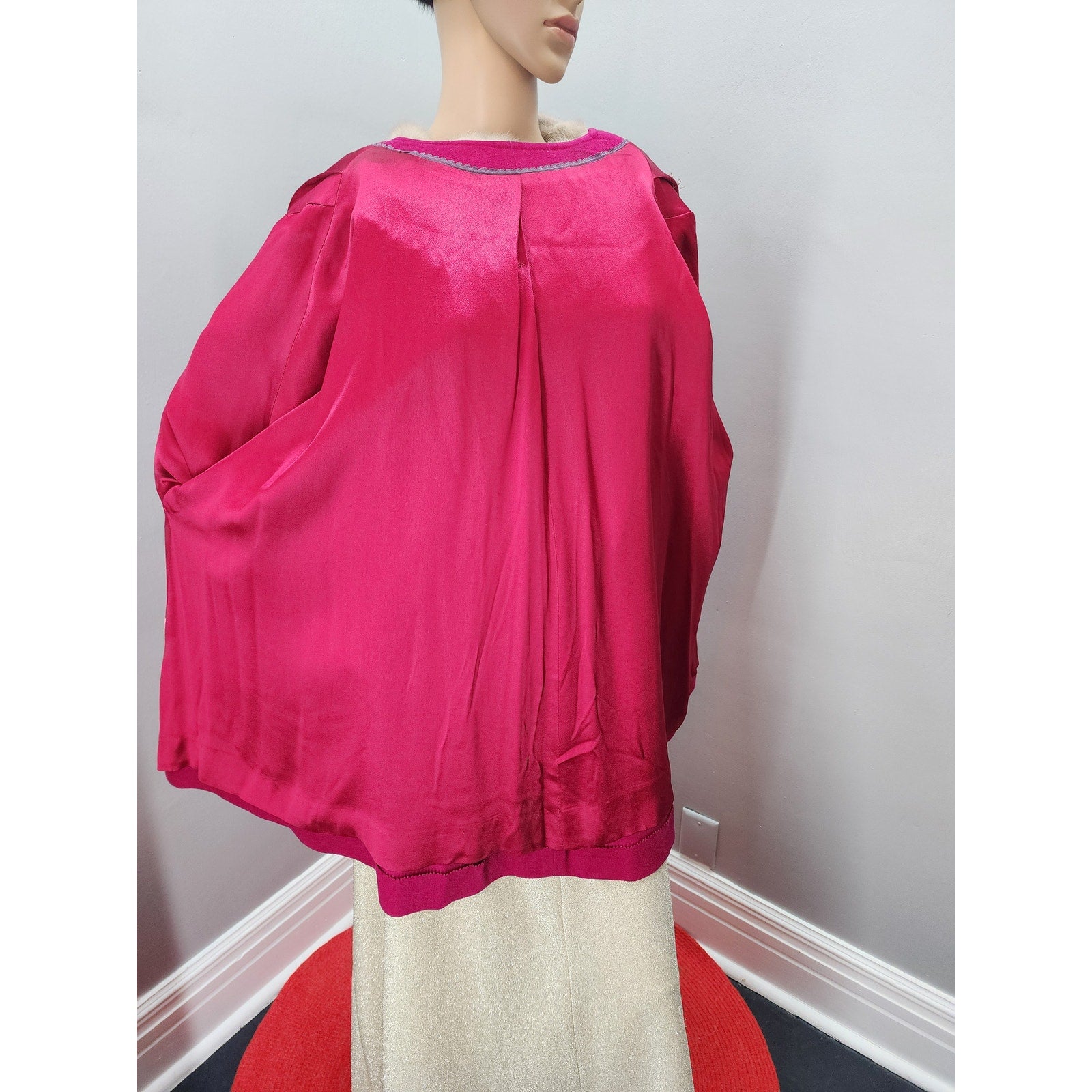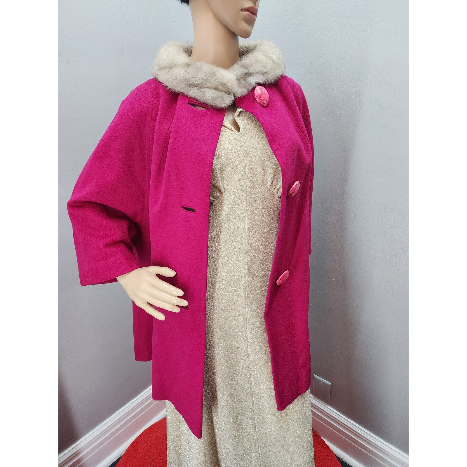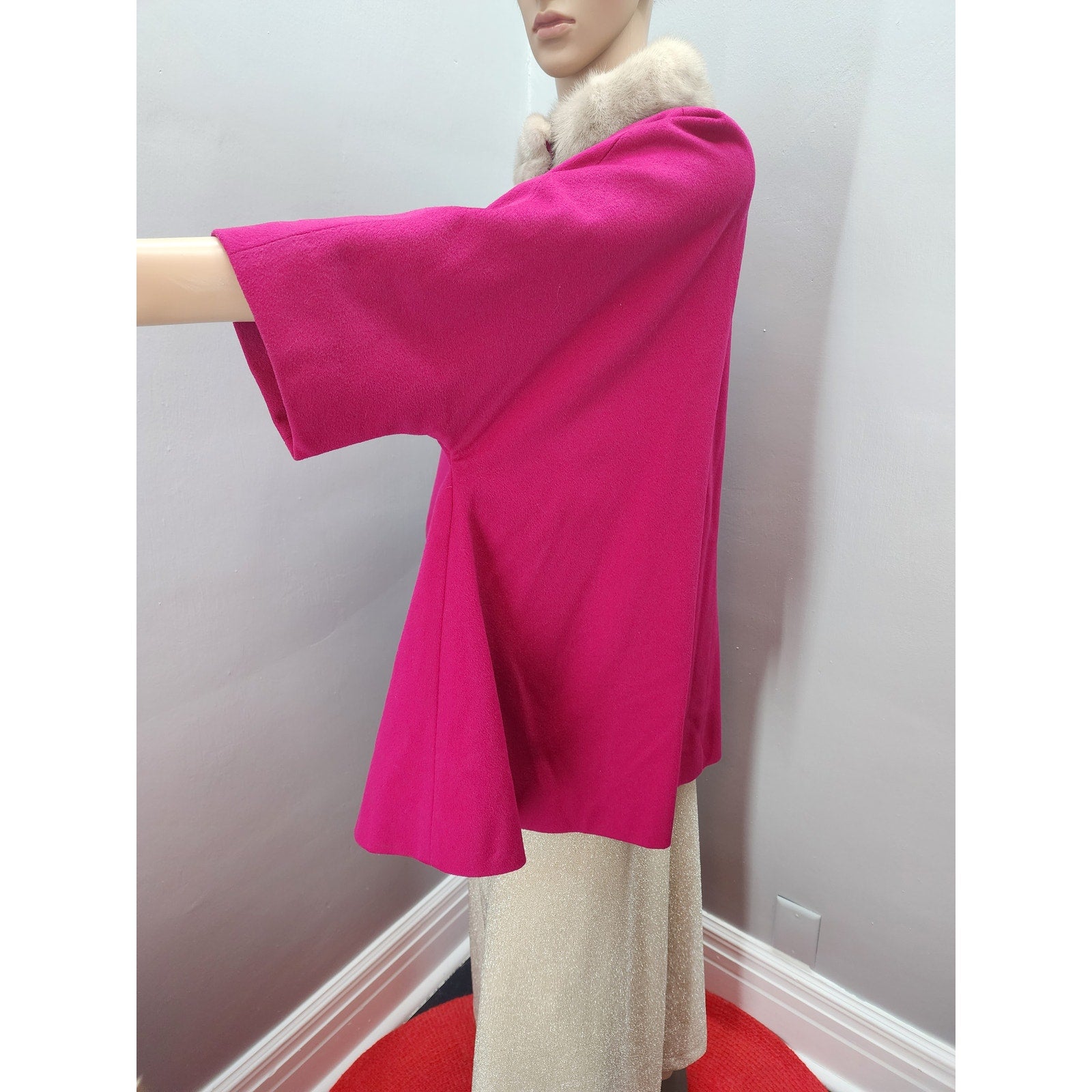 Raspberry wool short swing coat with half dolman sleeve, 2 pockets, 3 huge buttons and a silver mink collar.