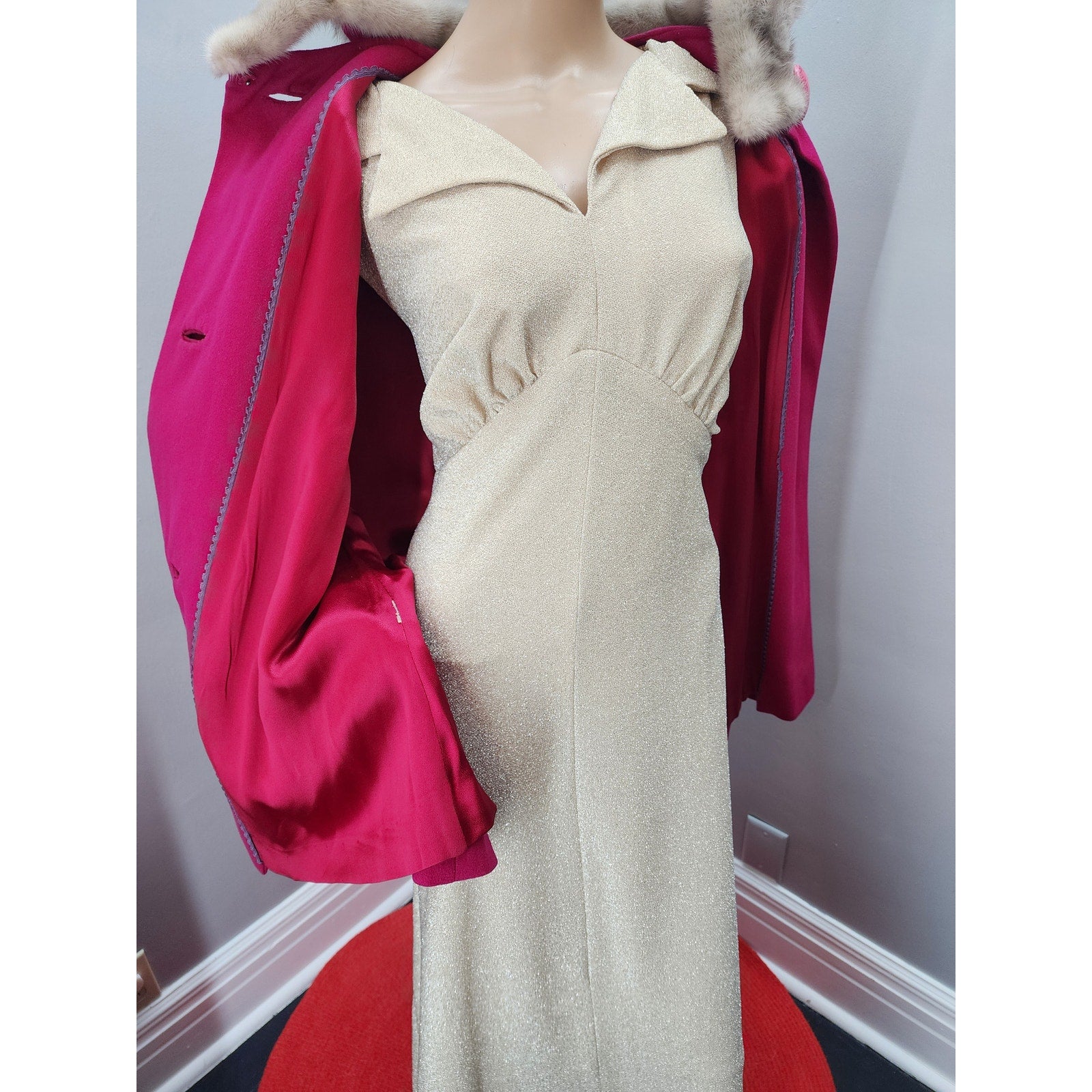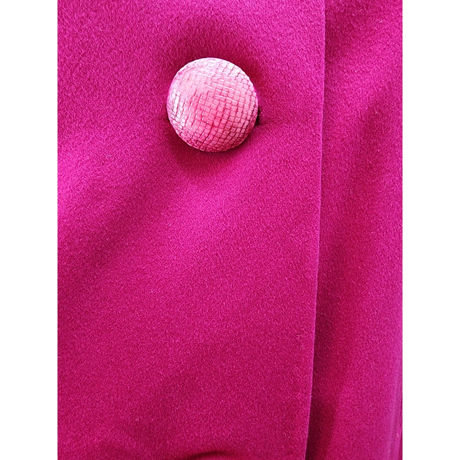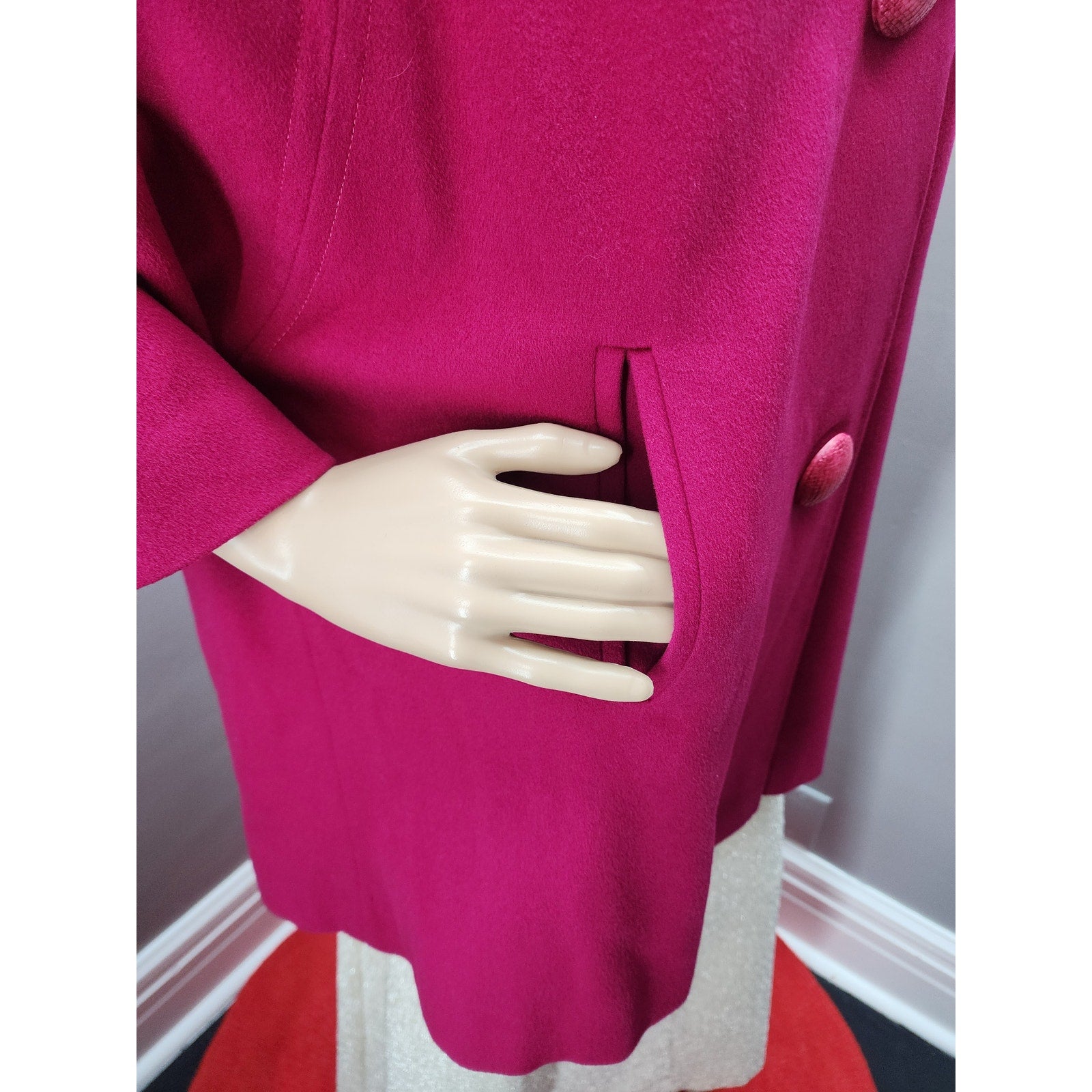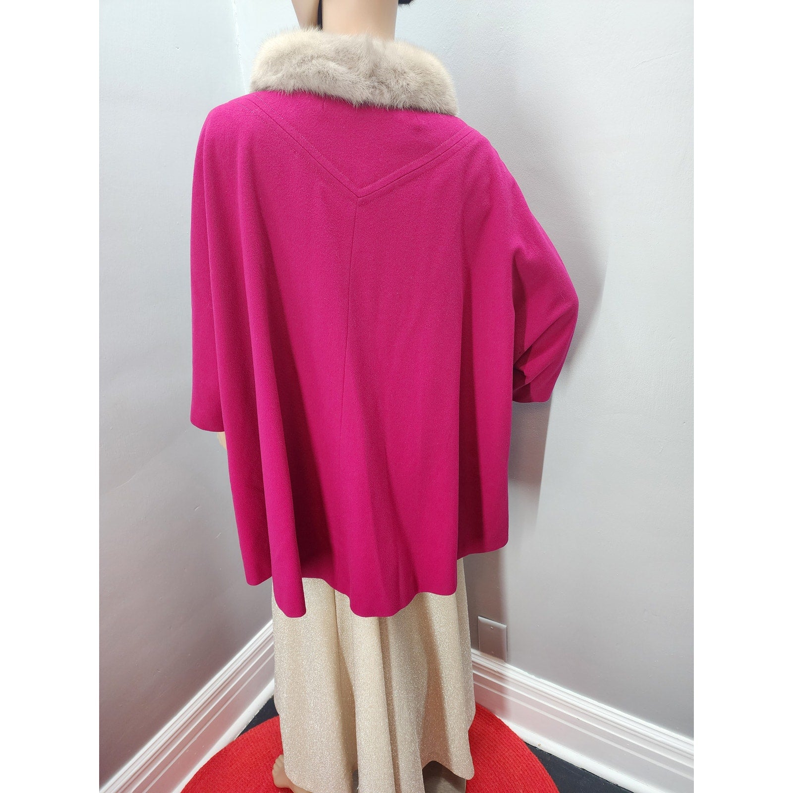 Raspberry wool short swing coat with half dolman sleeve, 2 pockets, 3 huge buttons and a silver mink collar.