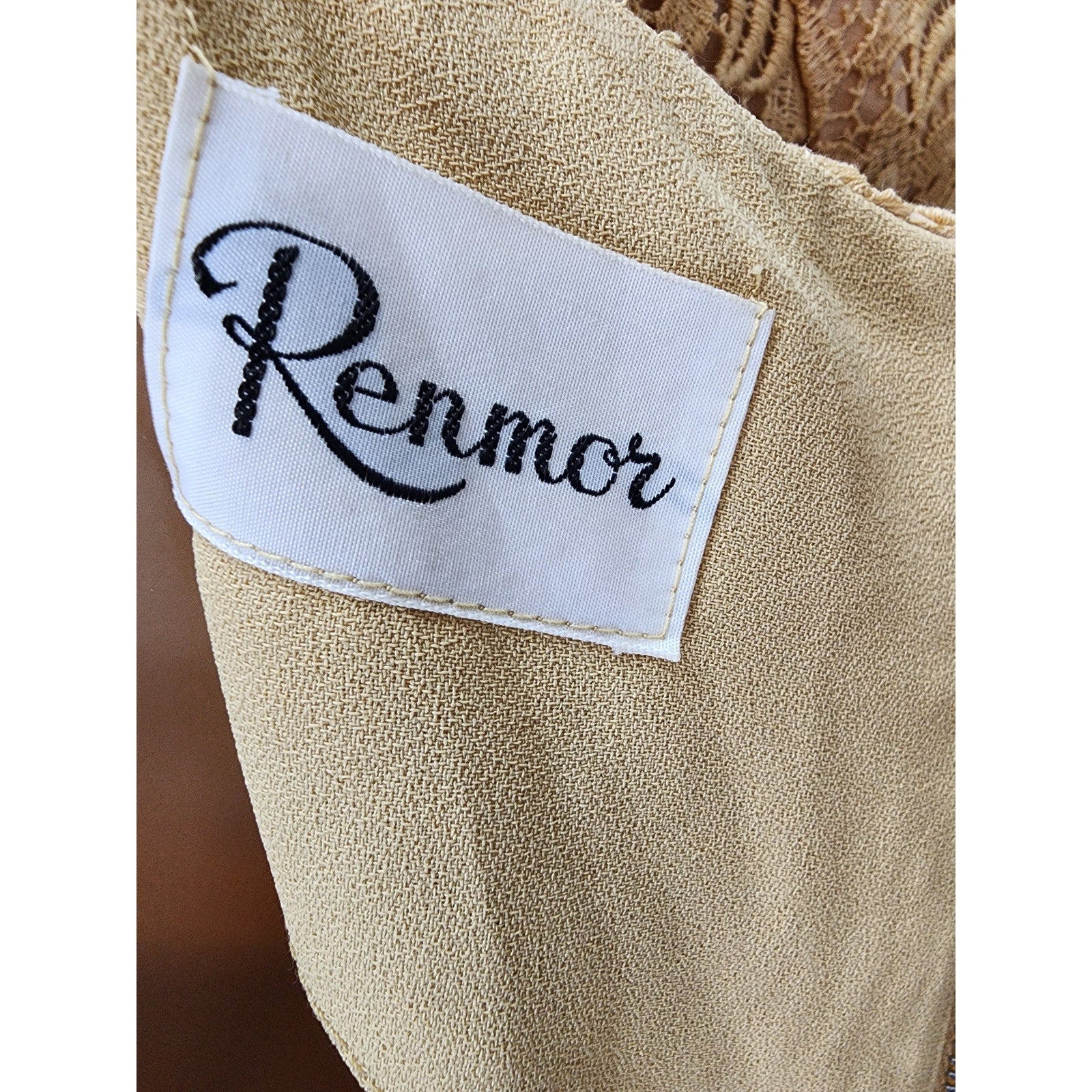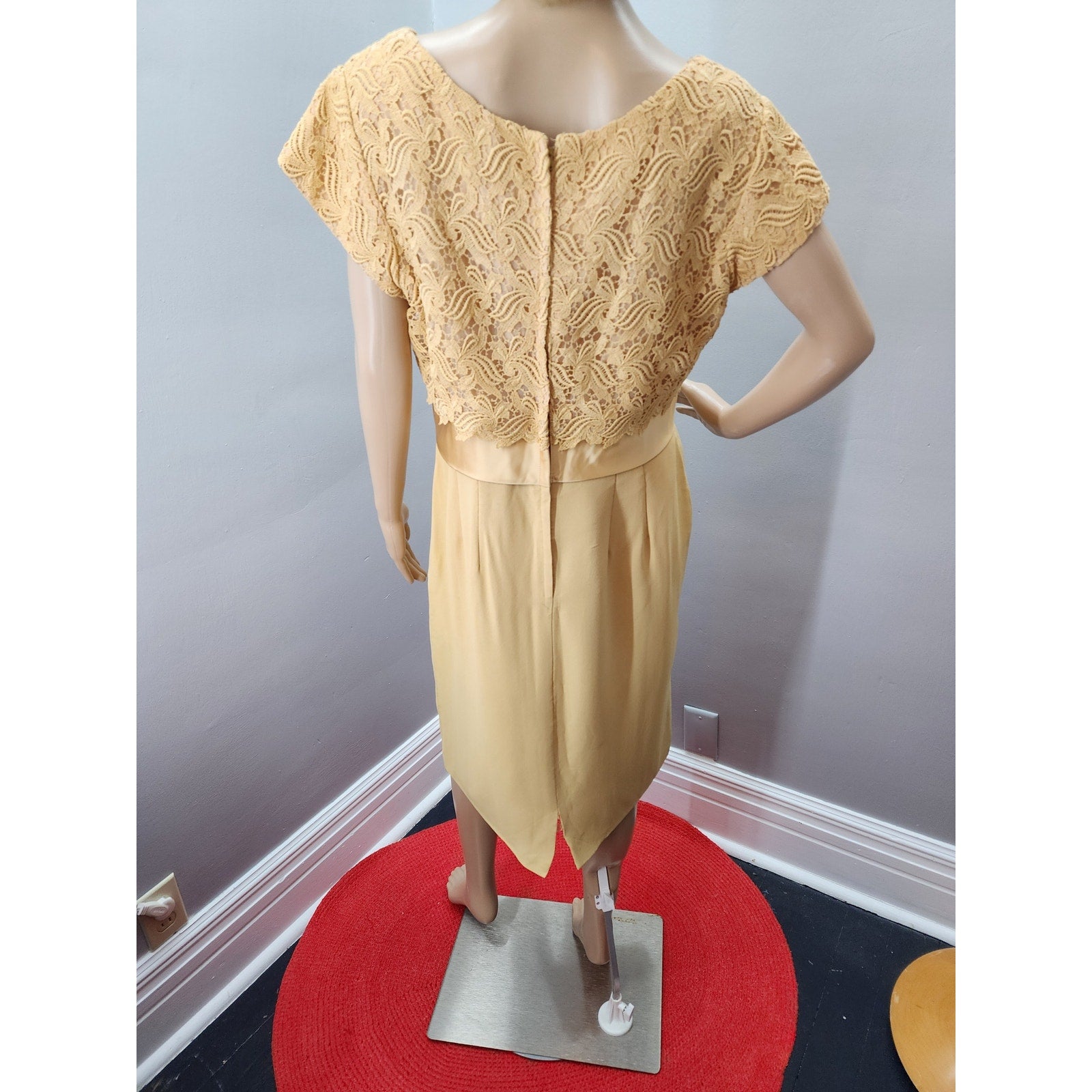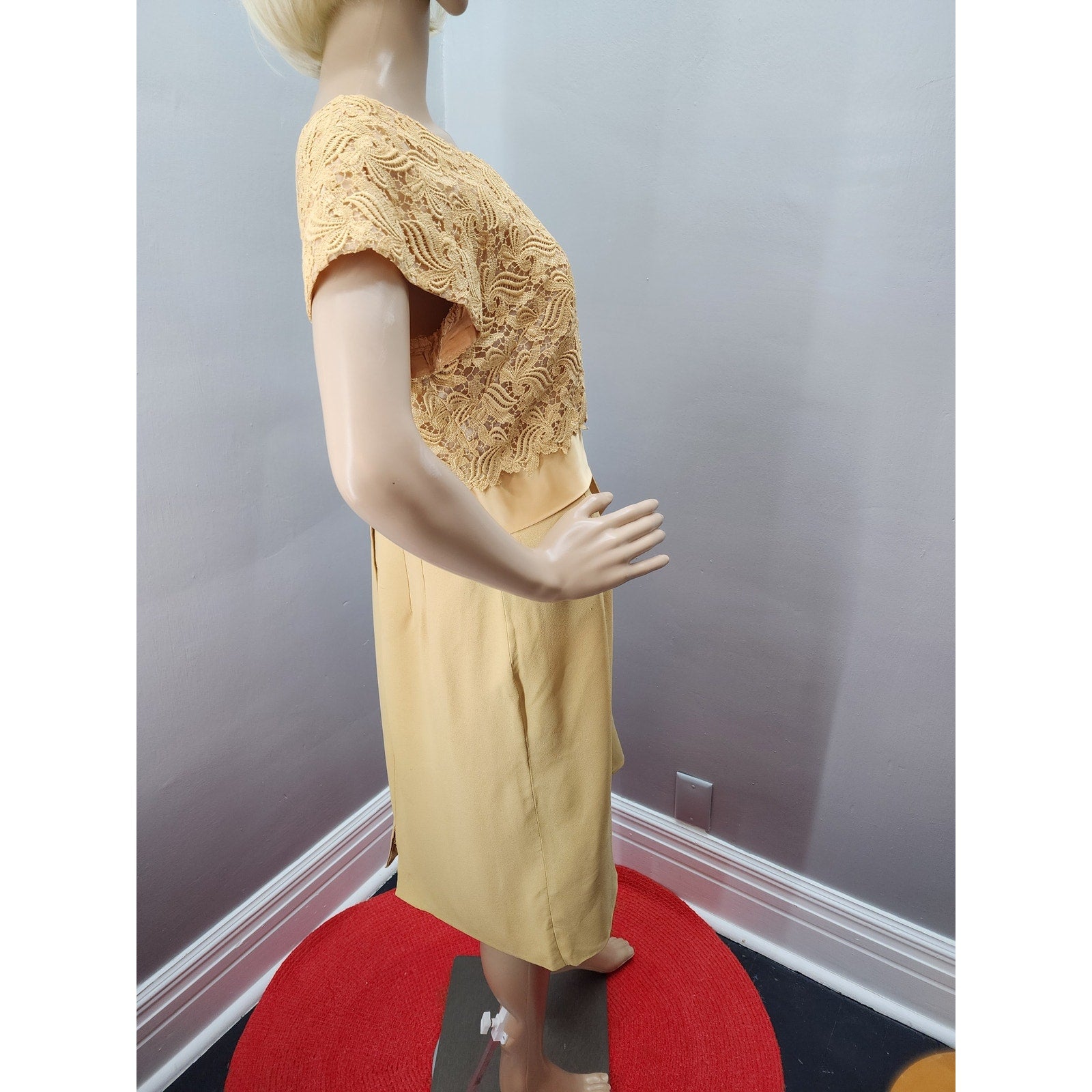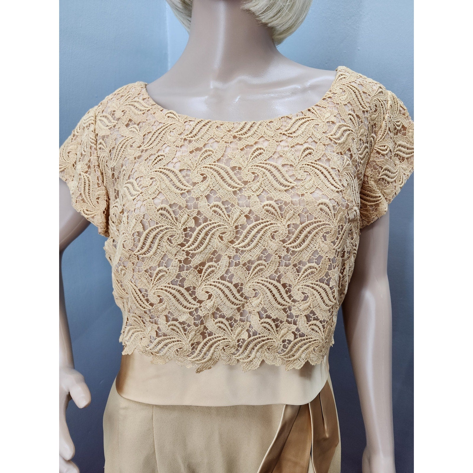 Gorgeous Renmor illusion dress in warm gold lace bodice, satin sash waist detail and I believe a rayon skirt.