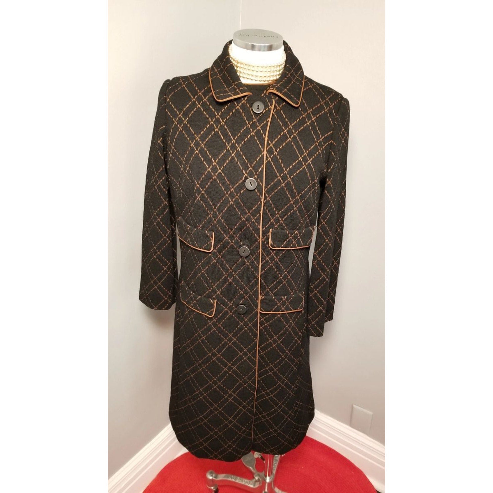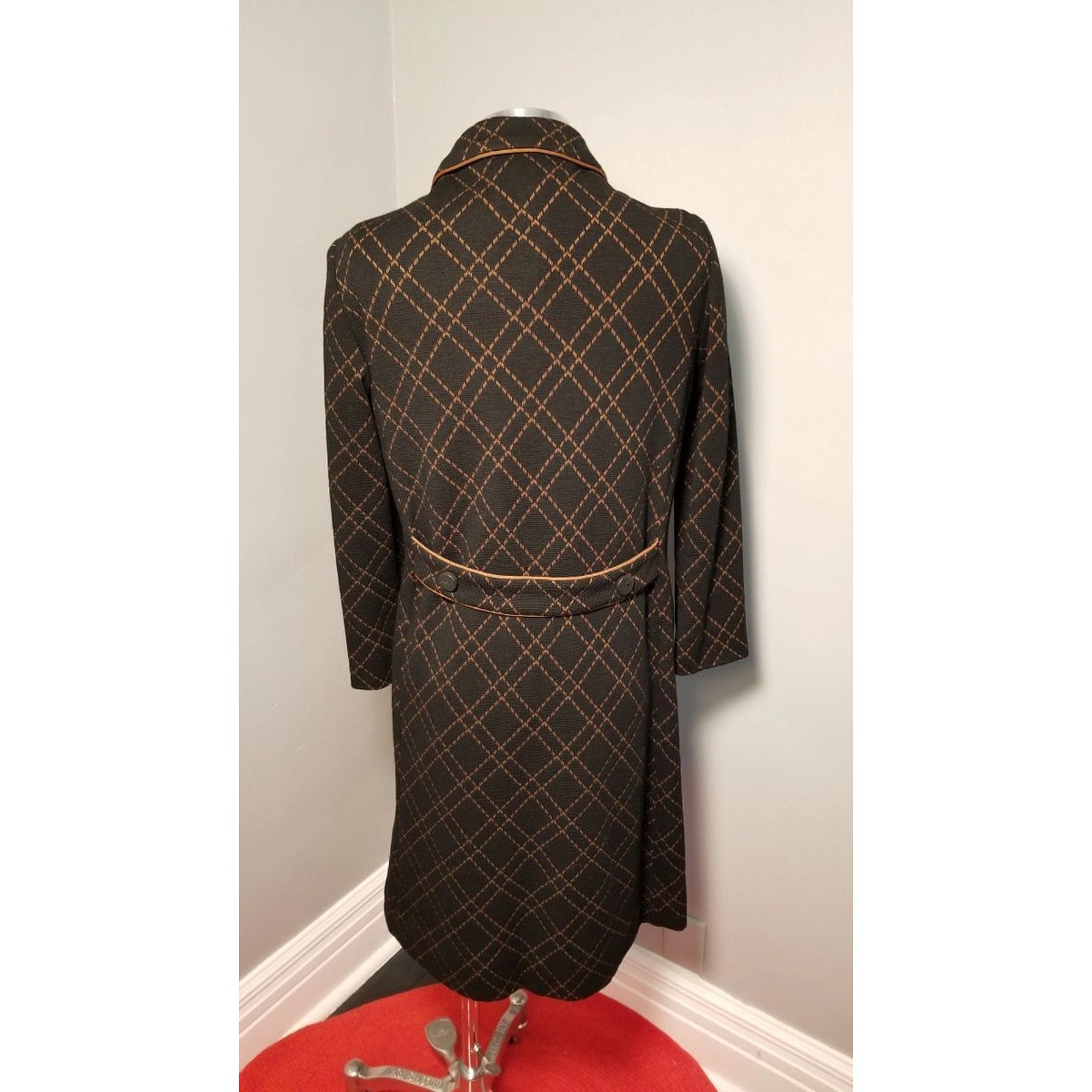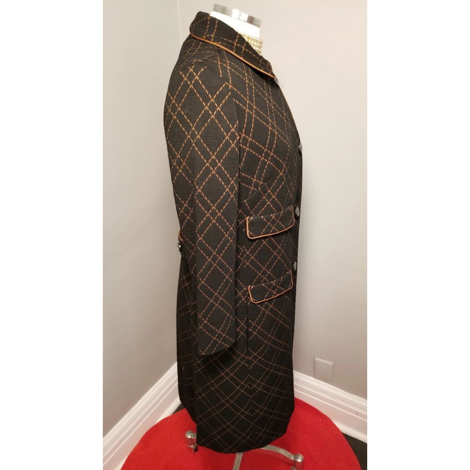 This vintage power suit consists of a long coat with two side slit pockets (flaps are faux pockets) and is fully lined.