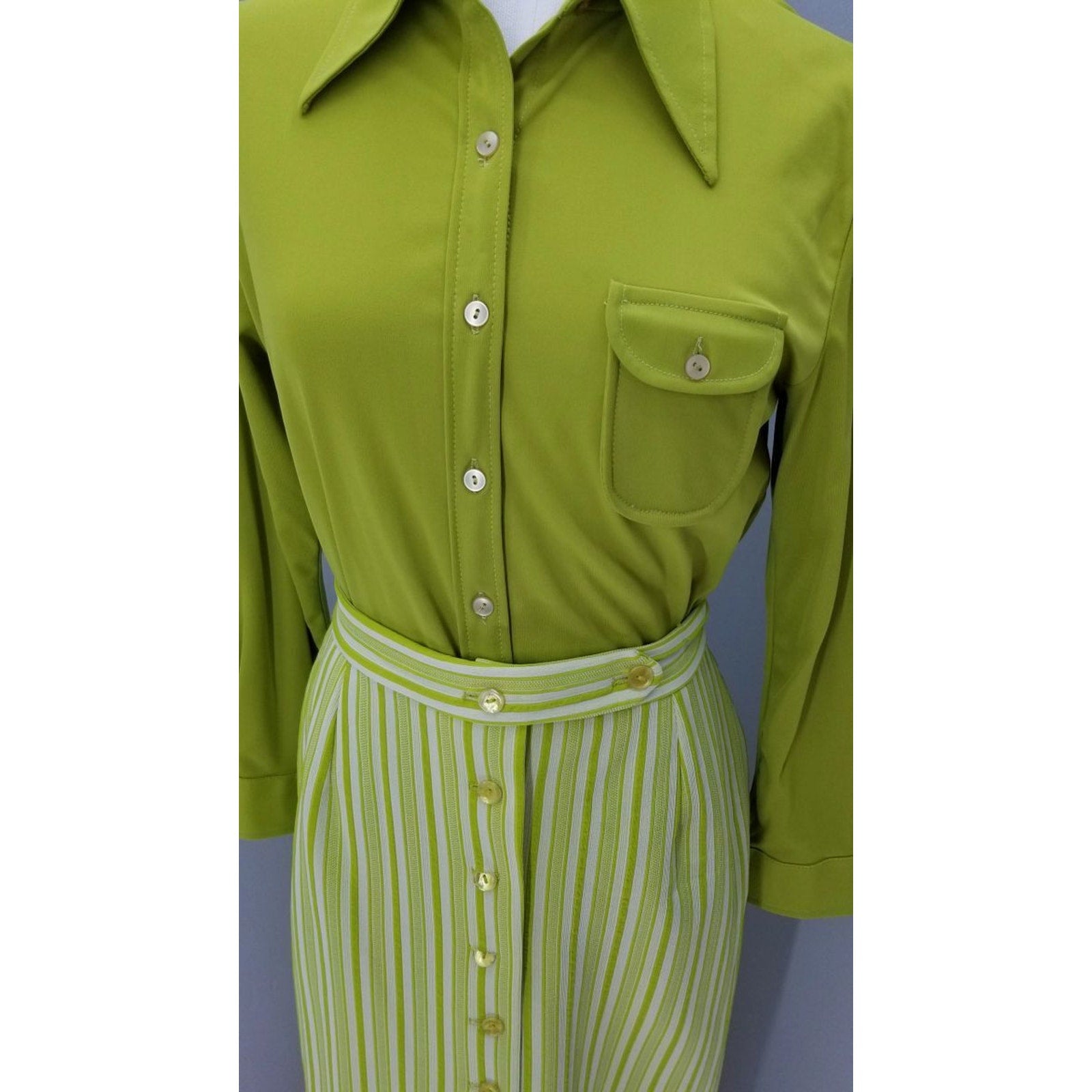 70s Vintage Dark Chartreuse Blouse and Maxi Skirt - M