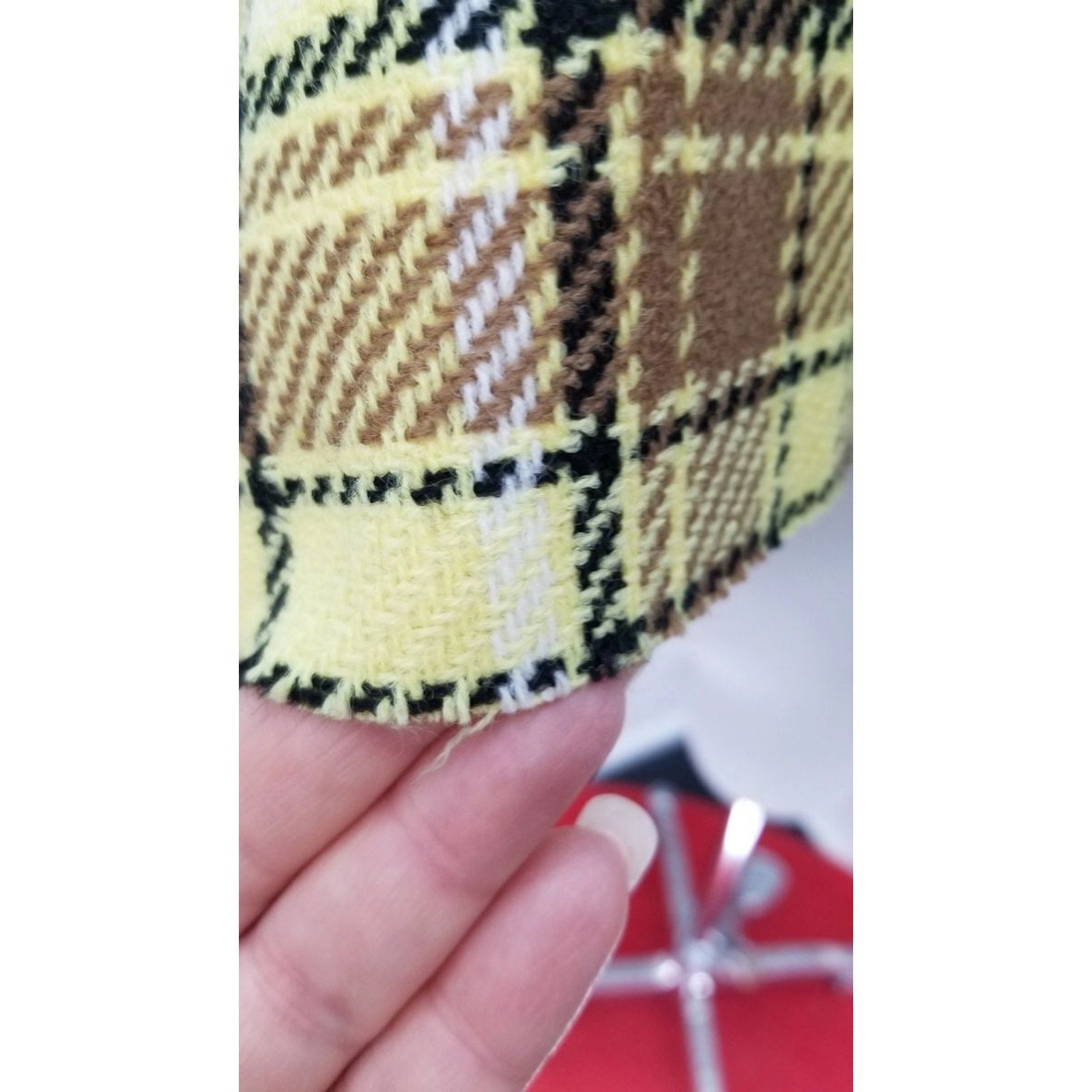 Super cute shift dress / jumper in yellow, tan and black plaid. Darted bustline and zipper back closure. Material appears to be polyester in a heavy weave. Nice early spring/ fall weight material.