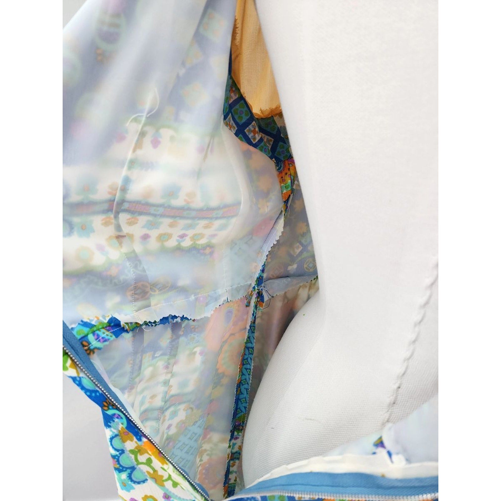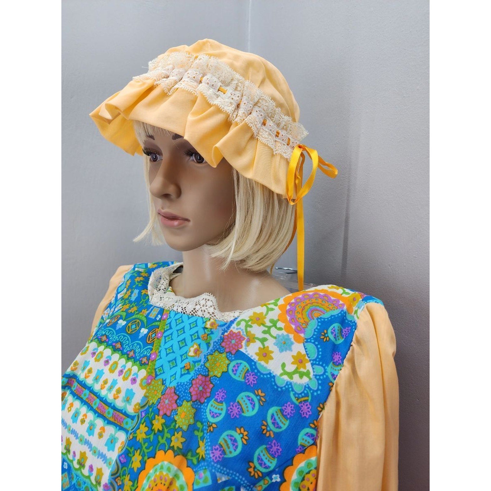 Square neckline, zipper back closure, fully lined, comes with a pinafore and cap bonnet. And LOOK at those sleeves! And the bow detail..... and lace trim.