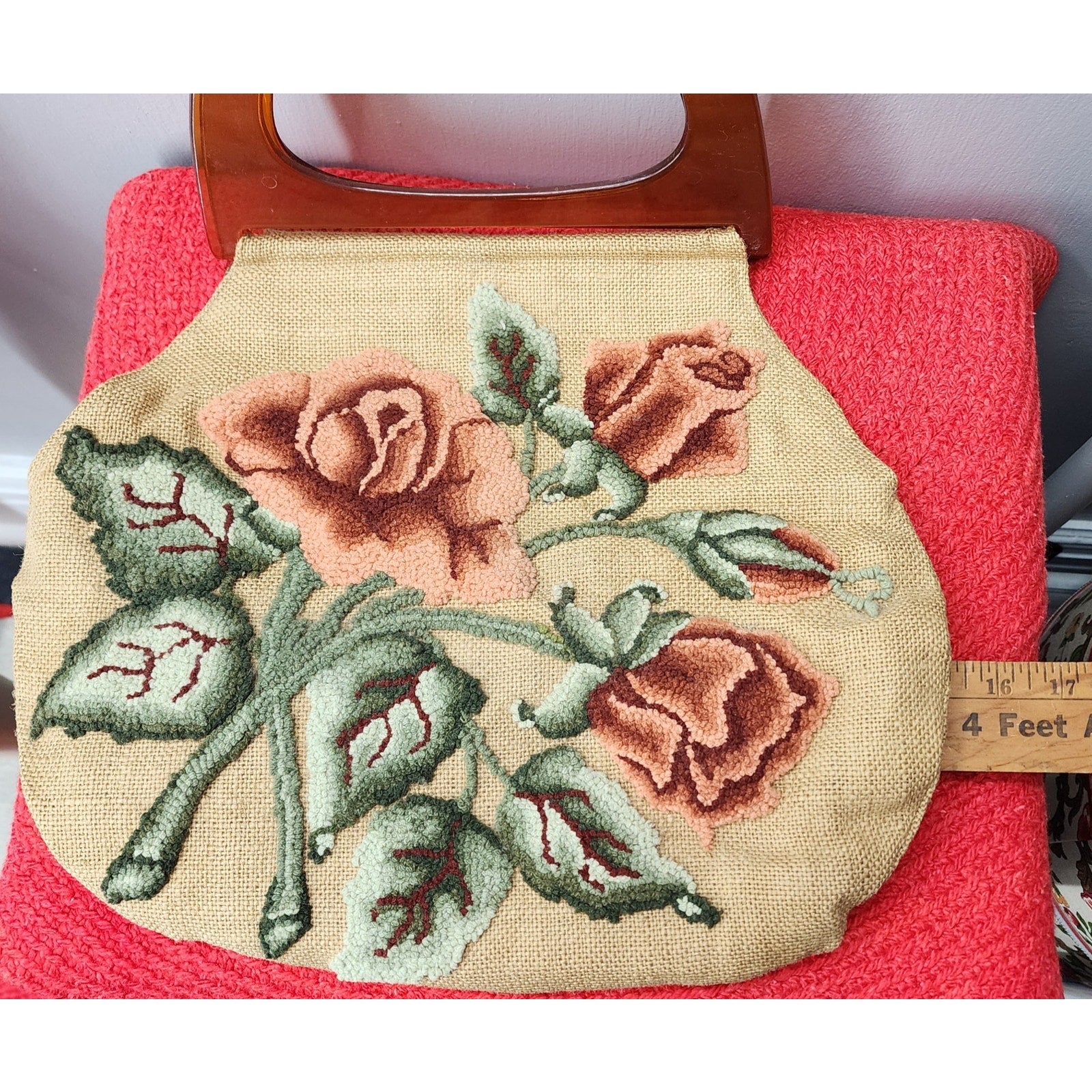 70s Vintage Handmade Sac Purse, Embroidery on Burlap, Large